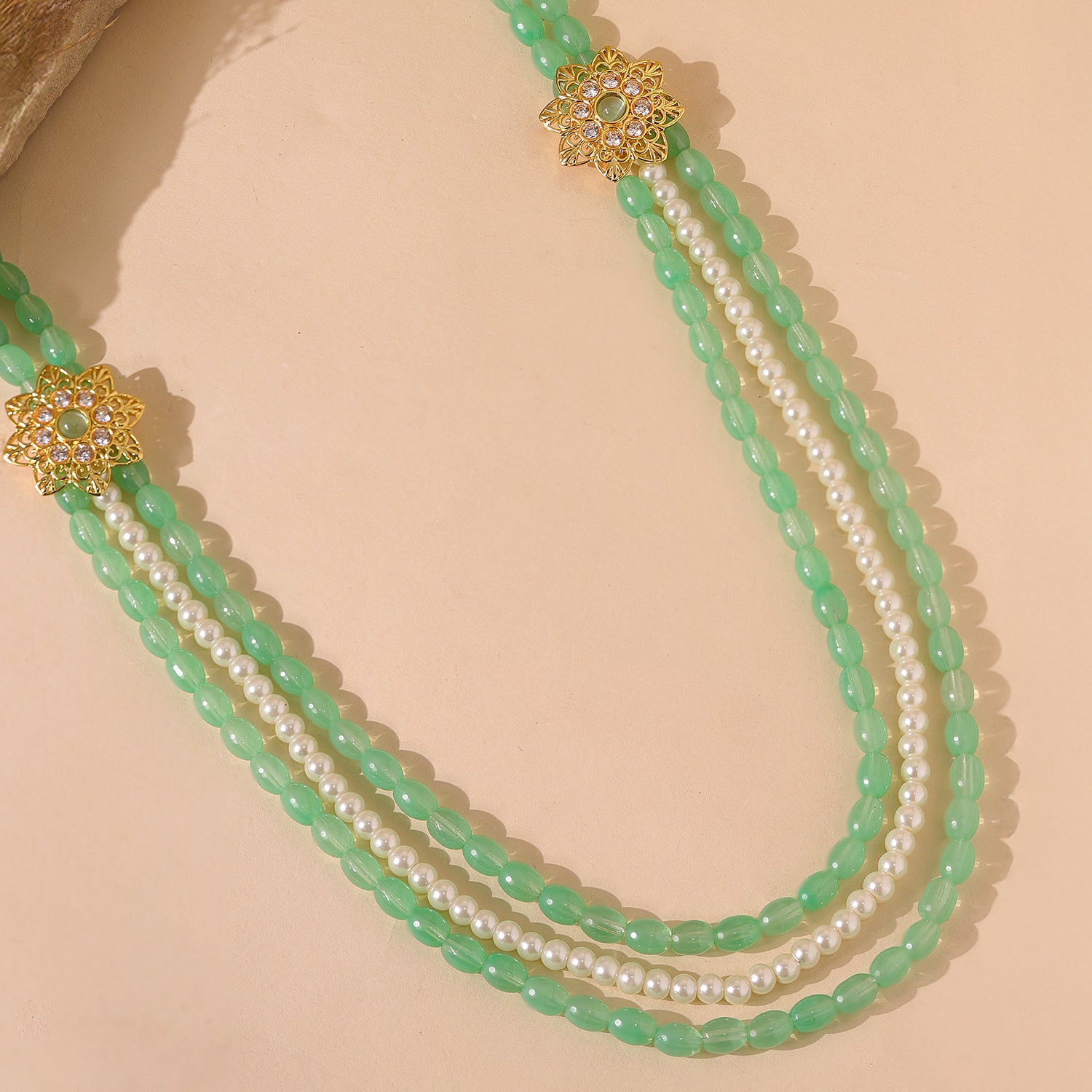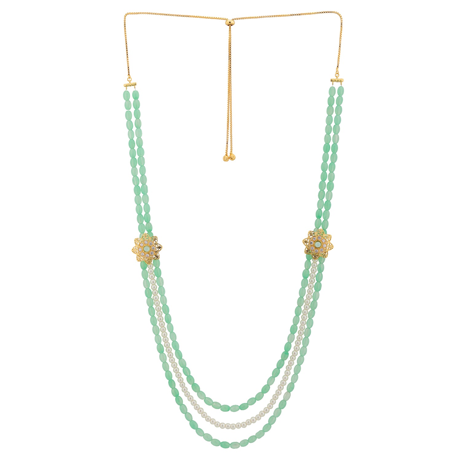 Rooted in the regal traditions of Rajasthan and inspired by the strength and grace of its legendary rulers, the Kings of Rajasthan Vajrasen Mala Necklace is a refined symbol of heritage and honor. Part of the iconic Queens of Rajasthan collection, this mala reflects the ceremonial necklaces worn by Rajput kings during royal assemblies, sacred rituals, and wedding celebrations. Designed for modern grooms who value timeless elegance, this piece blends heritage craftsmanship with effortless wearability. Crafted in premium brass and finished with rich yellow gold plating, the Vajrasen Mala features soothing green bead strands paired with delicate white pearls and ornate gold-toned floral connectors. The layered design adds depth and structure while maintaining a light, comfortable feel,perfect for long wedding ceremonies. The calming green tones symbolize prosperity and balance, while pearls represent purity and new beginnings, making this wedding necklace for men both meaningful and visually striking. Whether styled for the wedding day or gifted as a keepsake, this groom mala adds understated royal charm to sherwanis, bandhgalas, and traditional attire. Elegant yet versatile, it stands as a timeless piece of mens jewellery, ideal for grooms who prefer refined luxury rooted in tradition.