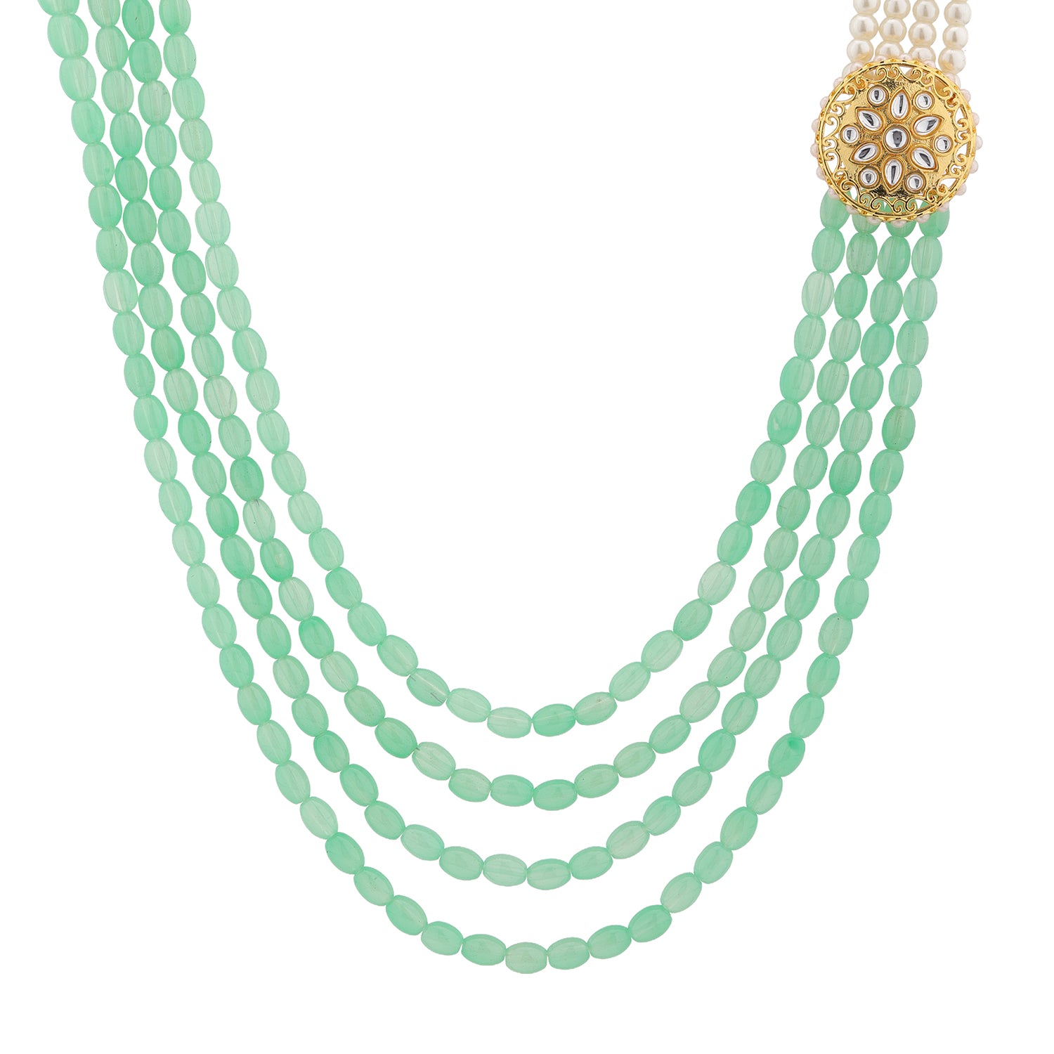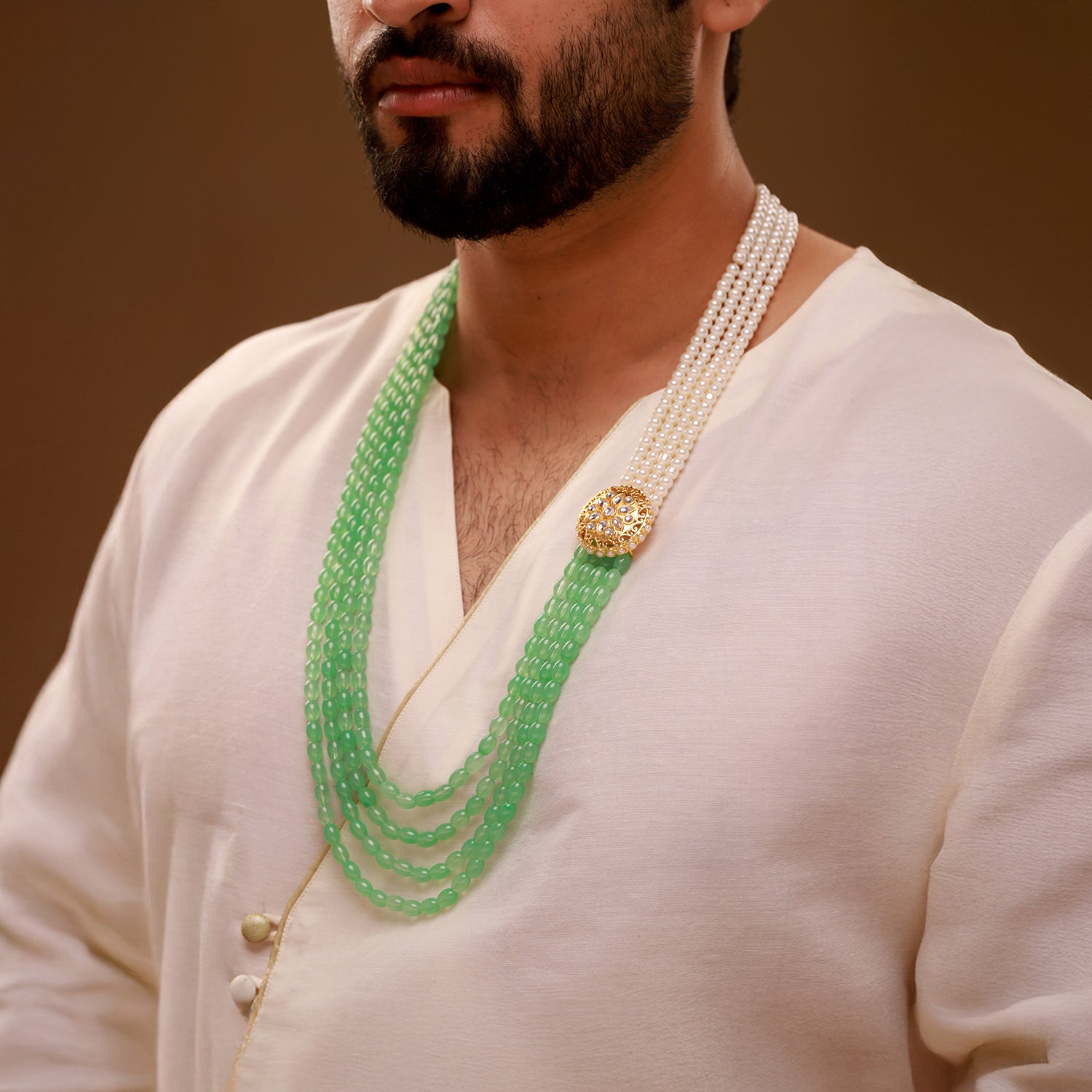Inspired by the strength, dignity, and quiet authority of Rajasthan’s legendary warriors, the Kings of Rajasthan Yoddharaj Mala Necklace is a refined expression of royal masculinity. Part of the iconic Queens of Rajasthan collection, this mala reflects the ceremonial necklaces worn by Rajput kings during sacred rituals, royal gatherings, and wedding celebrations - symbols of honor, lineage, and timeless grace. Crafted in premium brass and finished with rich yellow gold plating, the Yoddharaj Mala features multiple strands of soothing green beads paired with luminous white pearl detailing and an ornate gold-toned centerpiece. The soft green hues evoke prosperity and balance, while the layered silhouette creates a commanding yet elegant presence. Designed to be lightweight and comfortable, this necklace for men sits effortlessly through long wedding rituals without compromising on impact. Perfect for modern grooms who appreciate heritage with subtle sophistication, this groom mala pairs beautifully with ivory, beige, pastel, emerald, and gold sherwanis. Whether worn on the wedding day or gifted as a meaningful keepsake, the Yoddharaj Mala stands as a symbol of strength, tradition, and royal legacy, making it an exceptional gift for groom and a timeless piece of mens jewellery.