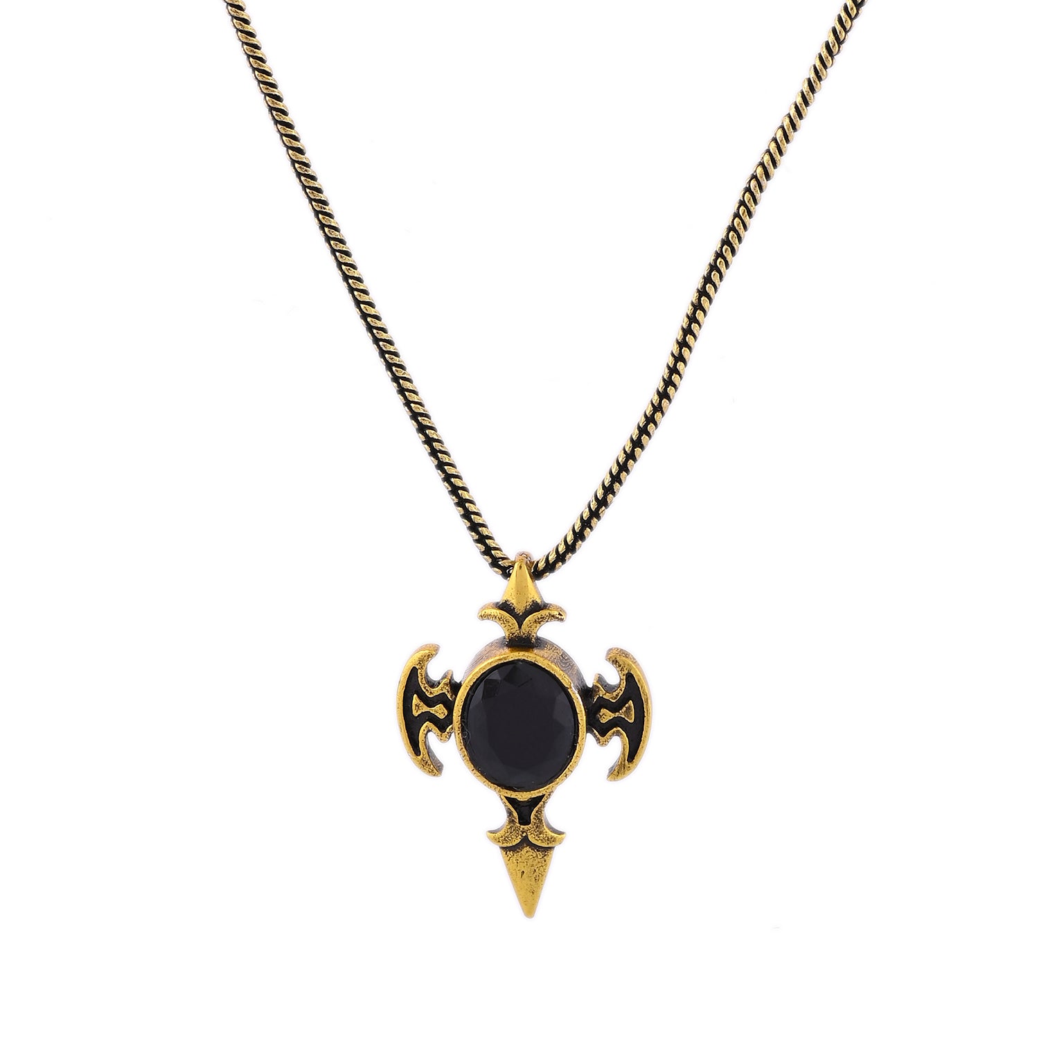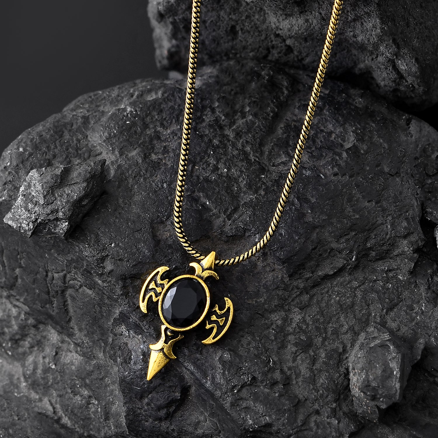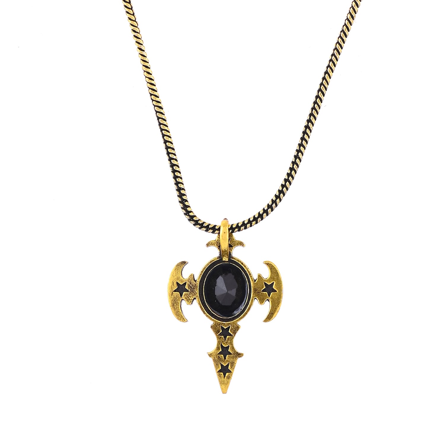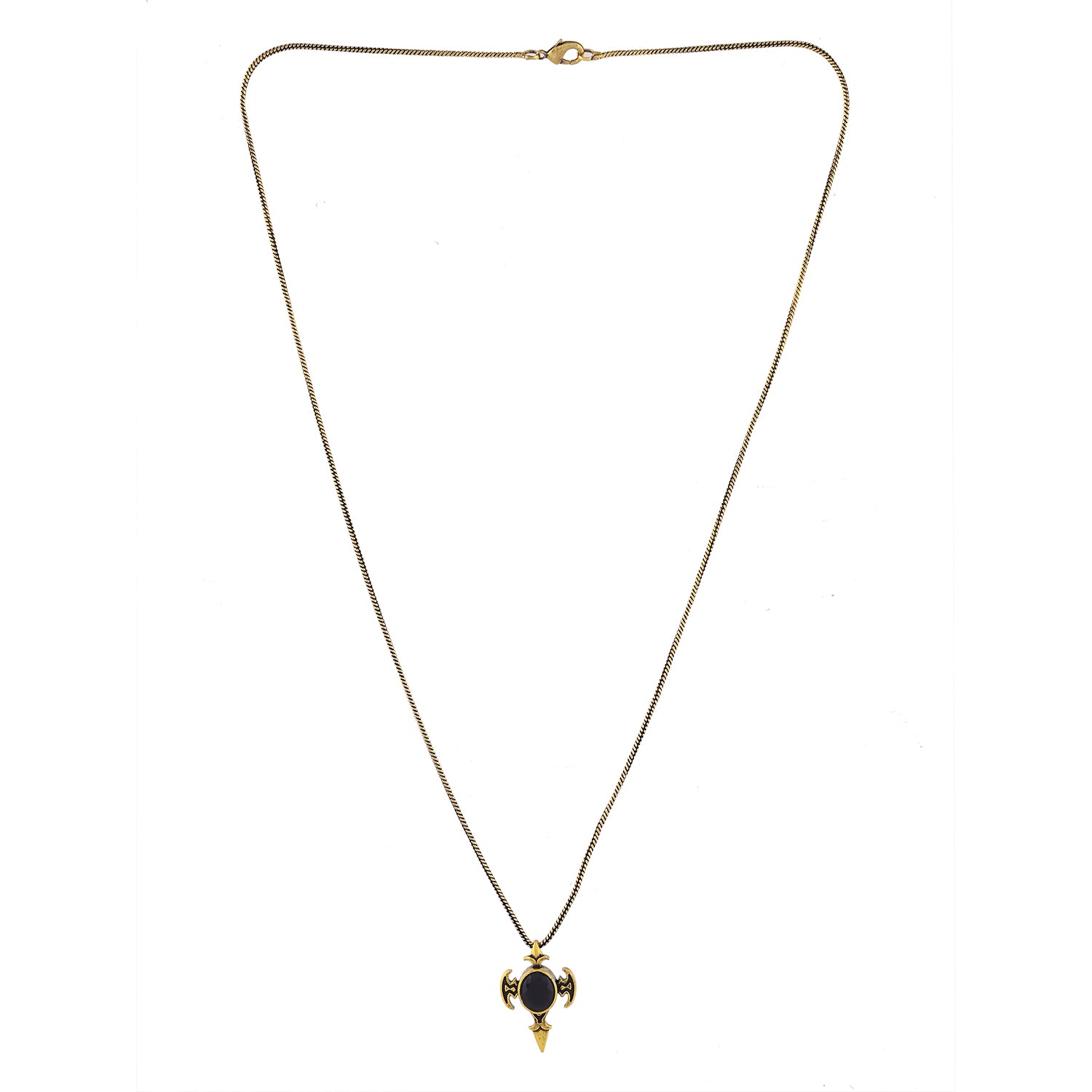 The Statement Obsidian Wing Gold Oxidised Men’s Pendant from the Statement Collection is a bold fusion of elegance, mystery, and masculine energy. Expertly crafted from premium-quality brass and finished in an antique gold oxidised plating, this fashion pendant features a striking design with winged details surrounding a deep black gemstone centerpiece. The contrasting gold and black combination gives it a powerful aura of sophistication and strength, making it an iconic stylish pendant for men who command attention wherever they go. This pendant for men captures the essence of confidence and individuality, perfect for pairing with any outfit, from sharp formal looks to casual streetwear. The intricate design and oxidised finish add an edgy, vintage charm, while the gemstone brings depth and personality. Whether you’re expressing bold fashion or gifting meaningfully, this chain pendant for men adds an instant touch of class and character to your neck jewellery collection.