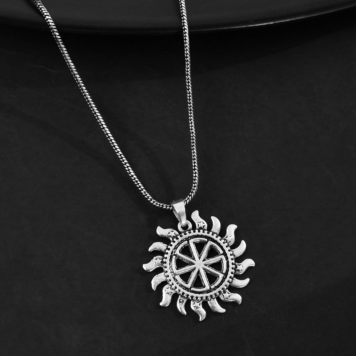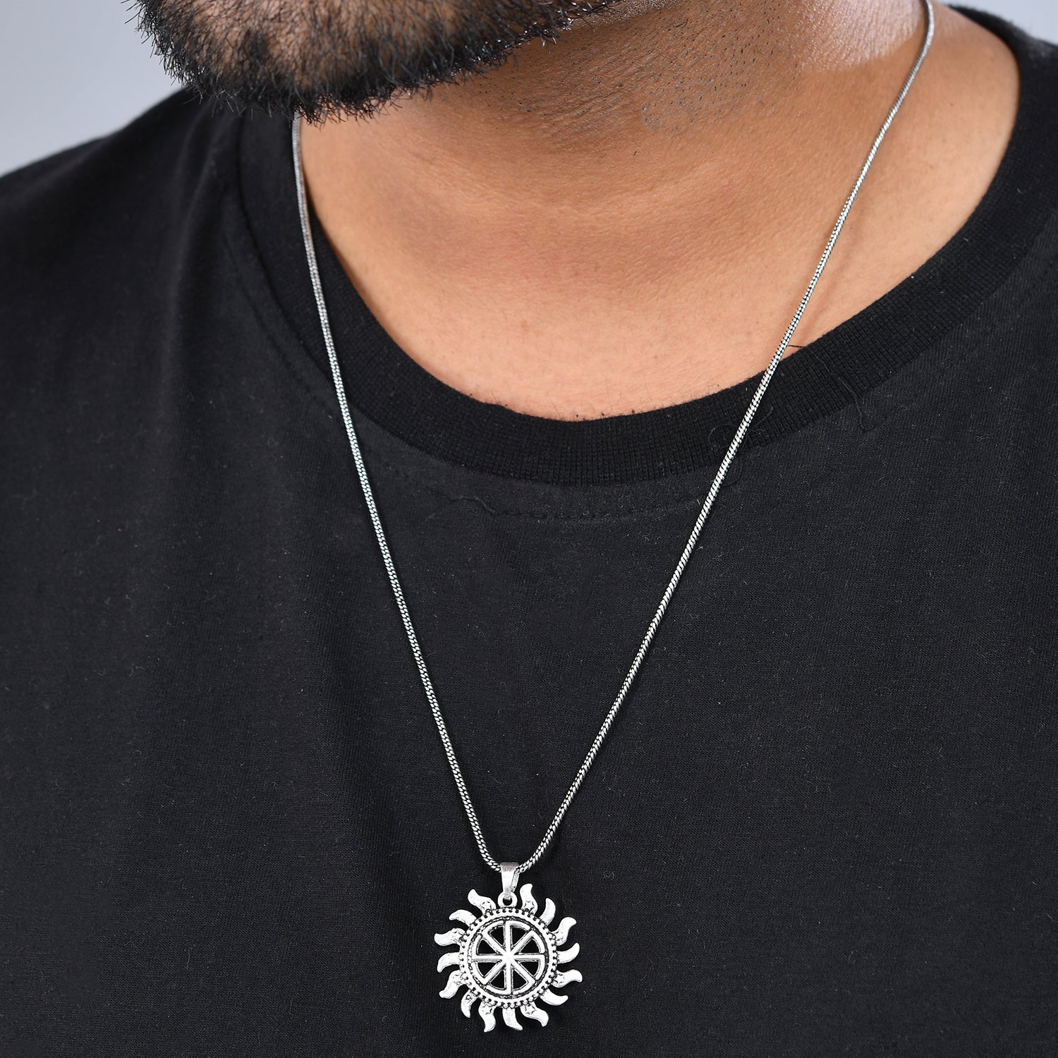 The Statement Solar Wheel Silver Oxidised Men’s Pendant from the Statement Collection is a bold representation of strength, energy, and timeless craftsmanship. Designed from premium brass and finished with elegant silver oxidised plating, this fashion pendant features a radiant sun wheel pattern that symbolizes vitality, renewal, and the continuous cycle of life. Its detailed flame-like edges and circular symmetry bring a unique blend of power and artistry, making it an iconic stylish pendant for today’s modern man. Perfectly combining heritage-inspired design with a rugged, contemporary finish, this pendant for men complements both casual and statement looks. The antique silver tone enhances every carved detail, while its versatile style makes it suitable for daily wear or special occasions. Whether worn solo as a chain pendant for men or gifted as a symbol of inspiration, it’s a powerful and meaningful addition to any neck jewellery collection.