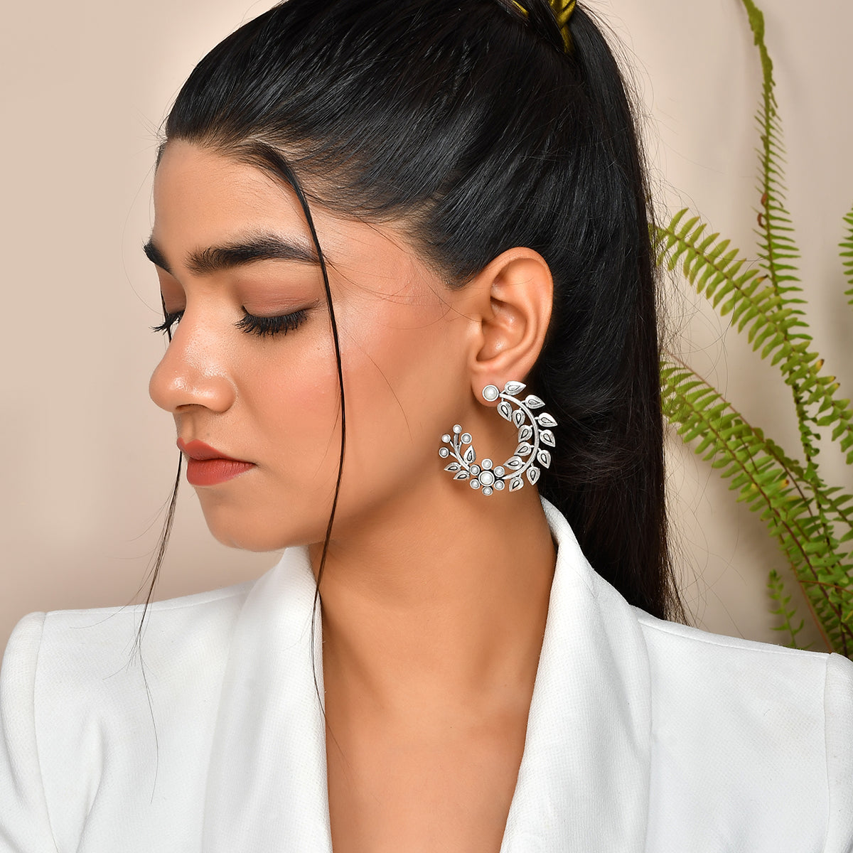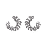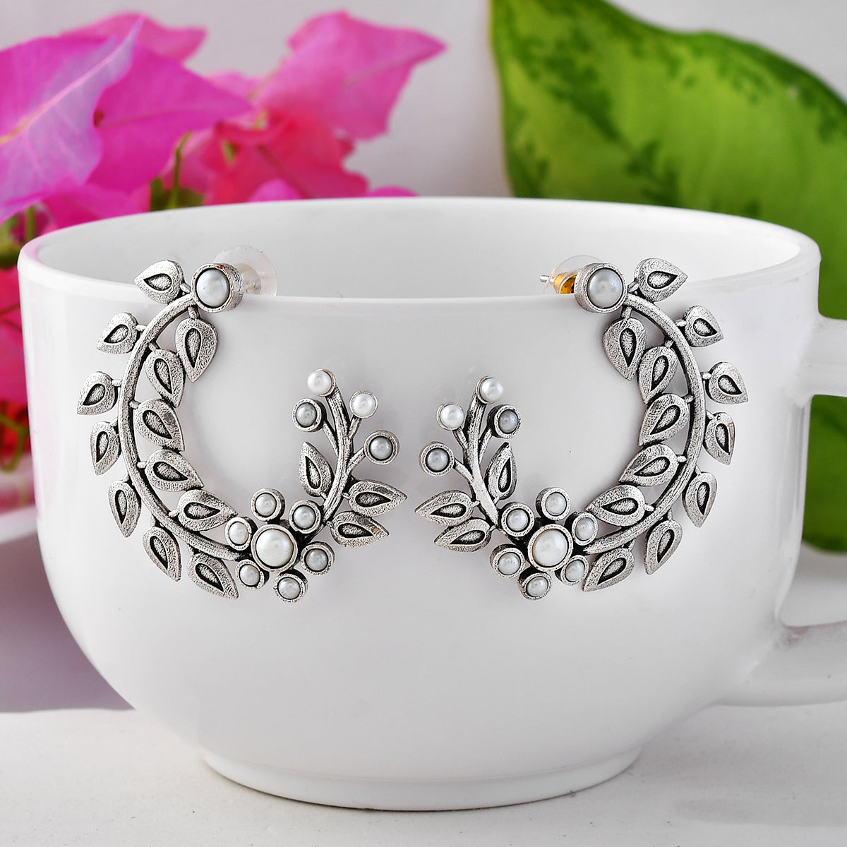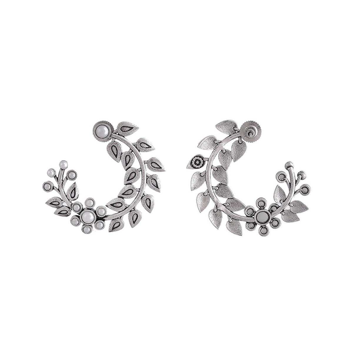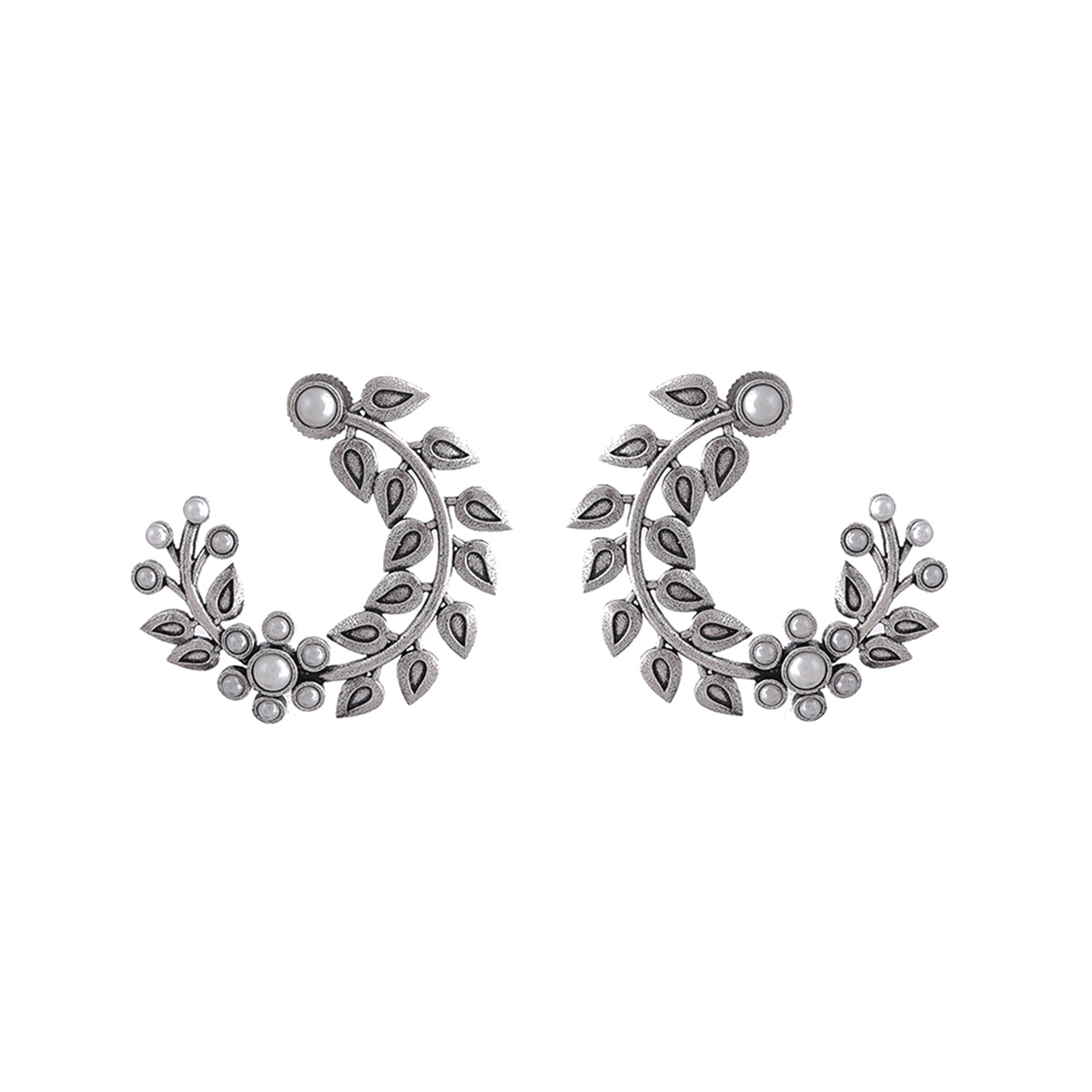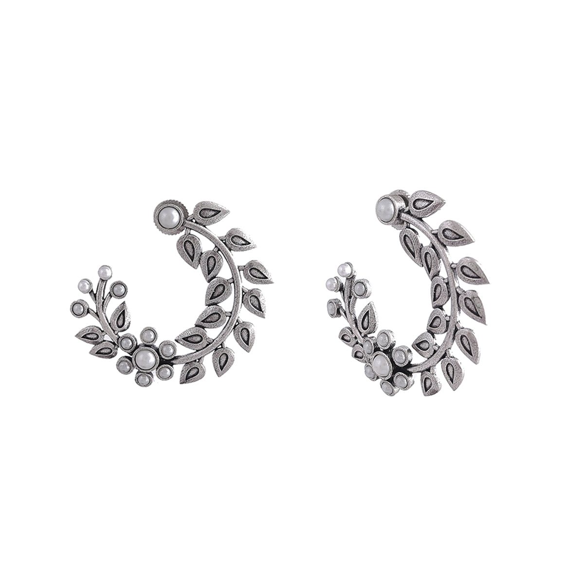 Half-hoop design brass earrings with oxidized silver plating, inspired by the beautiful fern leaf. White pearls in a lovely floral pattern adorn the oxidized silver plated pair, which promises to be a comfortable wear at all times.