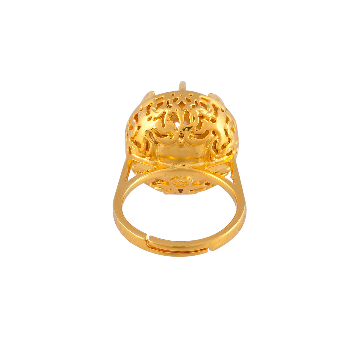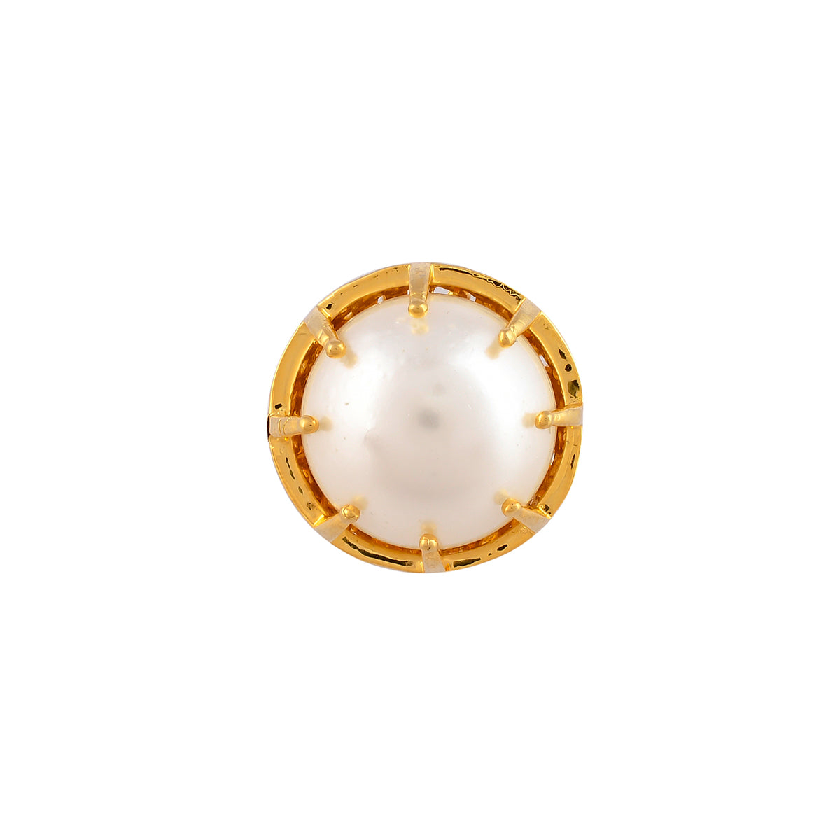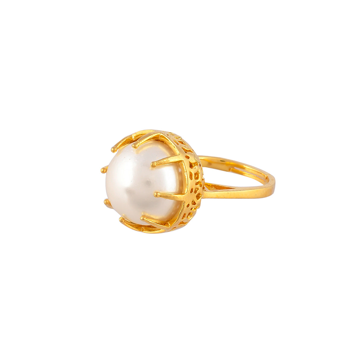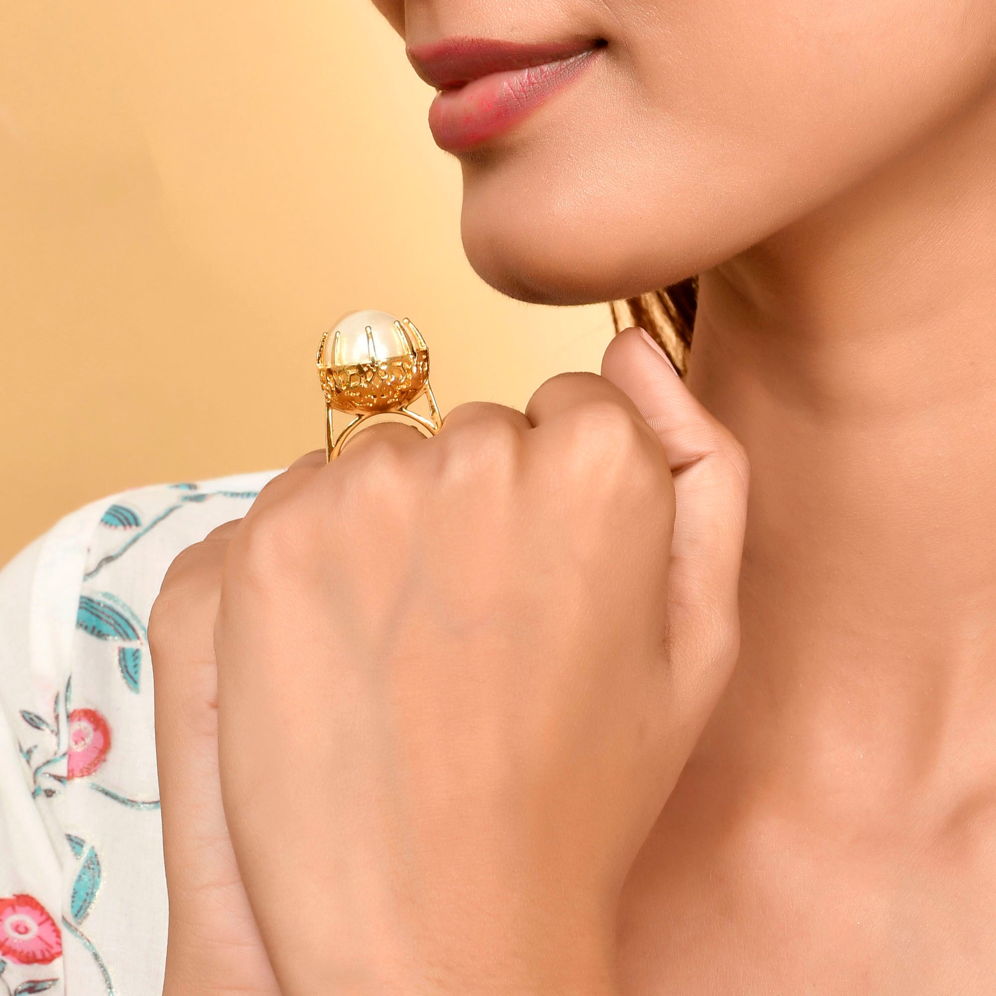 Adorned with a single white shell pearl and designed as a tribute to lovely and intricate Arabesque design patterns, this cocktail ring has been fashioned out of brass. Yellow gold plating adds to the charm of this dainty piece, which will compliment all your favorite looks and outfits.