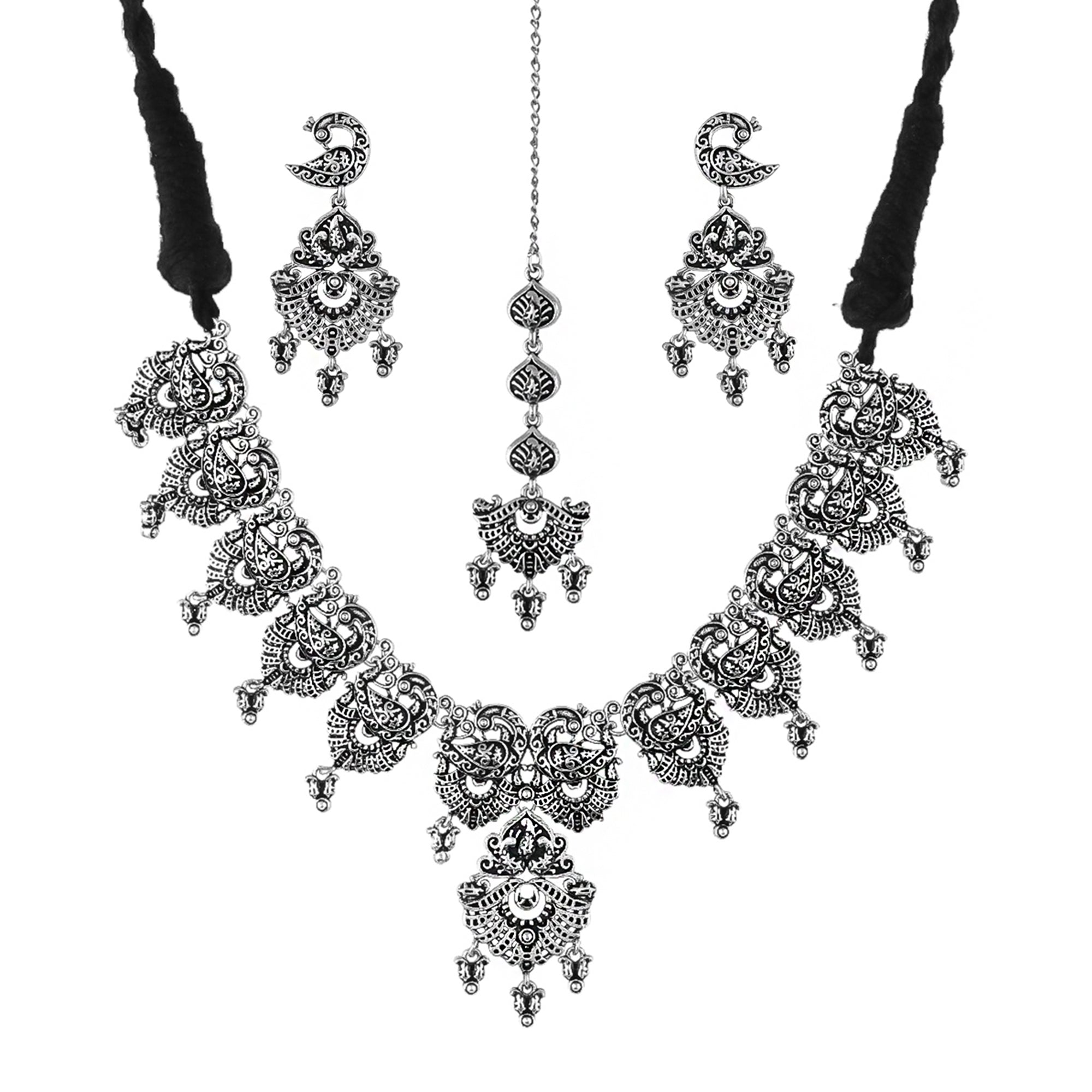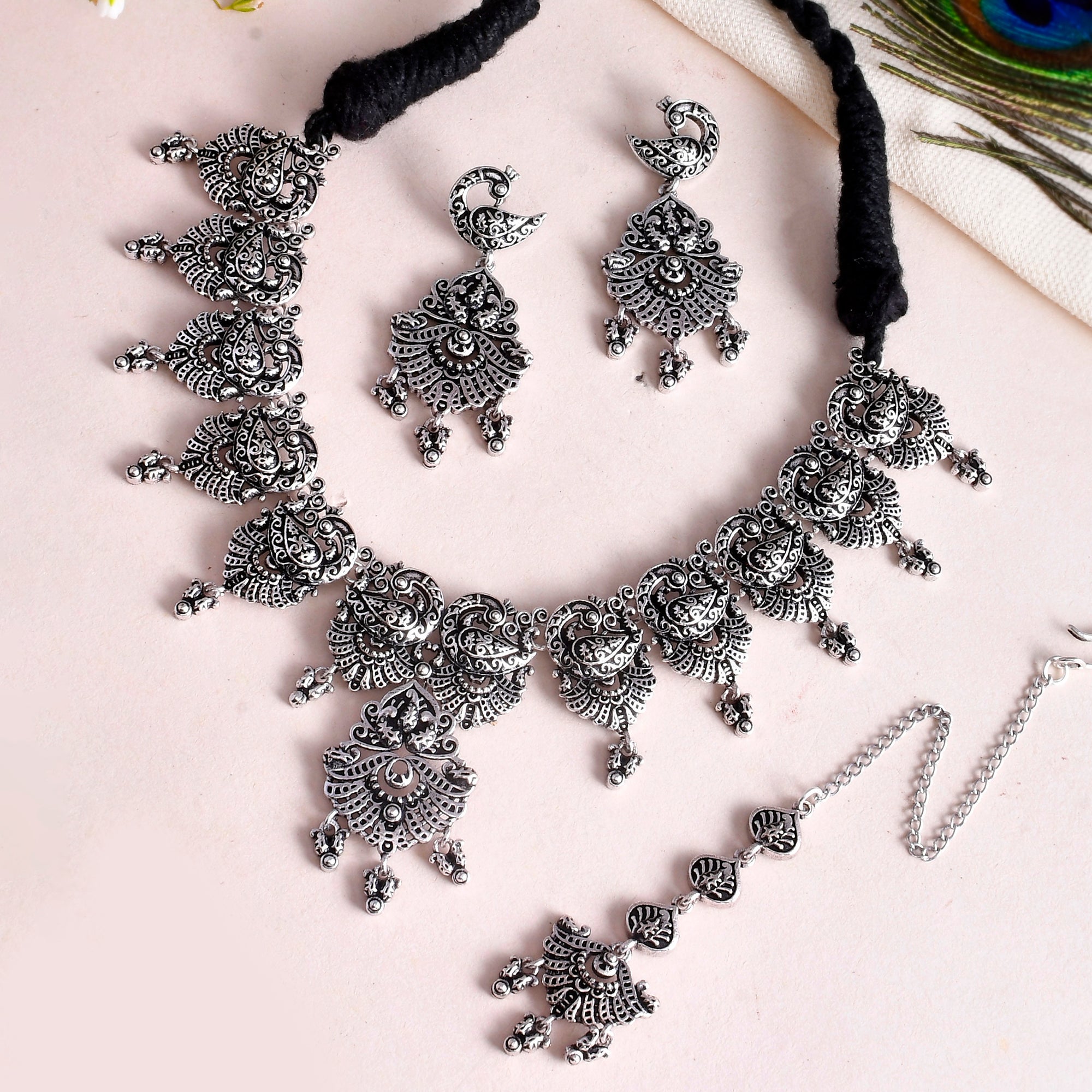 This collection is inspired by Gond art, showcasing the beauty of nature through the elements of peacocks, flowers, and leaves beautifully woven into stunning oxidized jewelry pieces.