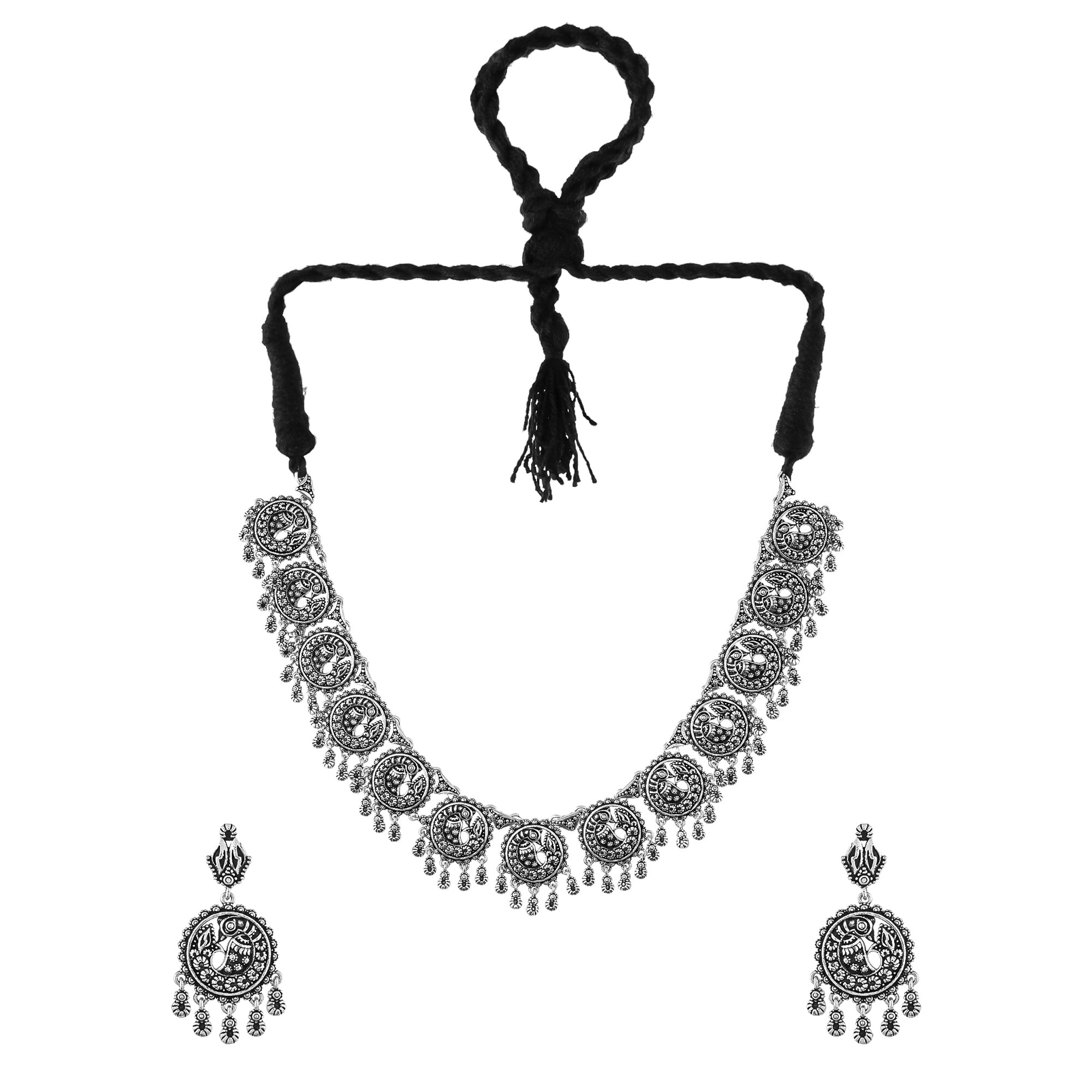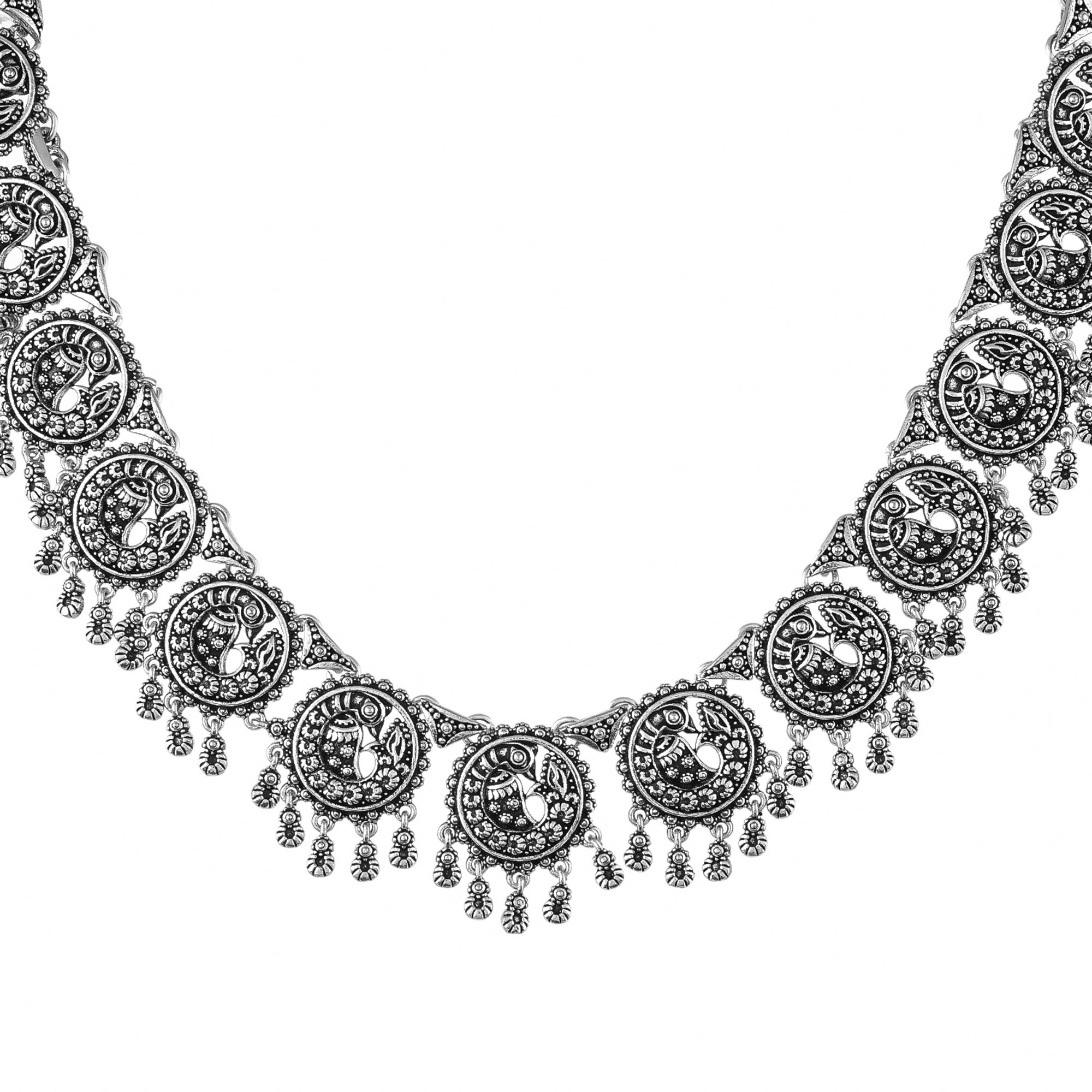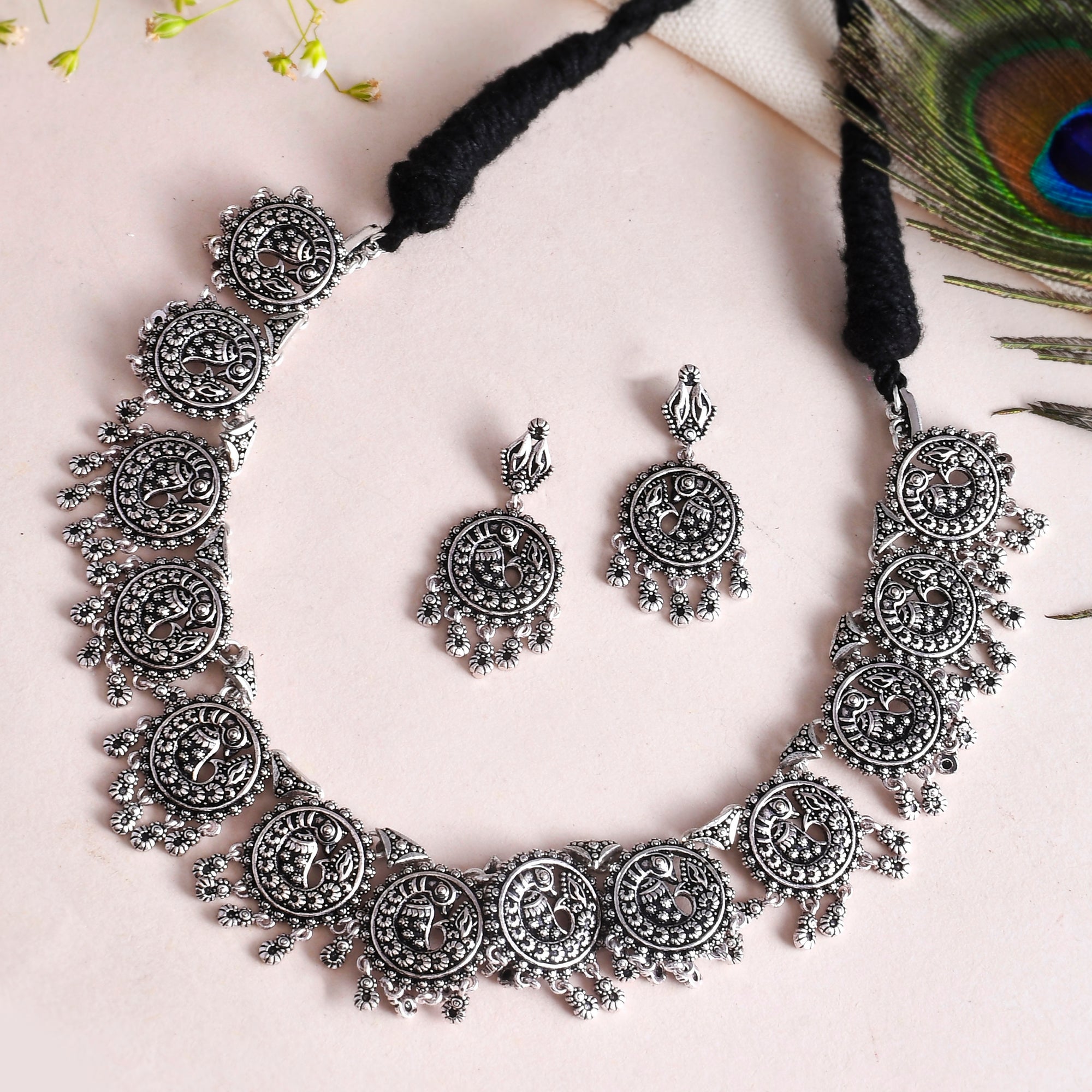 This collection is inspired by Gond art, showcasing the beauty of nature through the elements of peacocks, flowers, and leaves beautifully woven into stunning oxidized jewelry pieces.