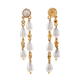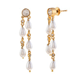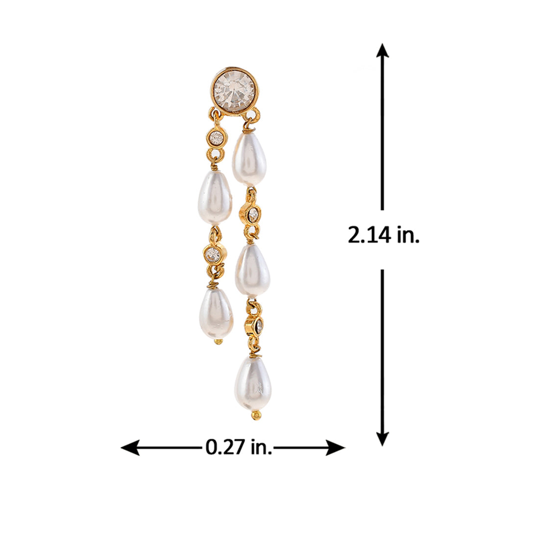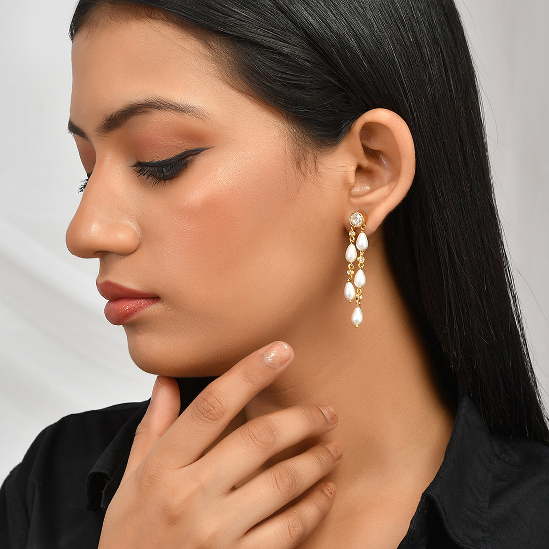 These elegant Two Strings Dangler Pearl Drop Earrings are perfect for gifting on Mother's Day. The earrings are made of high-quality brass with a yellow gold plating and feature two strings of lustrous half pearls that dangle gracefully. The CZ studded hooks add a touch of sparkle to these beautiful earrings. The earrings are lightweight and comfortable to wear for extended periods, making them perfect for any occasion.