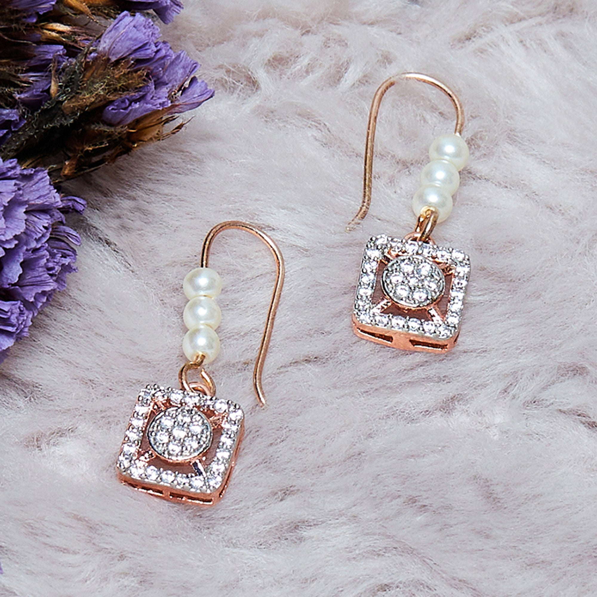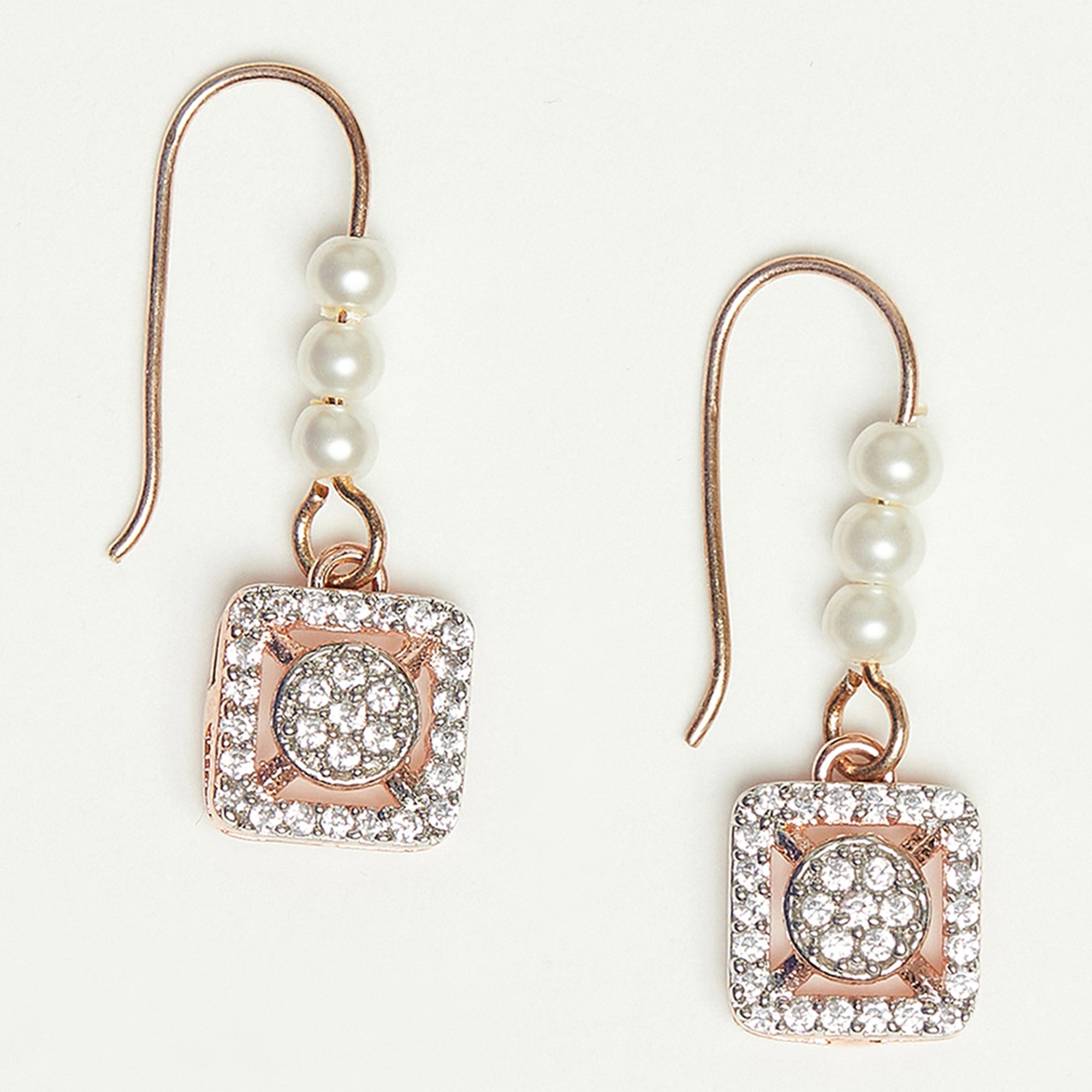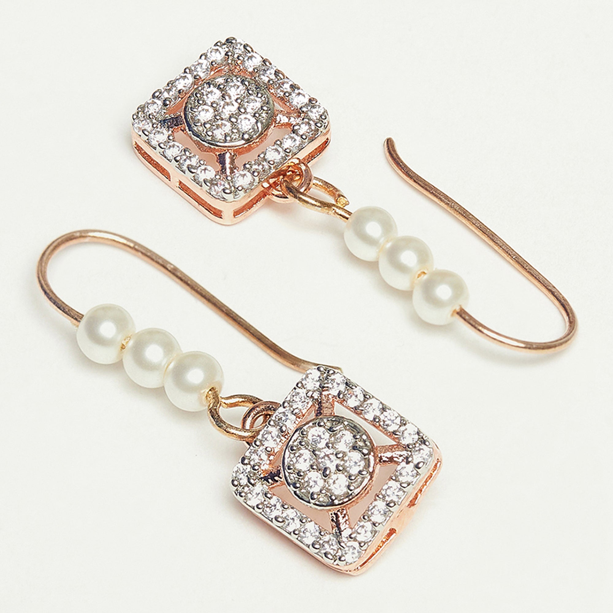 Drop style rose gold plated brass earrings. Embellished with faux pearls and gems. Wear with a cocktail dress.