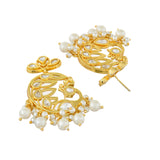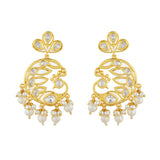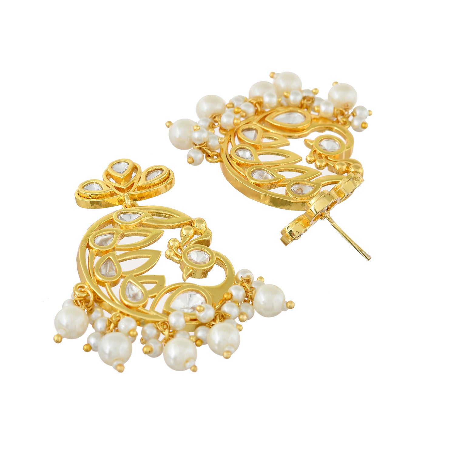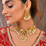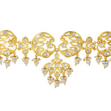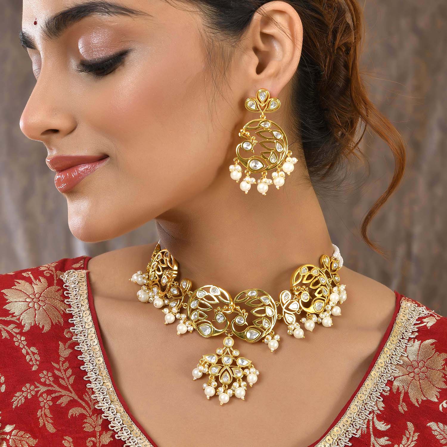 The Voylla Kashni Necklace Set from the Panchhi collection is an exquisite piece crafted from high-quality brass and plated with gold, offering a touch of opulence. This American Diamond Kundan gold necklace set for women features intricate designs inspired by the elegance of nature's most majestic birds, symbolizing love and grace. The necklace adorned with pearl-like beads and matching earrings enhances its timeless beauty, making it ideal for festive occasions, weddings, parties, and even cocktail events. The gold and white color combination adds sophistication, ensuring versatility in styling with various outfits. This stone necklace set is a perfect women's gift for occasions like Valentine's Day, Diwali, Rakshabandhan, Christmas, and New Year. It is a thoughtful present for sisters, girlfriends, wives, mothers, and lovers, adding a touch of elegance to their jewelry collection. With its blend of tradition and contemporary style, this set is a standout piece for any woman's trousseau.