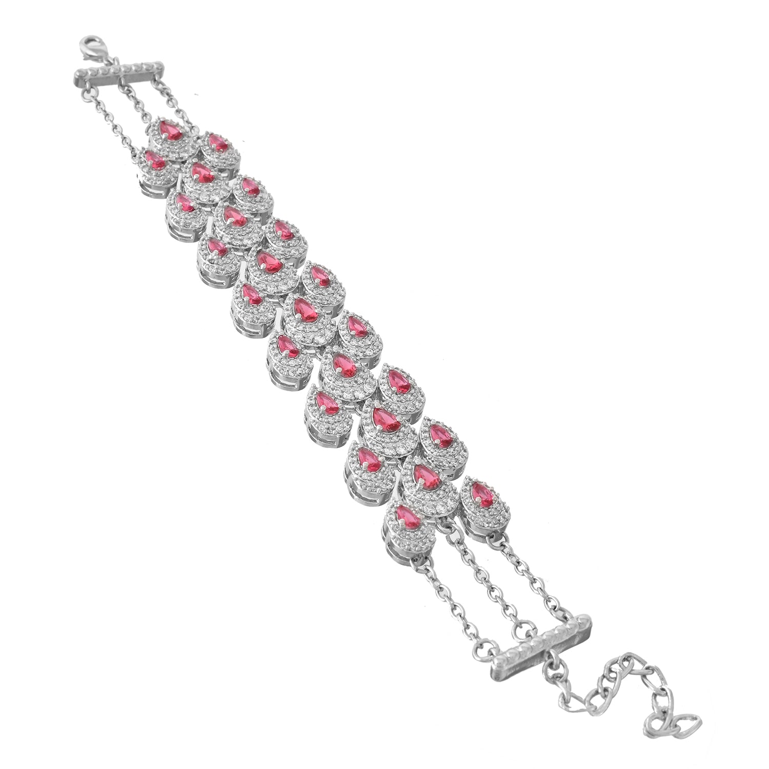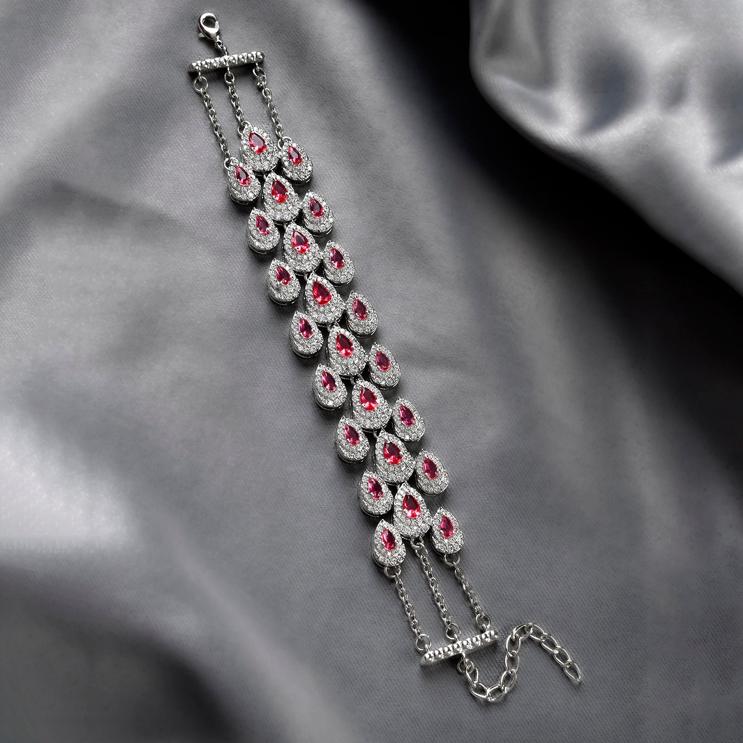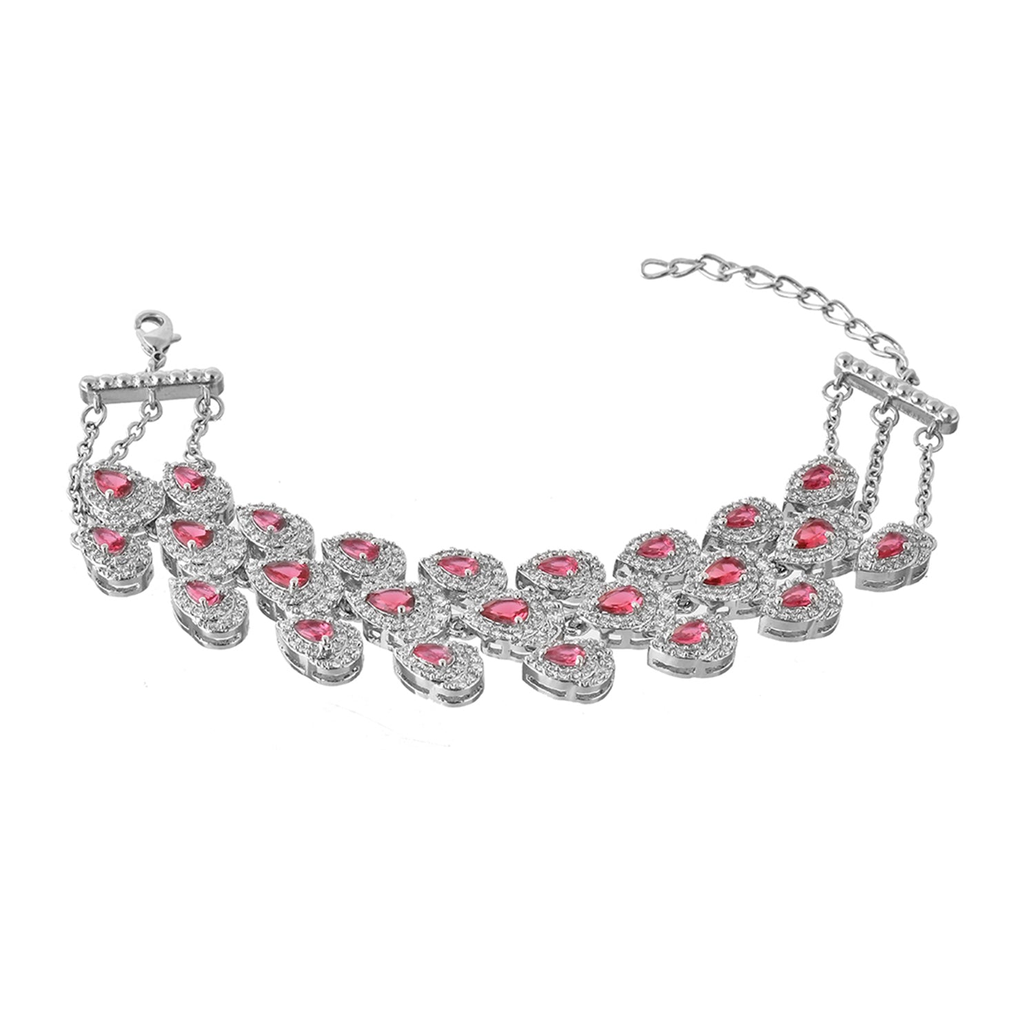 The Royal Romance Blossom Statement Bracelet is an exquisite piece of jewelry, crafted from high-quality brass and plated with luxurious white rhodium. Adorned with vibrant red stones, each teardrop setting is surrounded by sparkling American diamonds, creating a dazzling effect. Part of Voylla's Royal Romance Collection, this bracelet is a testament to timeless elegance and opulent craftsmanship. Perfect for weddings, festive occasions, and special events, it adds a regal touch to any outfit. Whether you're styling it with traditional attire or contemporary ensembles, this versatile bracelet makes a chic statement. Ideal for gifting, it’s a thoughtful present for women on Valentine's Day, Diwali, Raksha Bandhan, Christmas, and more. The intricate design and premium materials ensure durability and a sophisticated look, making it a must-have accessory in any jewelry collection.