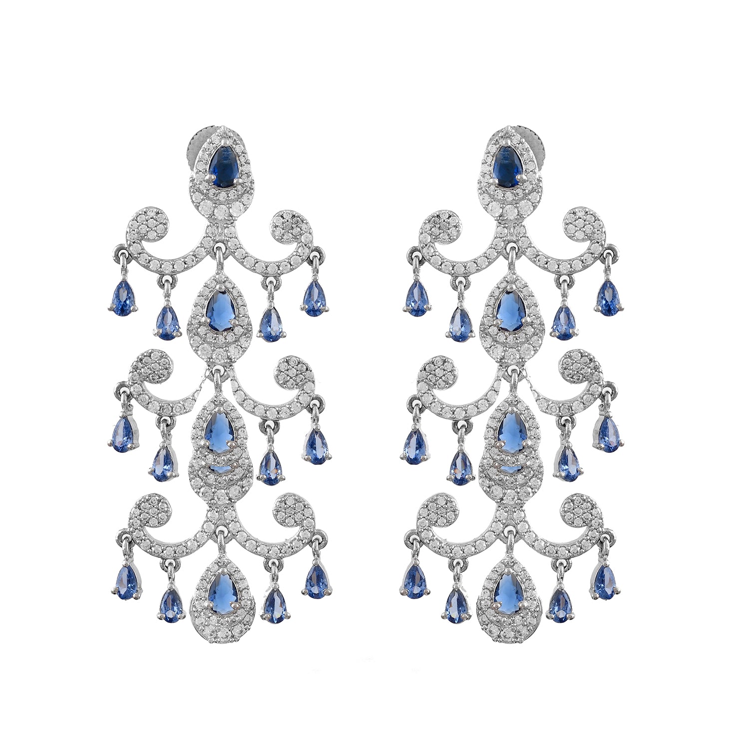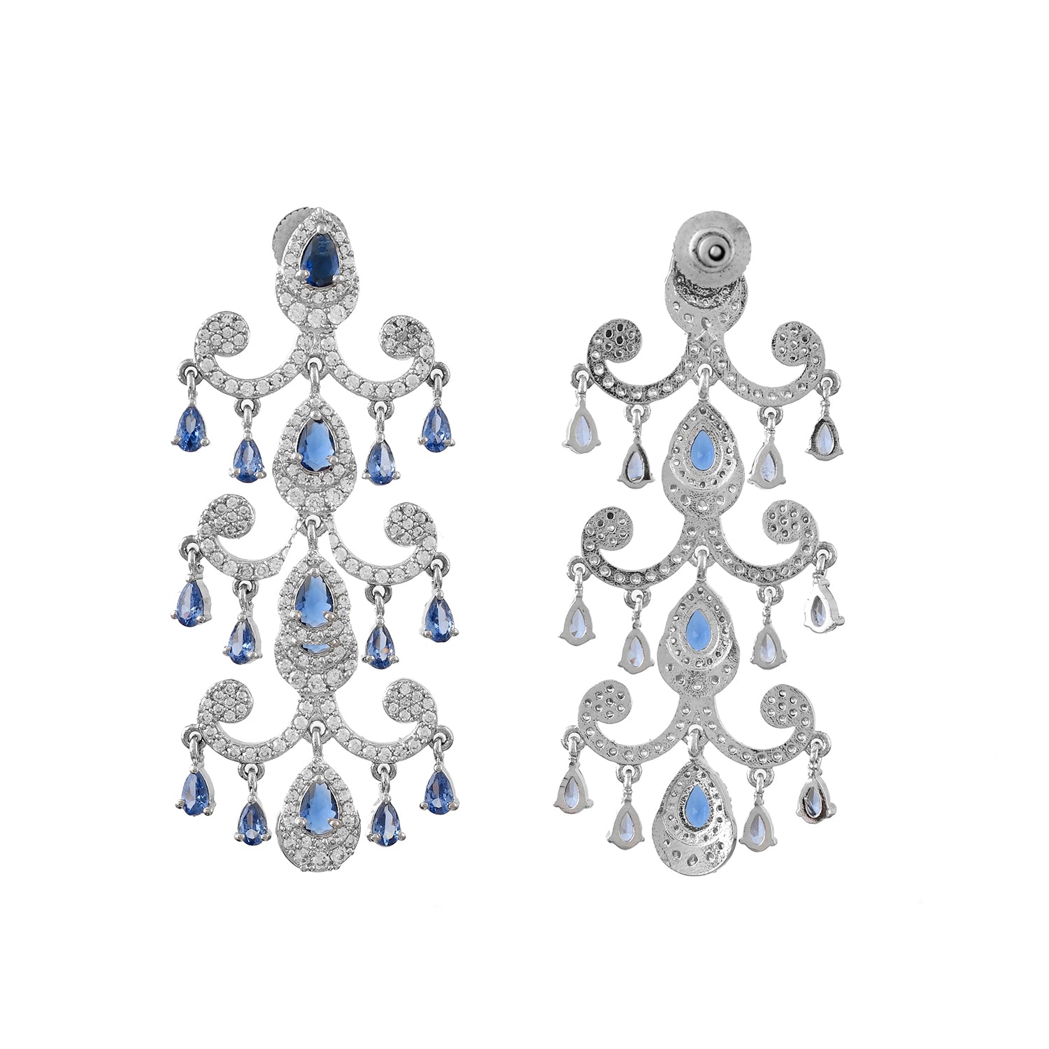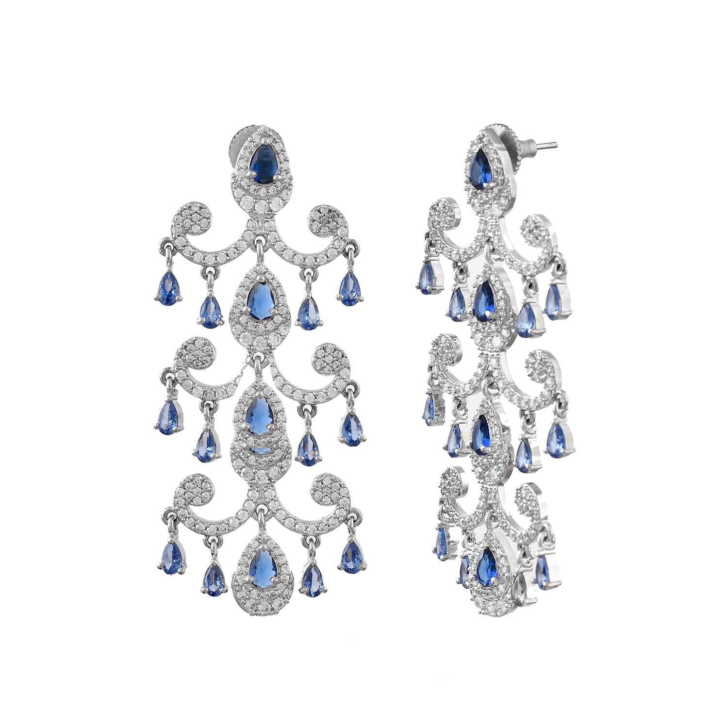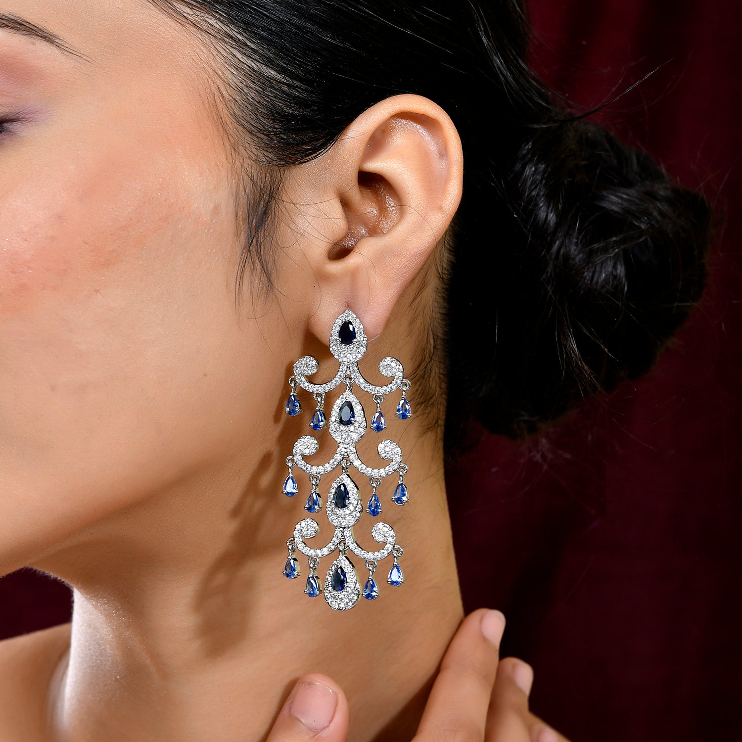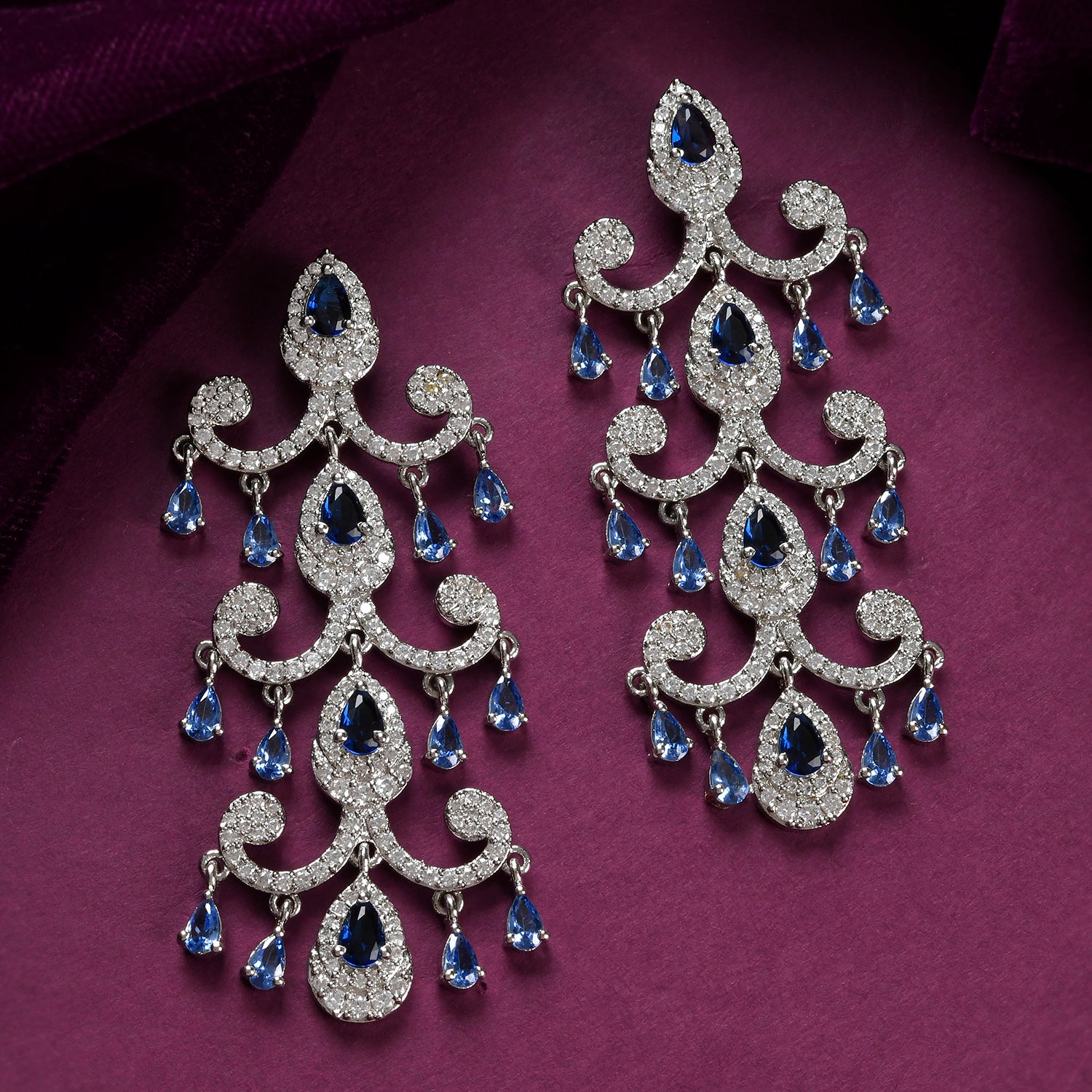 The Royal Romance Elsa Statement Earrings are a stunning example of opulent craftsmanship and timeless elegance. These earrings, part of Voylla’s Royal Romance Collection, are meticulously crafted from high-quality brass and plated with white rhodium, ensuring durability and a luxurious finish. The intricate design features a cascade of American diamonds and blue stones, creating a dazzling effect that is perfect for festive occasions, weddings, or cocktail parties. The vibrant blue stones add a pop of color, making these earrings a versatile accessory that can elevate any outfit. Ideal for gifting, these earrings are a thoughtful choice for Valentine's Day, Diwali, Raksha Bandhan, Christmas, or New Year, and are sure to delight mothers, wives, girlfriends, or sisters. Styling tip: Pair these statement earrings with a simple dress to let them shine, or complement a regal ensemble for a truly majestic look.