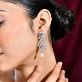 The Royal Romance Kama Drop Earrings are a stunning example of opulent craftsmanship and timeless elegance. These exquisite earrings are crafted from high-quality brass and plated with white rhodium, ensuring a luxurious finish and lasting durability. The intricate design features heart-shaped American diamonds surrounded by a halo of smaller stones, creating a dazzling effect that catches the light beautifully. A delicate pearl drop adds a touch of sophistication, making these earrings perfect for special occasions such as weddings, festive celebrations, and cocktail parties. The soft pink hue of the stones complements the sparkling white diamonds, adding a romantic and feminine touch to any outfit. These earrings make an ideal gift for women, whether for Valentine’s Day, Diwali, Raksha Bandhan, or Christmas, and are sure to be cherished by mothers, sisters, girlfriends, wives, and lovers alike. Part of Voylla’s Royal Romance Collection, these earrings are inspired by Regencycore, Halo brilliance, Heart motifs, and Regal Florals, blending heritage charm with contemporary style.