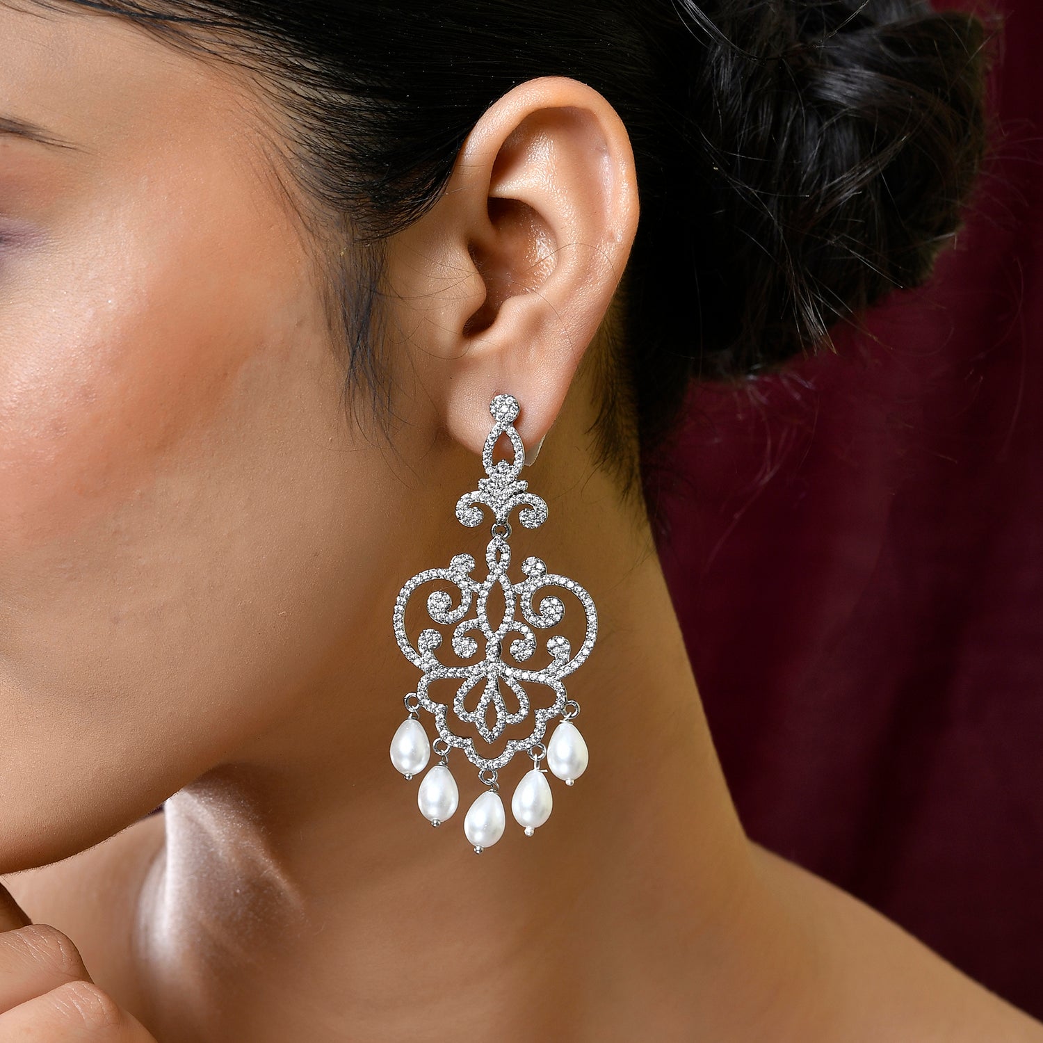 The Royal Romance Valentina Statement Earrings are a quintessential blend of timeless elegance and contemporary allure, crafted from high-quality brass and plated with pristine white rhodium. These exquisite earrings are adorned with sparkling American diamonds and delicate pearl drops, offering a stunning addition to the Royal Romance collection. The intricate design and superior craftsmanship evoke a sense of opulence, ideal for elevating festive, wedding, and cocktail attire. Whether styled with traditional ensembles or modern outfits, these earrings provide a versatile touch of glamour. Perfect for gifting occasions such as Valentine's Day, Diwali, Raksha Bandhan, and Christmas, they make thoughtful presents for women, including sisters, girlfriends, wives, and mothers.
