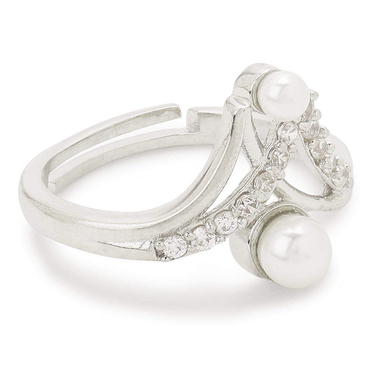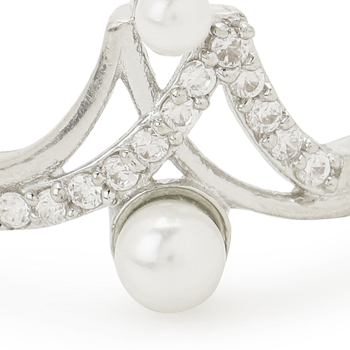 The joy of wearing the best is unbeatable. This V-shaped Diamond studded ring gives a magnificent look. The flawless pearl on top gives it a chic look making it the best fit for every occasion.Weight (Gms): 3.22Size (LxW)(Inch): 0.6*0.3Material: BrassPlating:...