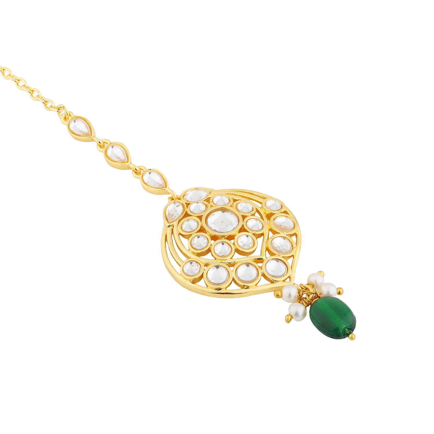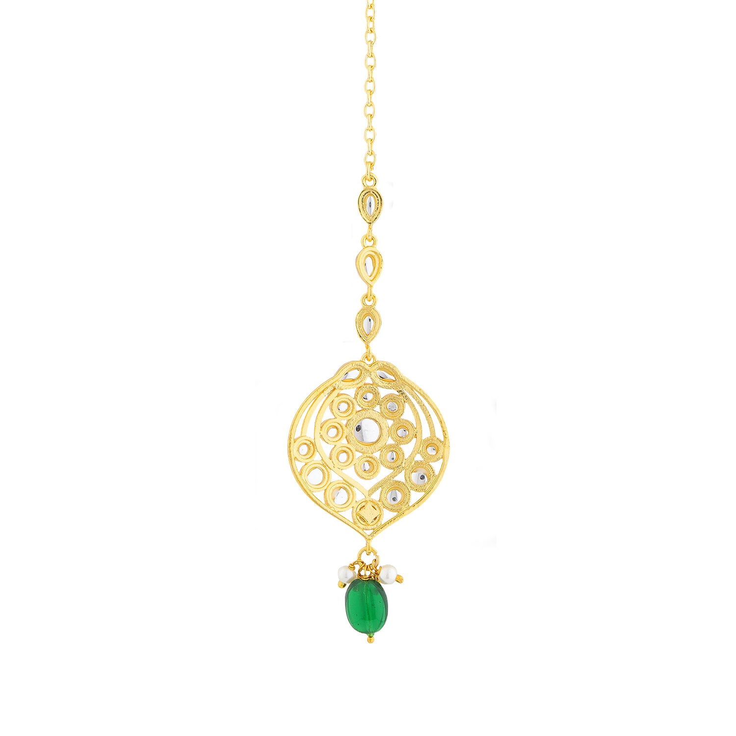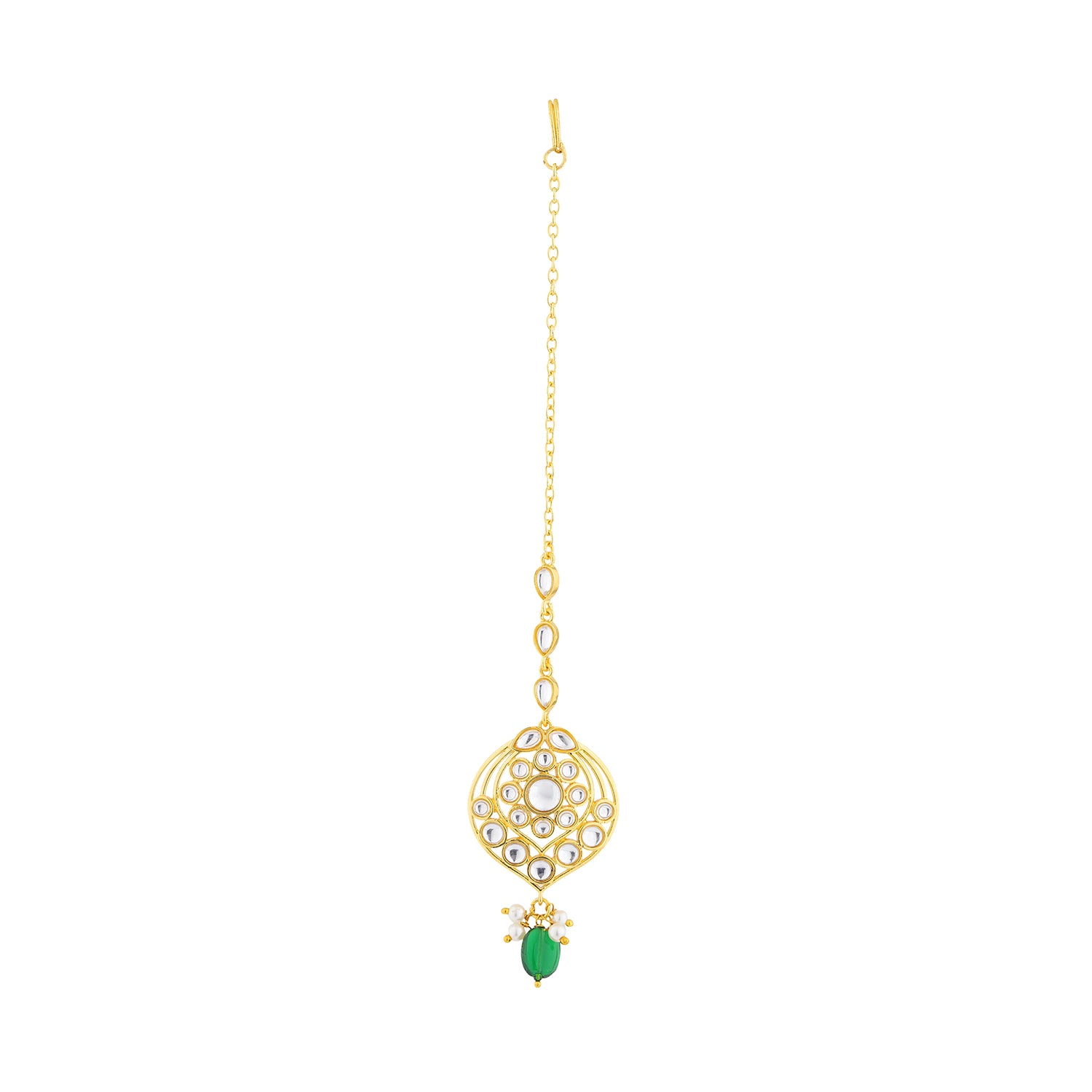 Inspired by the regal elegance of Rajasthan’s royal courts, the Queens of Rajasthan Manora Maang Tikka is a timeless piece designed to celebrate heritage, femininity, and grace. Part of the majestic Queens of Rajasthan collection, this maang tikka reflects the beauty of traditional Rajasthani jewellery, thoughtfully crafted for modern brides and women who cherish cultural elegance. Crafted in premium brass and finished with rich yellow gold plating, the Manora Maang Tikka features intricate kundan stone detailing arranged in a graceful oval silhouette. Delicate pearl accents and a deep green stone drop add movement and richness, making this maang tikka for women traditional both eye-catching and refined. Lightweight yet statement-making, it sits comfortably at the centre of the forehead, perfect for long wedding rituals and celebrations. Whether worn as a bridal mangtika, styled for bridesmaids, or chosen for festive occasions, this piece blends heritage design with effortless wearability. Pair it with lehengas, sarees, or traditional ensembles to instantly elevate your look with royal charm.