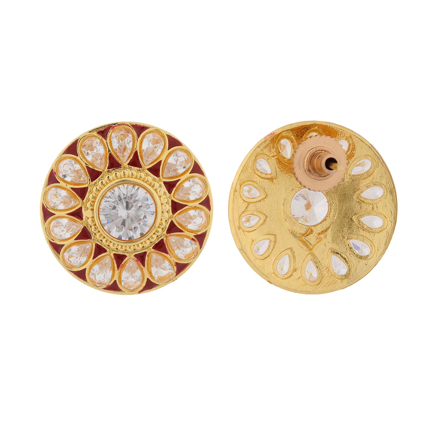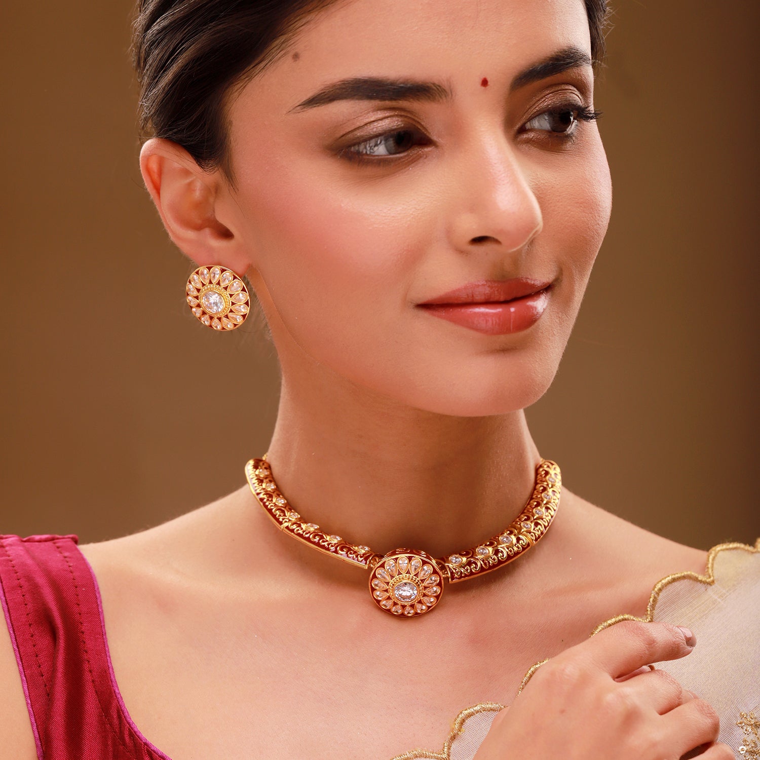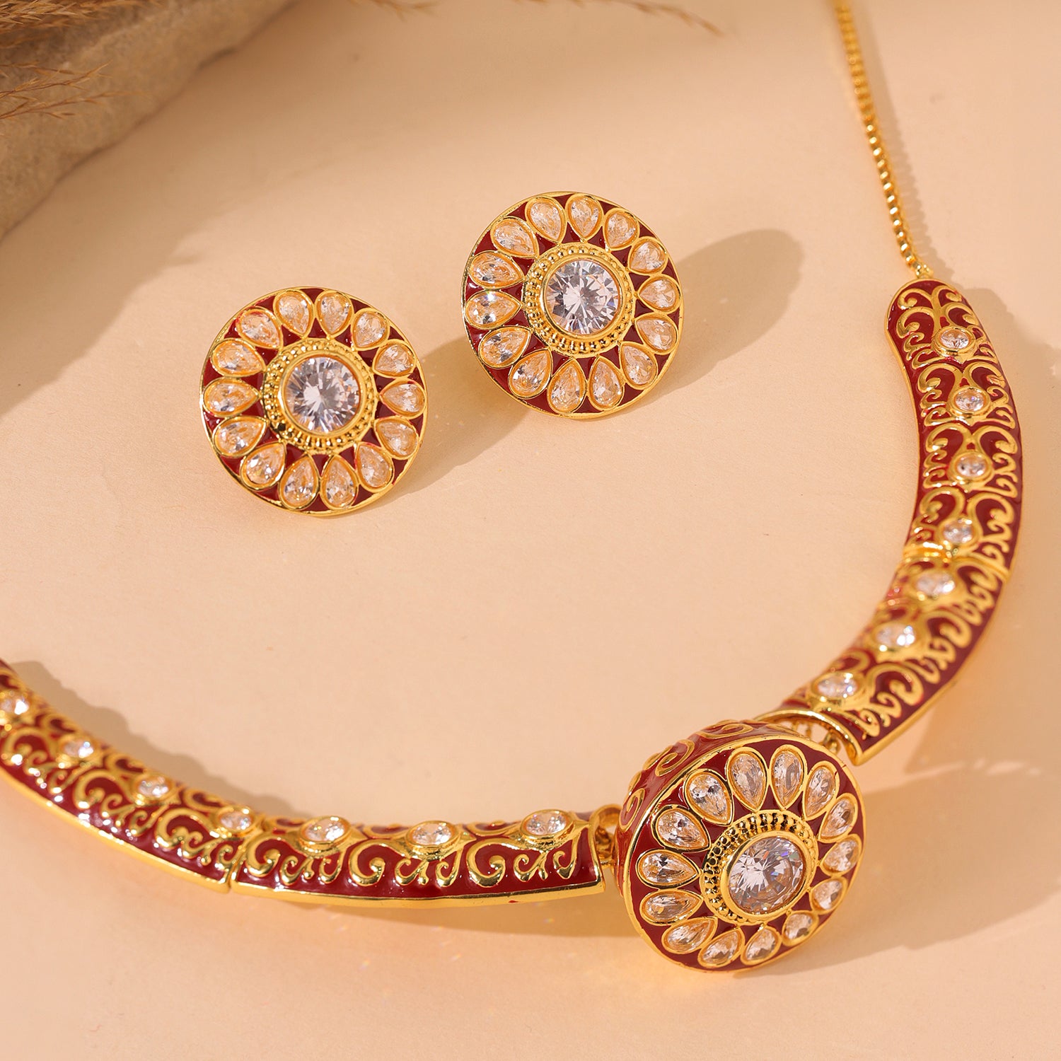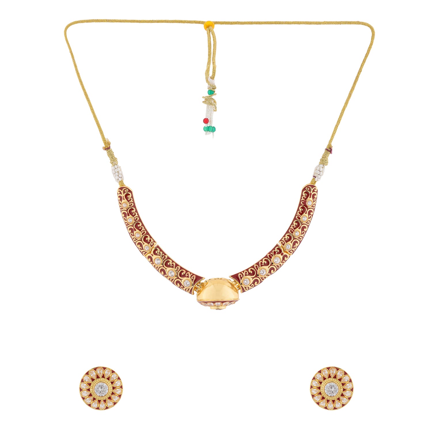 The Queens of Rajasthan Padmira Borla Hasli Necklace Set is a timeless tribute to Rajasthan’s royal traditions, inspired by ceremonial jewellery worn by queens during court rituals and grand festivities. A striking piece from the iconic Queens of Rajasthan collection, this Hasli set celebrates heritage, strength, and regal elegance, crafted for women who cherish authentic Rajasthani jewellery with a modern soul. Expertly crafted in premium brass and finished with rich yellow gold plating, the Padmira set features a classic Hasli necklace silhouette adorned with intricate Kundan detailing and deep maroon enamel work. The bold circular Borla-inspired centerpiece reflects royal symbolism, while the matching earrings complete the look with harmony and traditional charm. Inspired by Rajasthan’s iconic kings and queens, this jewellery set is designed for modern brides and women who want their adornments to feel meaningful, rooted in heritage yet effortless to wear. Whether chosen as bridal jewellery, styled for traditional celebrations, or gifted as a memorable gift for bride or bridesmaid, the Padmira Borla Hasli Necklace Set brings royal legacy to life with every detail.