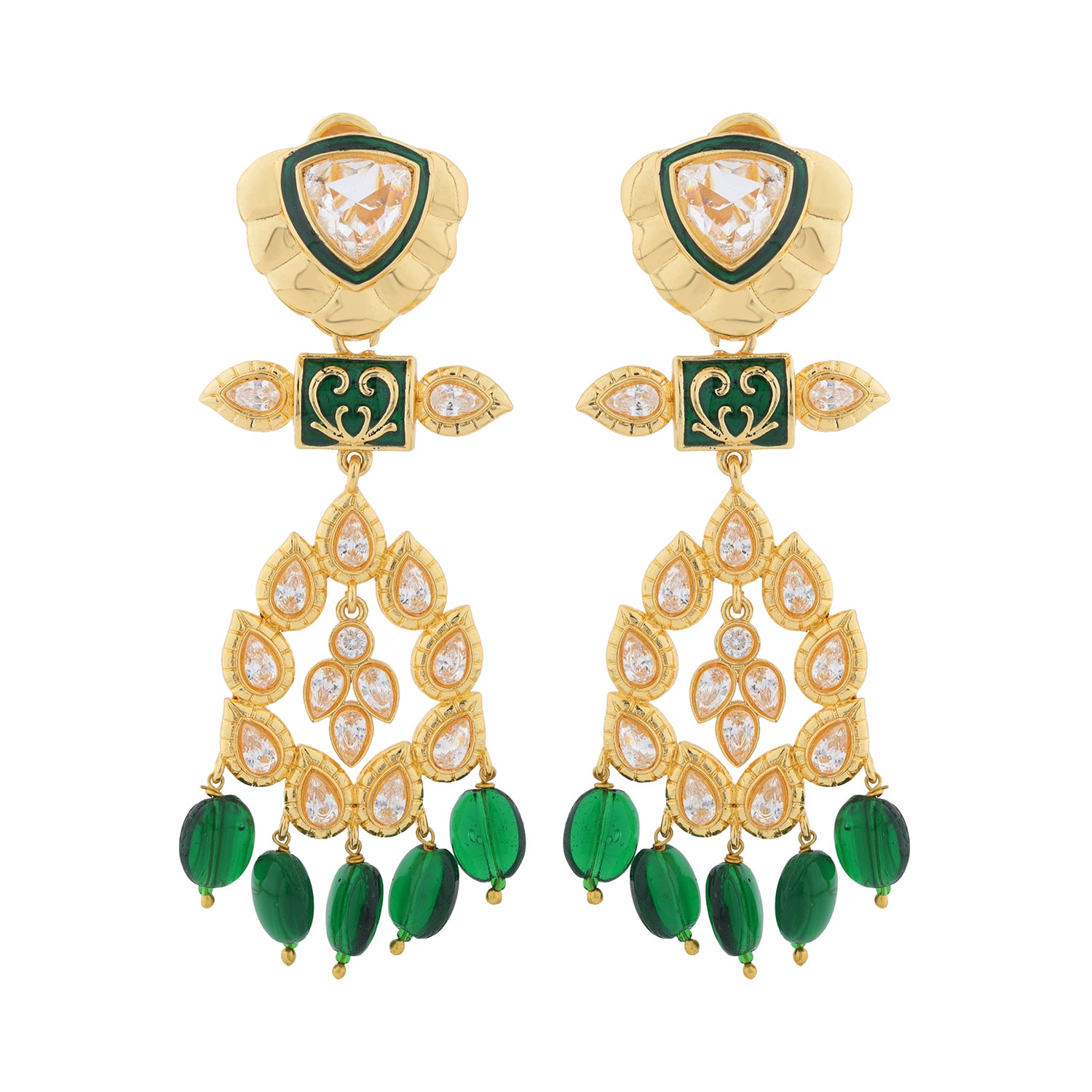 Inspired by the opulence of royal courts and the grace of Rajput queens, the Queens of Rajasthan Rutani Dangle Earrings are a celebration of heritage, artistry, and timeless elegance. Part of the majestic Queens of Rajasthan collection, these statement earrings are designed for women who love jewellery that feels regal yet beautifully wearable. Crafted in premium brass and finished with rich yellow gold plating, the Rutani Dangle Earrings showcase intricate kundan craftsmanship paired with elegant green bead drops. The long, flowing silhouette creates movement and drama, making these long earrings for women stylish while still maintaining a balanced, refined look. Inspired by traditional Jaipuri jewellery and royal aesthetics, the design reflects the grandeur once worn by queens during celebrations and ceremonies. Perfect as bridal earrings or wedding earrings, these heavy earrings for women elevate bridal lehengas, sarees, and festive ensembles with effortless charm. They are equally stunning for bridesmaids or women attending grand occasions who want statement jewellery without compromising comfort.