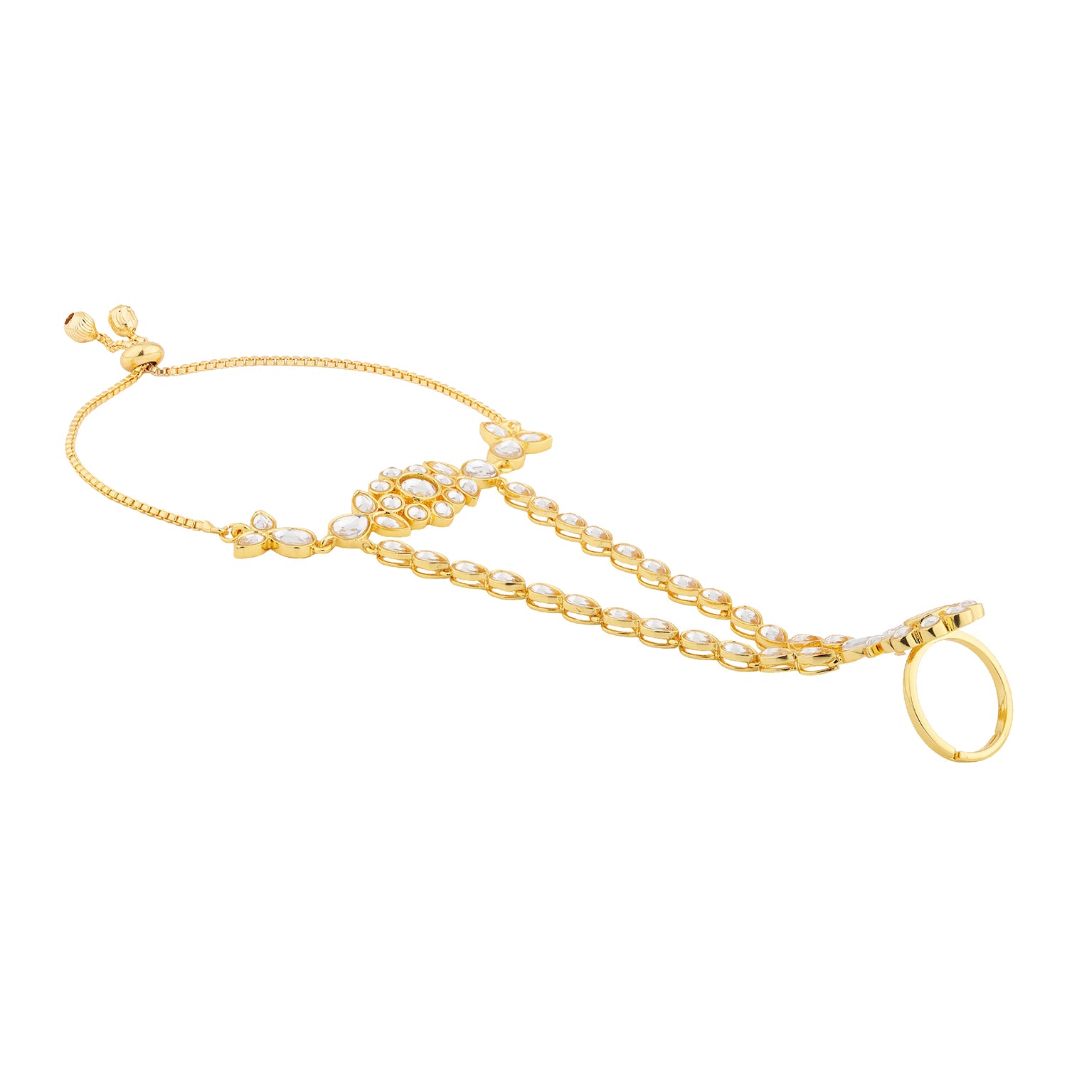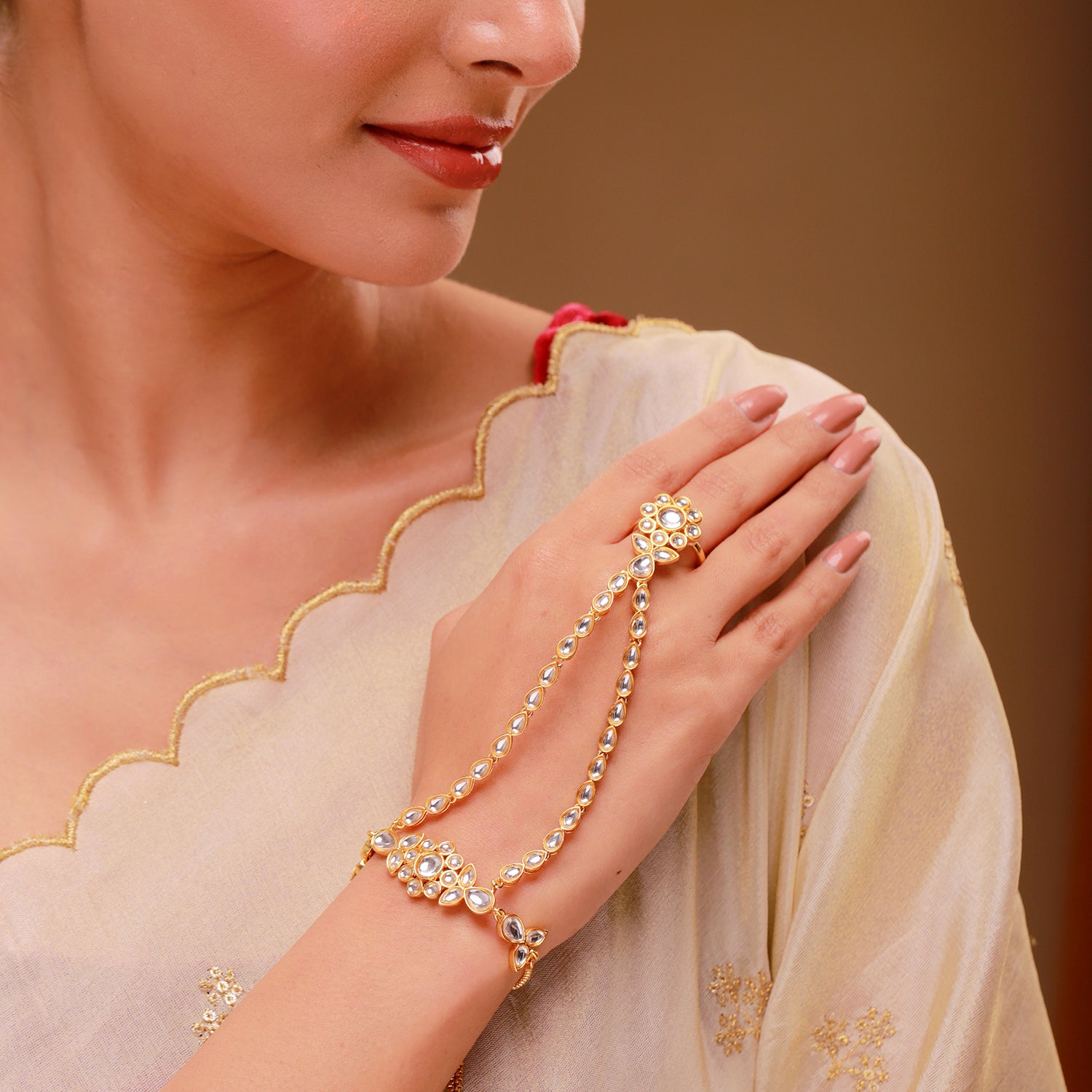 Step into the world of royal elegance with the Queens of Rajasthan Veeraya Hathphool, a timeless expression of heritage-inspired beauty designed for today’s modern woman. Part of the majestic Queens of Rajasthan collection, this exquisite hathphool jewellery for women draws inspiration from Rajasthan’s legendary kings and queens, their opulent courts, and the enduring charm of traditional Jaipuri jewellery. Crafted thoughtfully in premium brass and finished with rich yellow gold plating, this gold hathphool for women showcases classic kundan artistry in a refined hand harness silhouette. The elegant chain connects the finger ring to the bracelet, creating a graceful flow that enhances the beauty of your hands. The design feels regal yet lightweight, making it comfortable for long wedding functions and celebrations. Perfect as a bridal hathphool, this piece adds a royal finishing touch to bridal lehengas, sarees, and festive ensembles. It is equally beautiful as a hathphool for bridesmaid, offering coordinated elegance for wedding parties. Whether worn during mehendi, sangeet, engagement ceremonies, or festive occasions, this hathphool brings effortless sophistication and timeless charm. The warm golden tone pairs beautifully with both pastel shades and rich jewel-toned outfits, making it a versatile addition to your jewellery collection. Designed for women who love meaningful jewellery, the Veeraya Hathphool also complements other accessories like bracelets for women, kundan earrings, and statement necklaces for a complete royal look. If you are looking for a thoughtful gift for bride, a memorable gift for bridesmaid, or elegant gifts for woman who appreciates heritage craftsmanship, this piece makes a heartfelt choice. Rooted in tradition yet styled for modern sensibilities, it is jewellery that tells a story of culture, celebration, and individuality.
