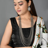 Inspired by beautiful banjara designs and the elements of Navratri, this Boho design jewellery set has been fashioned out of brass. The long necklace and matching earrings have been given an oxidized silver plating. Lightweight, comfortable and versatile.