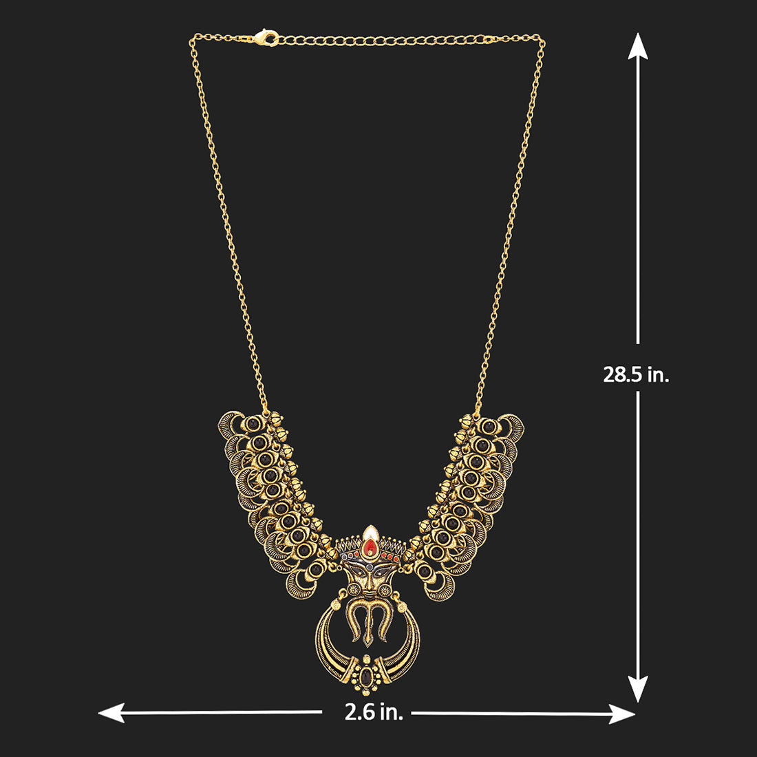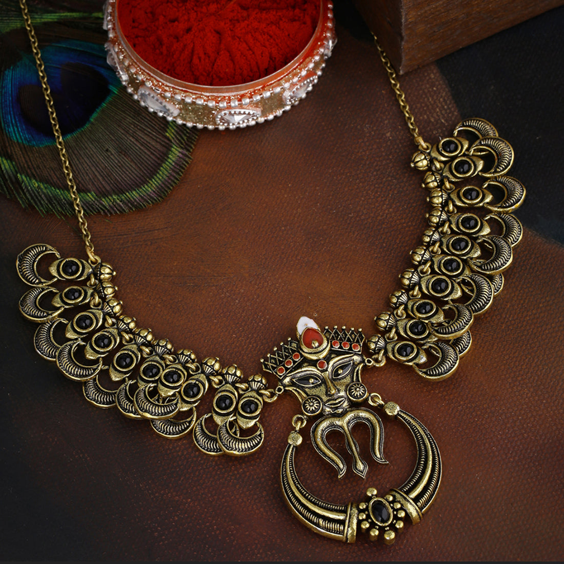 Trishul and Goddess face brass necklace inspired by Durga and her 9 forms and associated motifs. Oxidised gold plated and embellished with stones, the necklace will look splendid when paired with a silk saree.