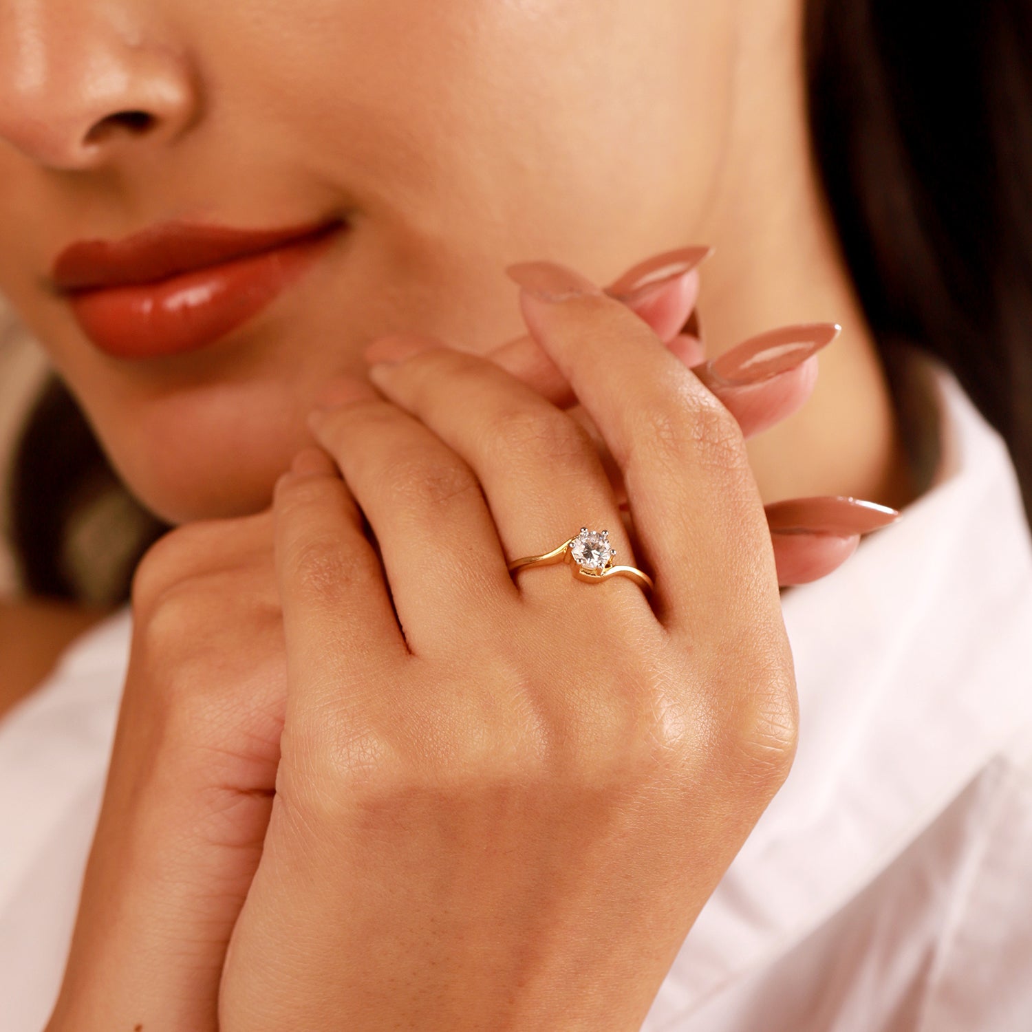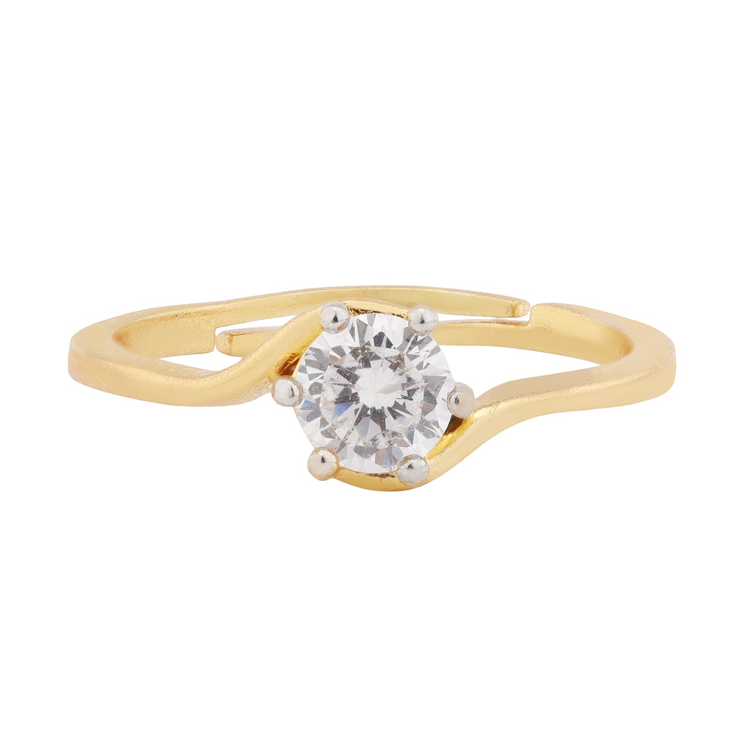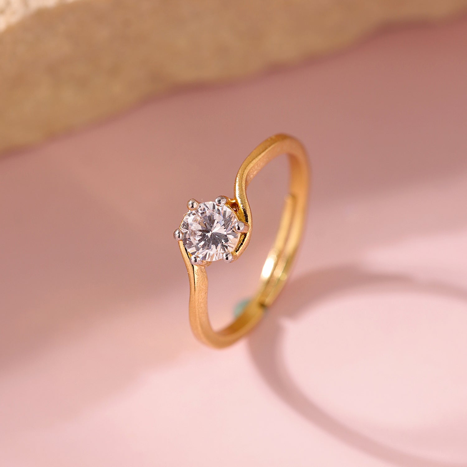 The Forever Yours Classic Solitaire Ring from our Valentines Day Collection is designed to celebrate love in its purest and most elegant form. The delicate wave-shaped band gracefully embraces a radiant american diamond solitaire, allowing it to sit proudly at the centre like a sparkling promise. With its smooth and refined yellow gold plating over a durable brass base, this Ring for Women feels luxurious yet lightweight, making it suitable for everyday wear or special occasions. The brilliant solitaire reflects light beautifully with every gesture, effortlessly drawing attention and adding a soft romantic glow to your look. Timeless in its appeal and universally flattering, this ring pairs beautifully with modern minimal outfits, classic occasion wear, festive ensembles and chic western silhouettes. It is the kind of jewellery that feels personal and emotional, a piece that you do not just wear, but connect with. A perfect women gift for valentines day, anniversaries or intimate celebrations, this stunning solitaire Ring symbolises affection, loyalty, admiration and self-love. Whether you are gifting it to someone special or adorning yourself as a celebration of your own journey, this ring offers a meaningful way to express emotion and create a cherished memory through jewellery.