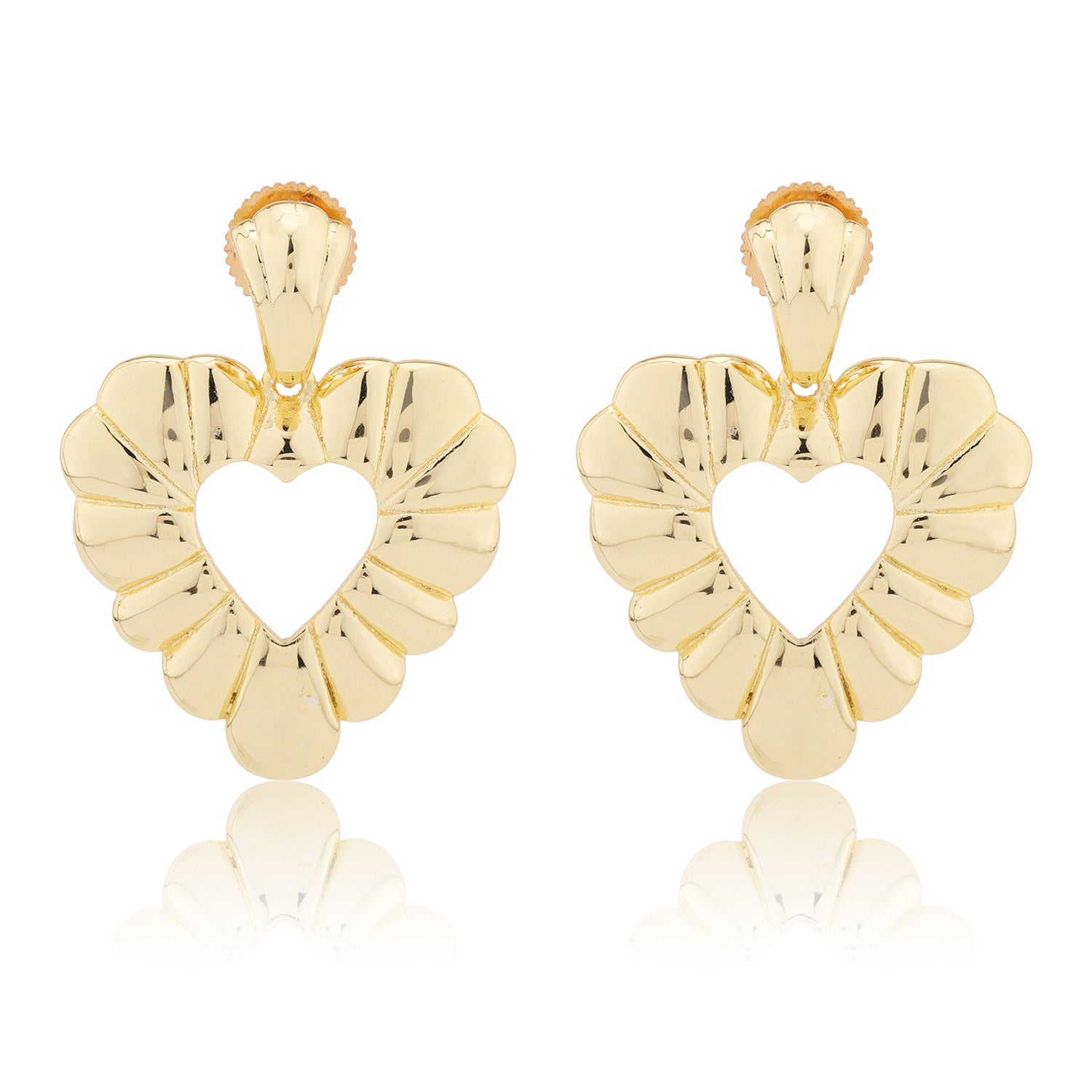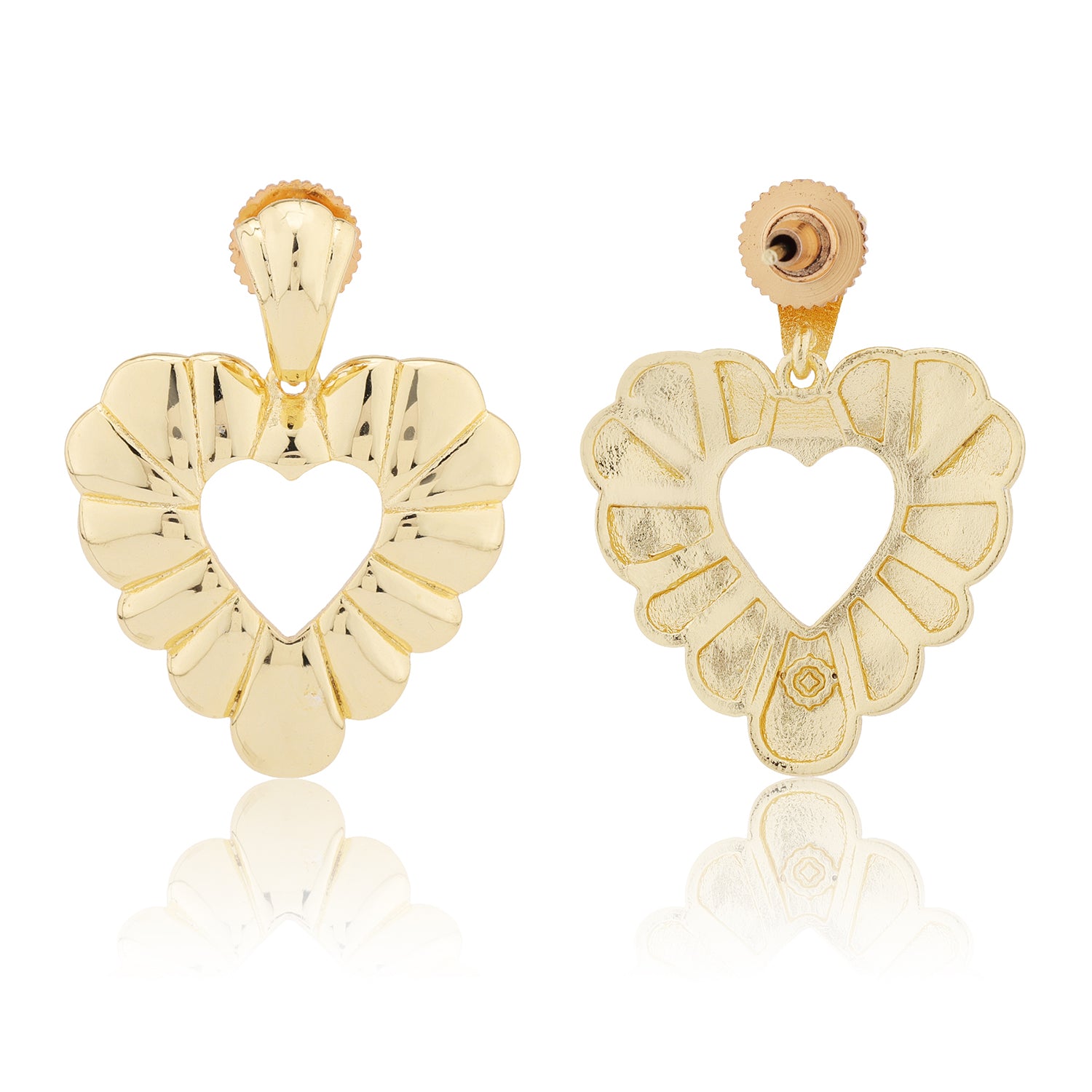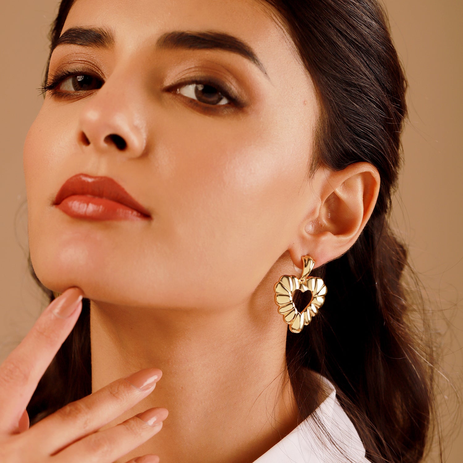 These petal-sculpted heart earrings from our Valentines Day jewellery line are designed to radiate confidence, femininity, and timeless romantic charm. The earrings feature a bold dimensional heart silhouette made up of soft, petal-like segments that reflect light beautifully, creating a fluid golden gleam with every movement. Crafted in durable, skin-friendly brass and finished with a premium yellow-gold plating, these earrings offer the luxurious look of real gold without the weight or cost, ensuring long-lasting shine, color richness and quality wear. The polished open-heart center adds a subtle modern touch to the otherwise vintage-inspired floral shape, making these earrings suitable for both contemporary and classic style lovers. Lightweight and comfortable, they can be worn all day without discomfort. Pair them with dresses, sarees, festive outfits or elevated casual styles for an instantly glamorous look. Perfect for romantic occasions like Valentine’s Day and anniversaries, as well as birthdays, celebrations, and special moments, they make a truly memorable gift for women, gift for lover, gift for valentines, or even a meaningful gift for self in the spirit of self love.