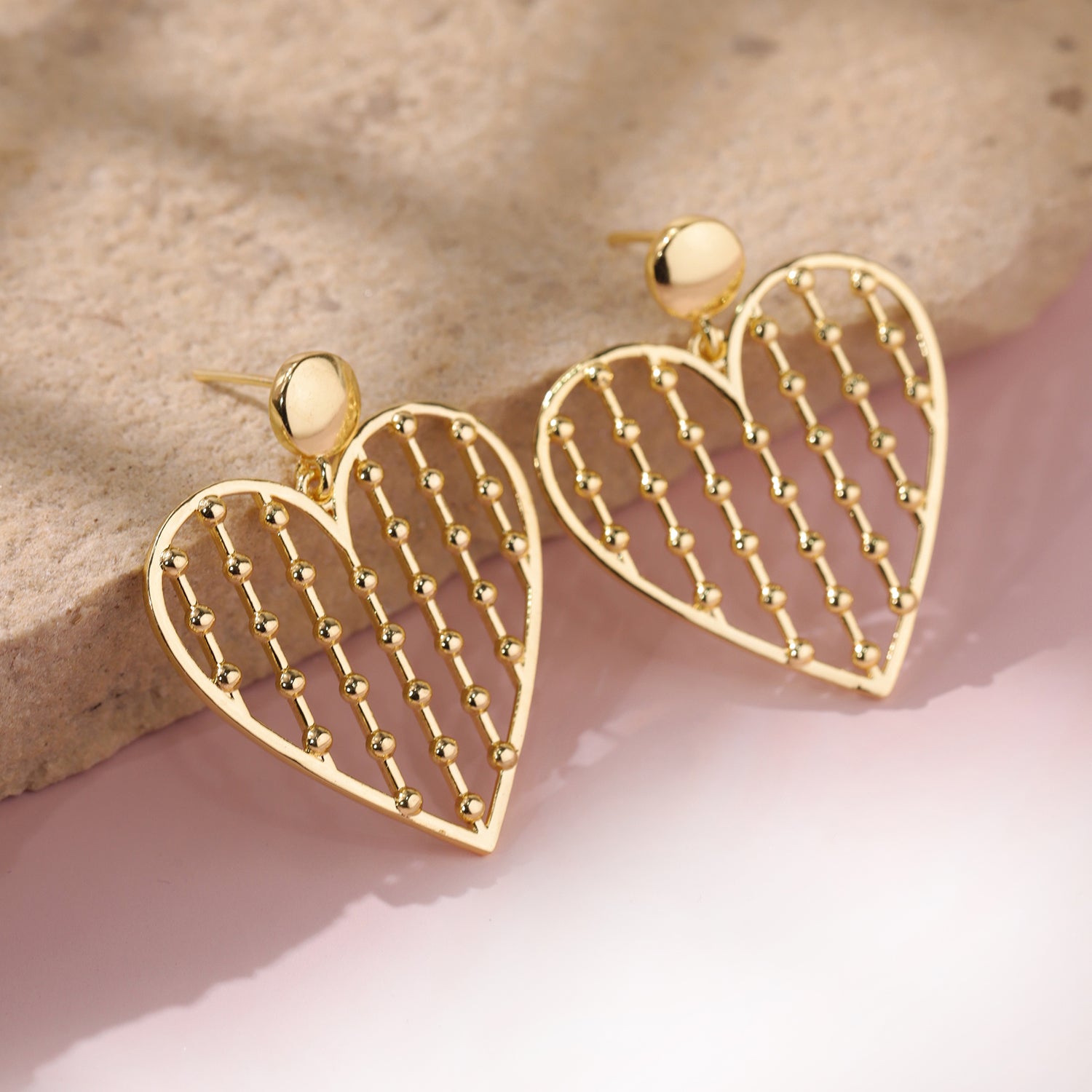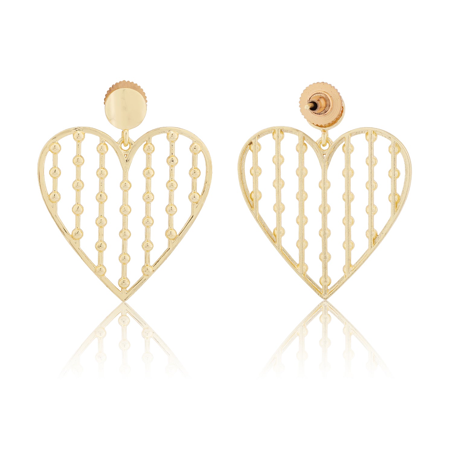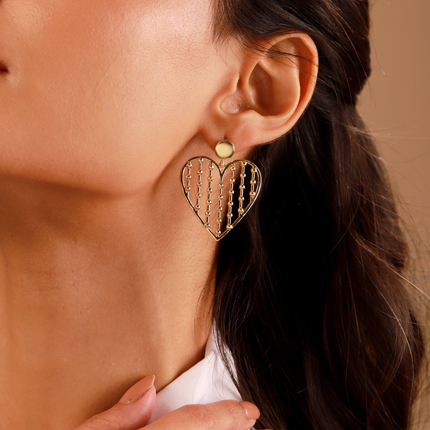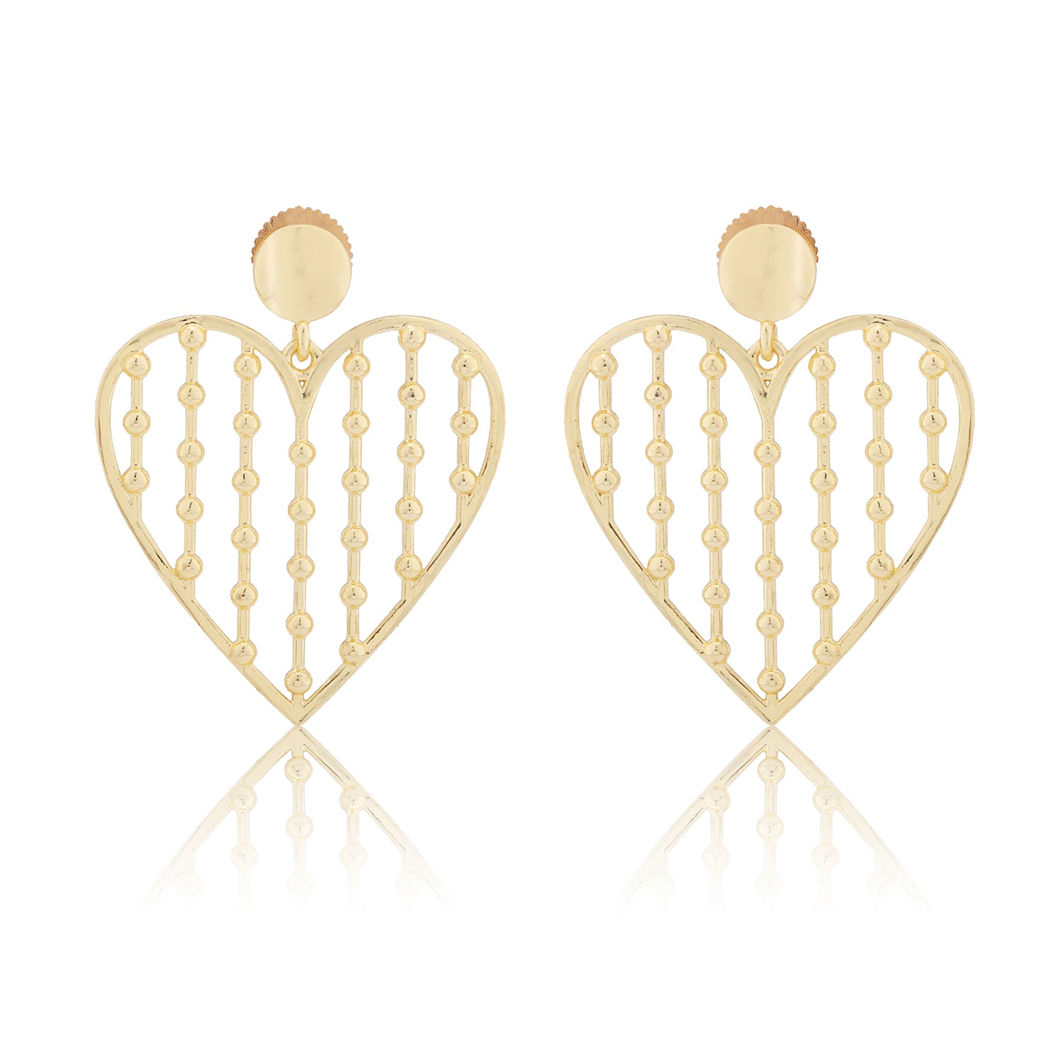 These Golden Lattice Heart Earrings are a stunning expression of love and elegance, designed as part of our Valentines Day collection to celebrate meaningful affection and feminine charm. The open-heart framework with delicately spaced golden bead accents gives these earrings a lattice-like texture that is both artistic and gracefully modern, creating a striking and eye-catching silhouette. Made from high-quality brass and plated with rich yellow gold, these earrings radiate a warm, polished glow while offering durability and lasting shine. Lightweight and comfortable to wear, they are ideal for long durations without discomfort, making them suitable for both daily styling and special moments. Whether paired with soft romantic outfits or used to elevate minimal clothing, these danglers bring a playful yet classy touch to your overall look. Beautiful as a gift or as a personal treat, these earrings are a timeless love-inspired accessory that retains emotional and aesthetic value.