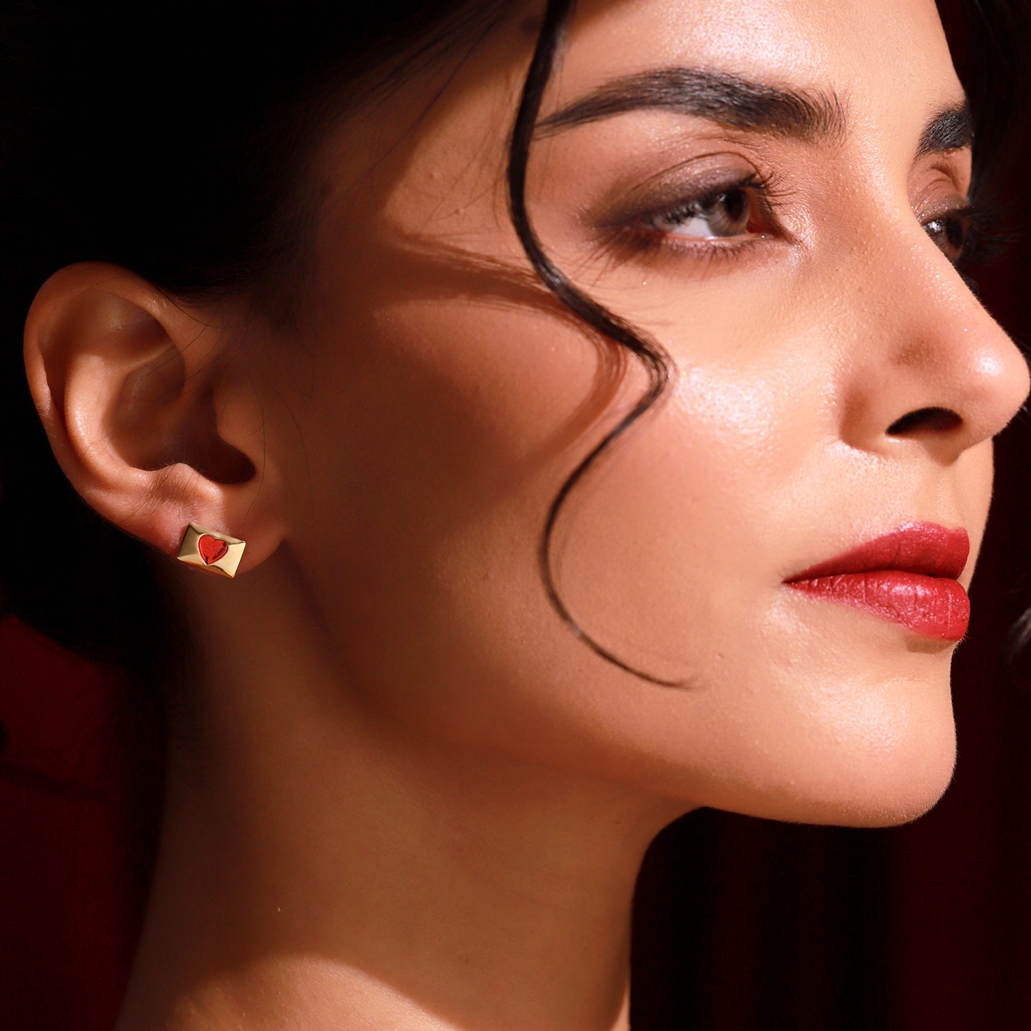 Introducing the Love Sealed Earrings, designed exclusively for our Valentine’s Day Collection. These women earrings feature a sleek rectangular gold plate embedded with a vivid red heart, reminiscent of a sealed love note or a heartfelt message captured in jewellery form. The clean geometric silhouette paired with an emotional heart motif makes these earrings a unique fusion of modern minimalism and romantic storytelling. Made from genuine 925 sterling silver with rich yellow gold plating, these earrings offer long-lasting shine, durability, and skin-friendly comfort. The red enamel heart adds a striking contrast, giving these sterling silver earrings a bold touch of personality and color while remaining easy to style and elegant to wear. Whether chosen as a thoughtful gift for lover, a meaningful women gift, or a small symbolic gift for self, these earrings capture the warmth of affection in the most understated yet memorable way.