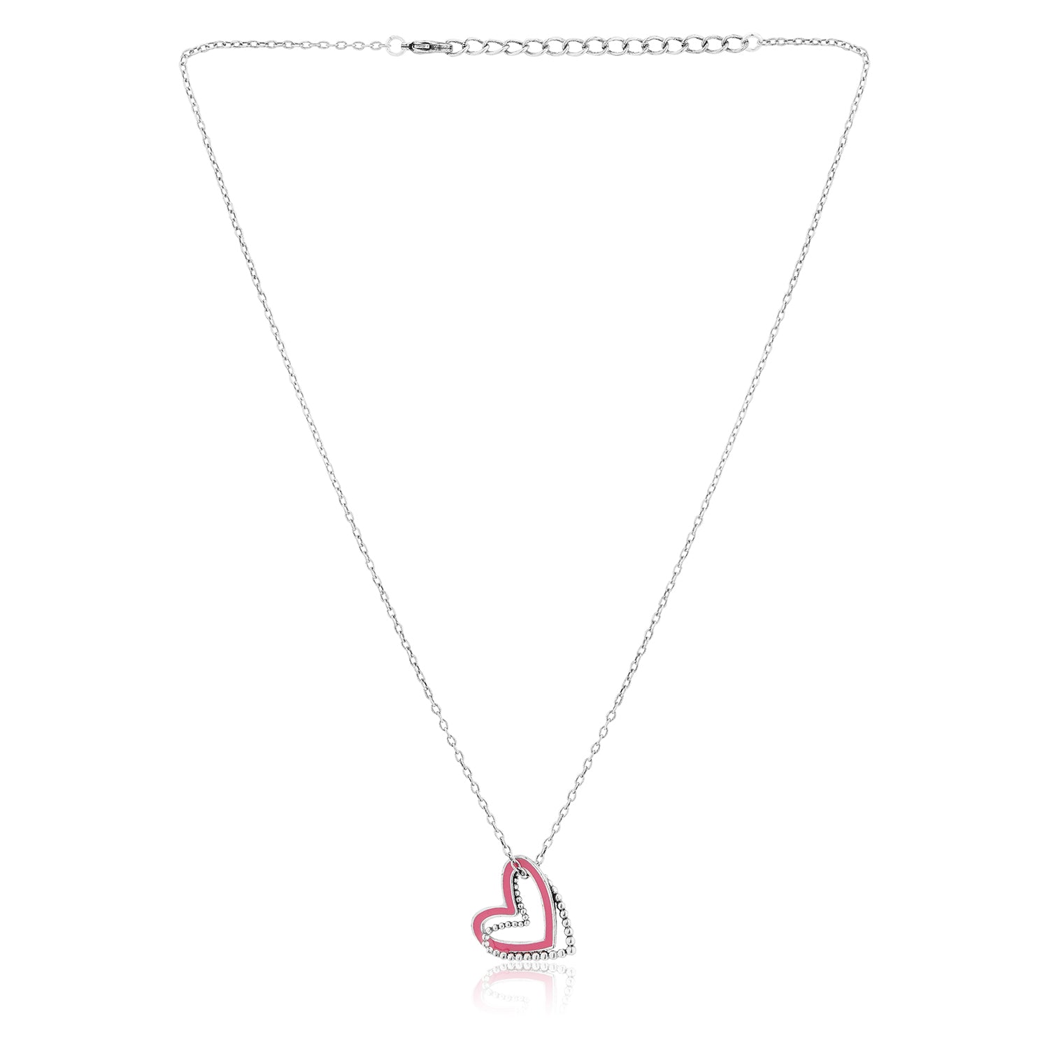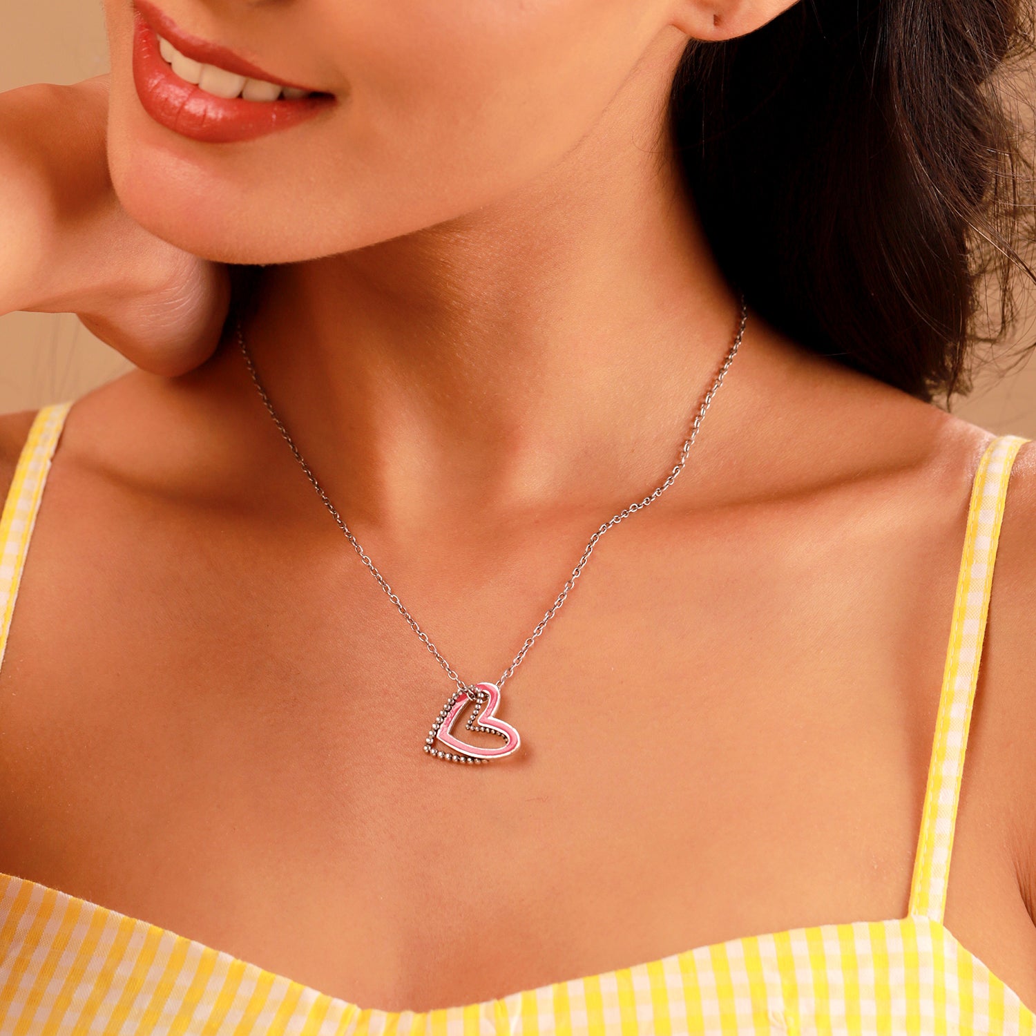 Embrace joy, color, and spirited love with the Pink Playful Heart Pendant, designed as part of our expressive Valentine’s Day Collection. This charming pendant features a vibrant pink enamel heart layered with a textured beaded metal outline symbolizing love that’s lively, youthful, and beautifully unfiltered. The design is playful yet refined, appealing to those who see love not just as emotion but as energy, enthusiasm, and color. Crafted in high-quality brass and beautifully finished with oxidized silver plating, this pendant offers long-lasting shine and durability while remaining lightweight and skin-friendly. The contrasting textures smooth enamel alongside beaded silver-toned edges, give depth and dimension, creating a piece that stands out, captures light, and sparks joy. This pendant is more than an accessory, it’s a mood. Whether worn for casual days, social outings, or celebratory moments, it adds a pop of charm and personality to the neckline. It makes an adorable gift for women, sweet gift for lover, and confidence-boosting gift for self, celebrating color, individuality, and self love.