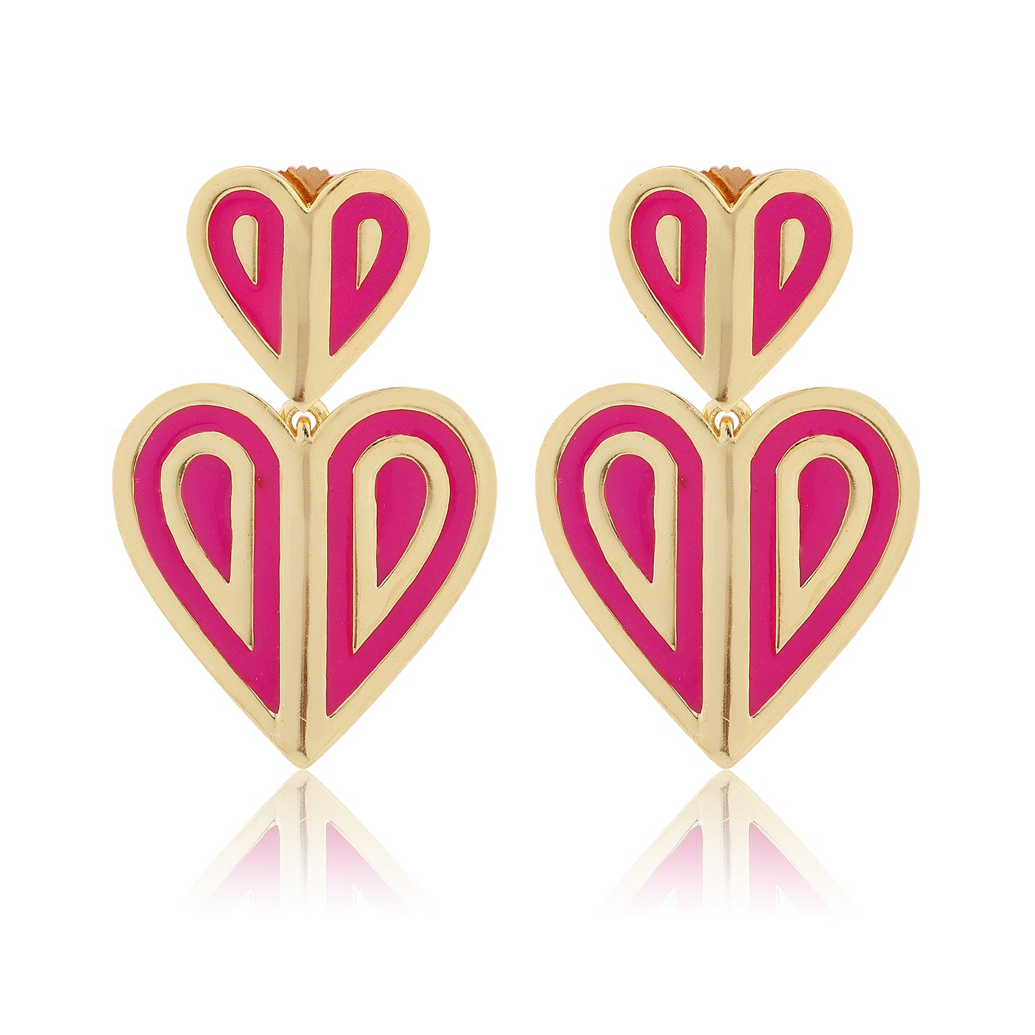A fun, vibrant and fashion-forward pair, the Pop Heart Bold Earrings for Women are part of our Valentines Day jewellery collection, designed to celebrate color, personality and love in every form. These Women Earrings are crafted in durable brass and finished with a premium yellow gold plating, adorned with striking pink enamel for a bold, youthful and modern aesthetic. With a double-heart drop design that instantly catches attention, these dangler Earrings for Women are lightweight yet statement-making, making them perfect for parties, brunches, date nights and everyday style elevation. They sit beautifully on the ear and flatter every face shape, serving as both an expressive accessory and a confidence-boosting style piece. Whether you are picking a gift for lover, a valentines day gift, a galentine gift, a gift for women, a gift for self or celebrating friendship and self-love, these statement earrings make the moment meaningful. Comfortable for all-day wear and versatile for various outfits, they are the perfect choice for women who love expressive and joyful jewellery.