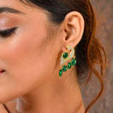 The Voylla Mayurika Earrings from the Panchhi collection are a stunning blend of craftsmanship and elegance, crafted from high-quality brass with a luxurious gold plating. These women's earrings feature intricate designs inspired by nature's most majestic birds, adorned with sparkling American Diamond Kundan stones and vibrant green beads. The contrast of gold and green makes these earrings perfect for festive occasions, weddings, parties, and special events like Holi, Diwali, Rakshabandhan, Christmas, and New Year. They make an ideal gift for women, whether it's for a sister, girlfriend, wife, mother, or lover, and are perfect for Valentine's Day or any celebration. Style these party wear earrings with traditional attire for a regal look or pair them with contemporary outfits for a touch of sophistication. Inspired by the elegance of nature, these earrings capture the essence of love and grace, making them a must-have for every bride's trousseau.