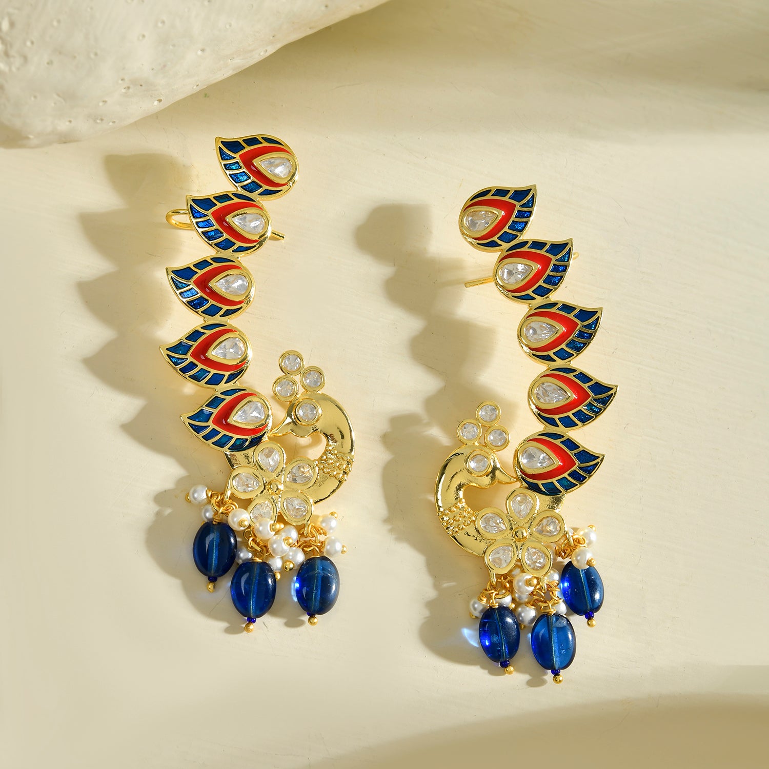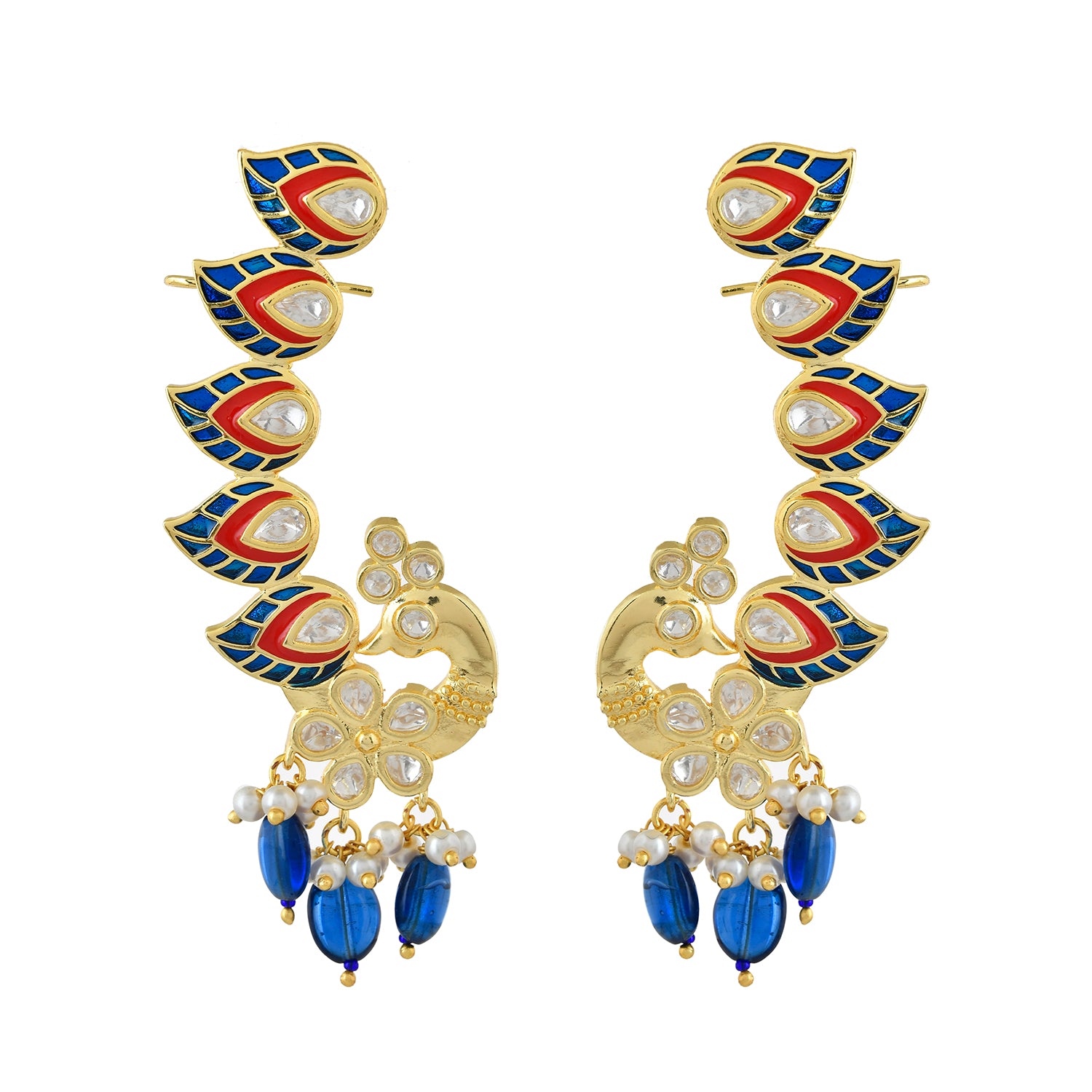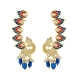 The Voylla Papiha Cuff Earrings are a stunning addition to any jewelry collection, crafted from high-quality brass with a luxurious gold plating. These earrings are part of the Panchhi collection, inspired by the elegance of nature's most majestic birds, capturing the essence of love and grace with the timeless beauty of Kundan. The intricate design features vibrant peacock feather motifs adorned with American Diamond Kundan stones, adding a touch of sparkle and sophistication. The earrings are further embellished with blue and white beads, making them perfect for festive occasions, weddings, and parties. These versatile earrings can be styled with traditional attire for a festive look or paired with contemporary outfits for a chic statement. They make an excellent gift for women, whether for Valentine's Day, Diwali, Raksha Bandhan, Christmas, New Year, or any special occasion, and are ideal for gifting to sisters, girlfriends, wives, mothers, or lovers.
