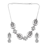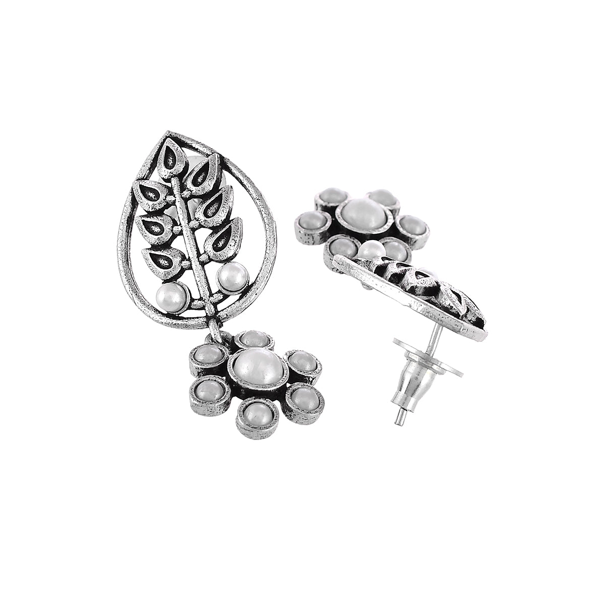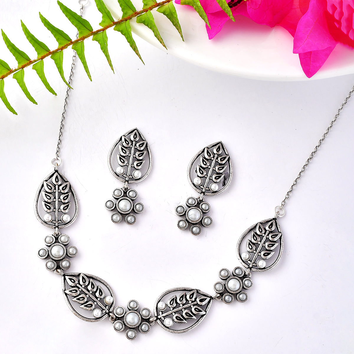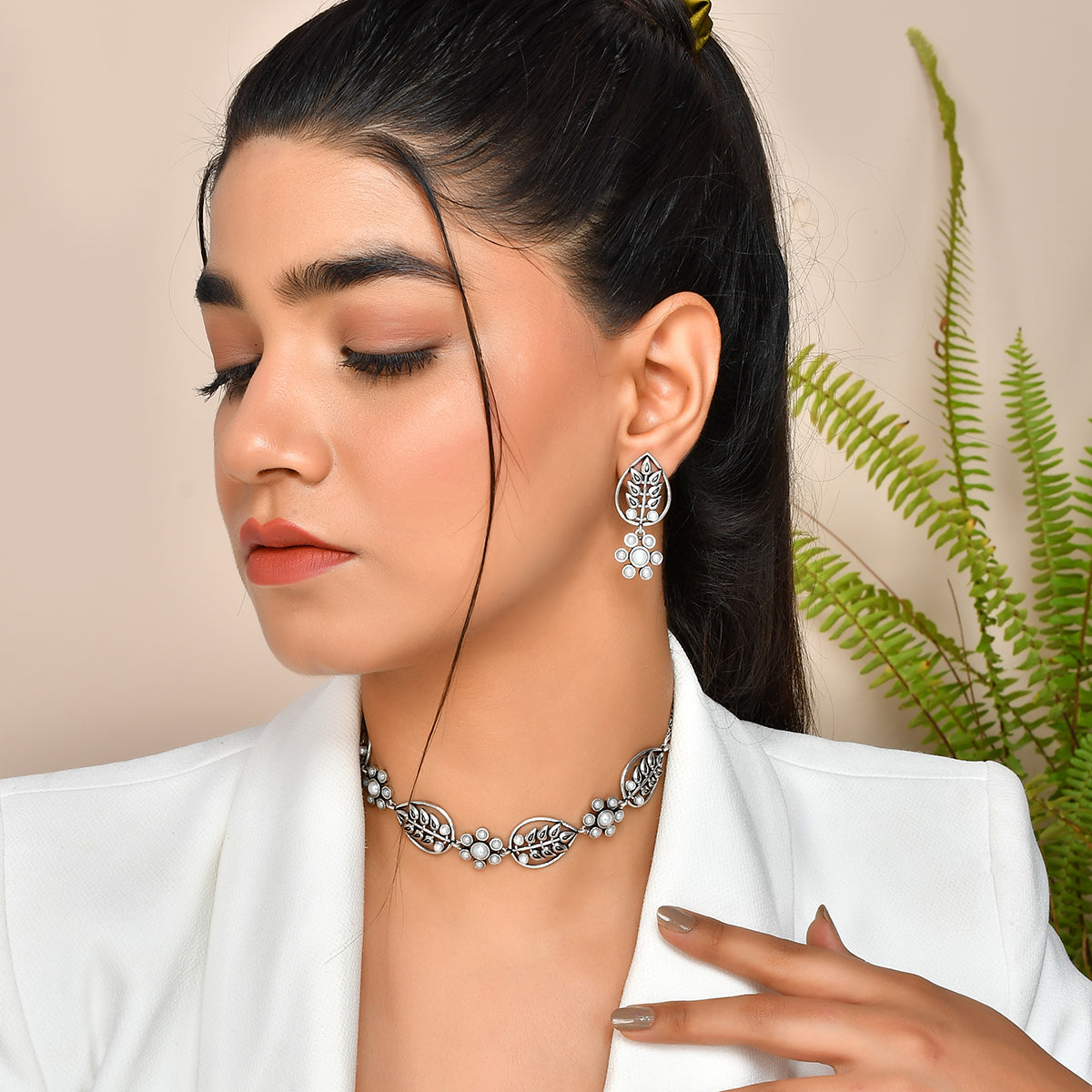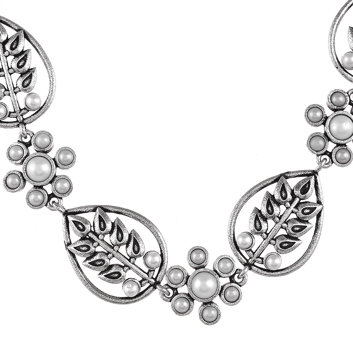 Inspired by the lovely fern leaf, which is a symbol of resilience, this jewellery set has been fashioned out of high quality brass. Adorned with white pearls in a classic floral pattern, the oxidized silver plated set is versatile, lightweight and comfortable.