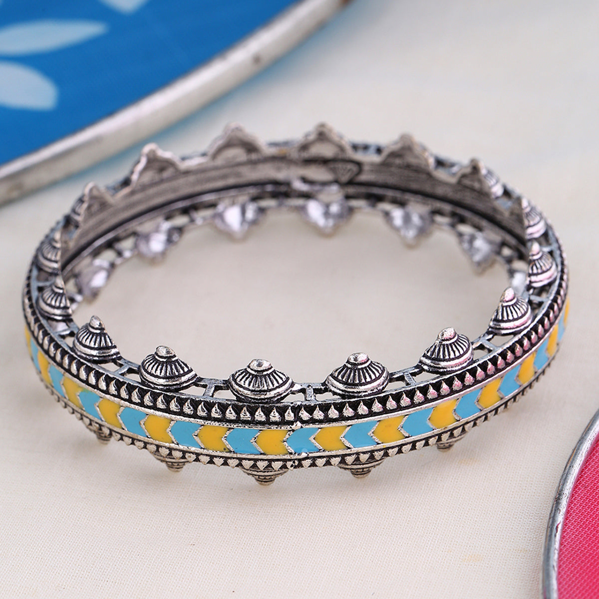 Domes motifs bracelet inspired by the architecture and motifs of the fort of Gwalior. Enameled and oxidised silver plated, the bracelet has been fashioned out of brass and will look splendid when paired with Indo-Western attire.