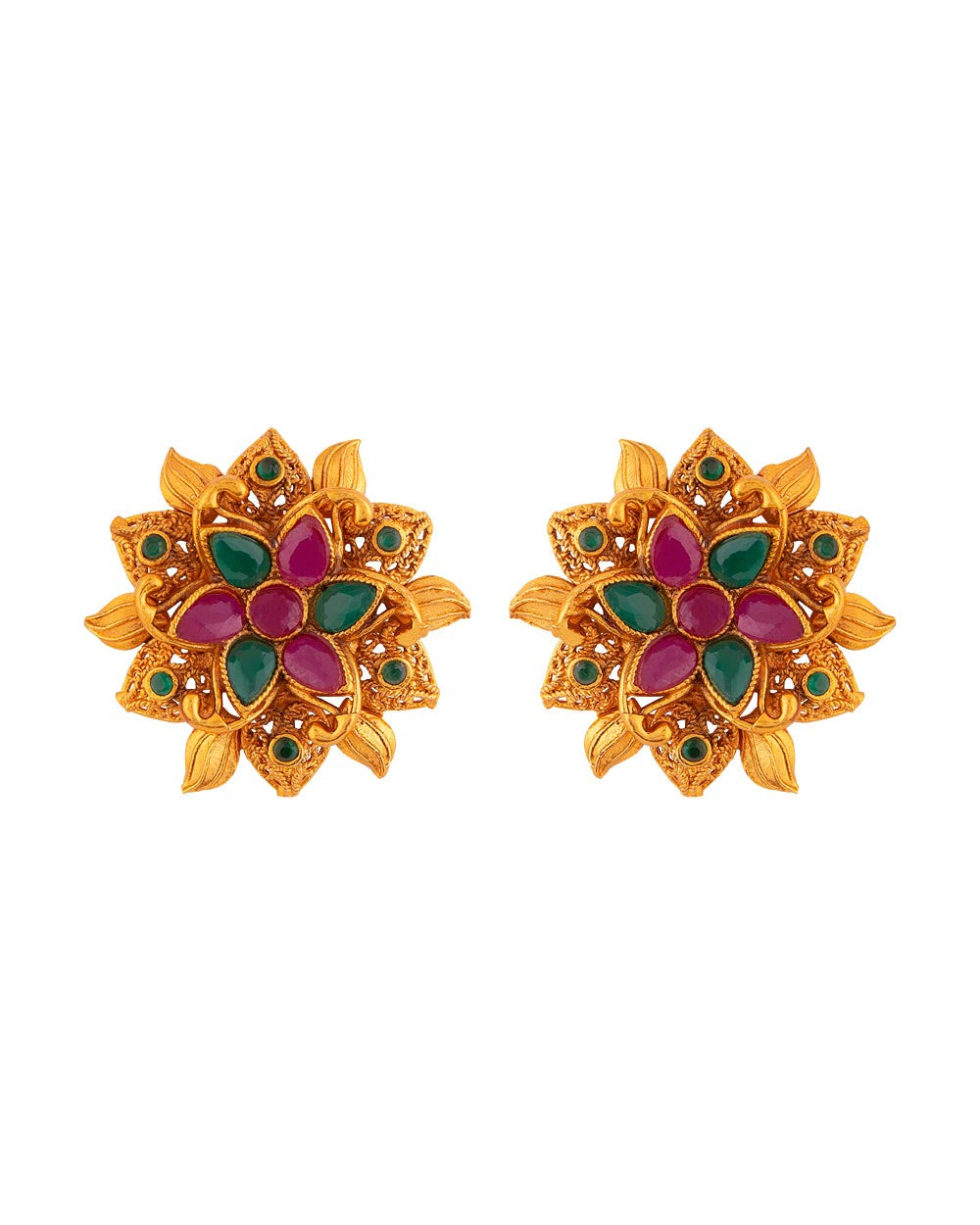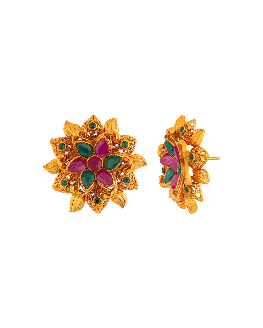 Floral motif stud earrings with gem embellishments. Made from brass and copper plated. Pair with Indian looks. This piece of jewelry comes with the Voylla assurance of quality and durability.