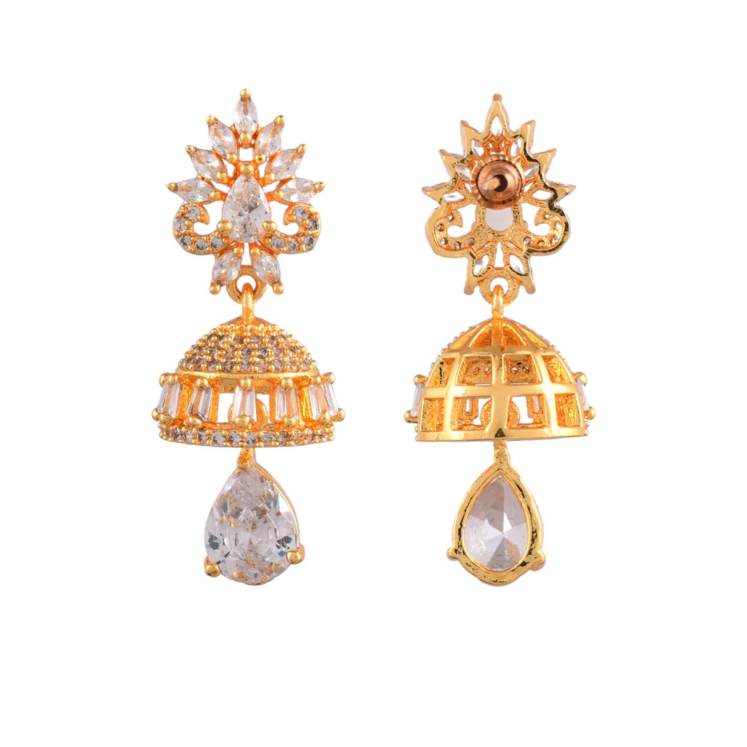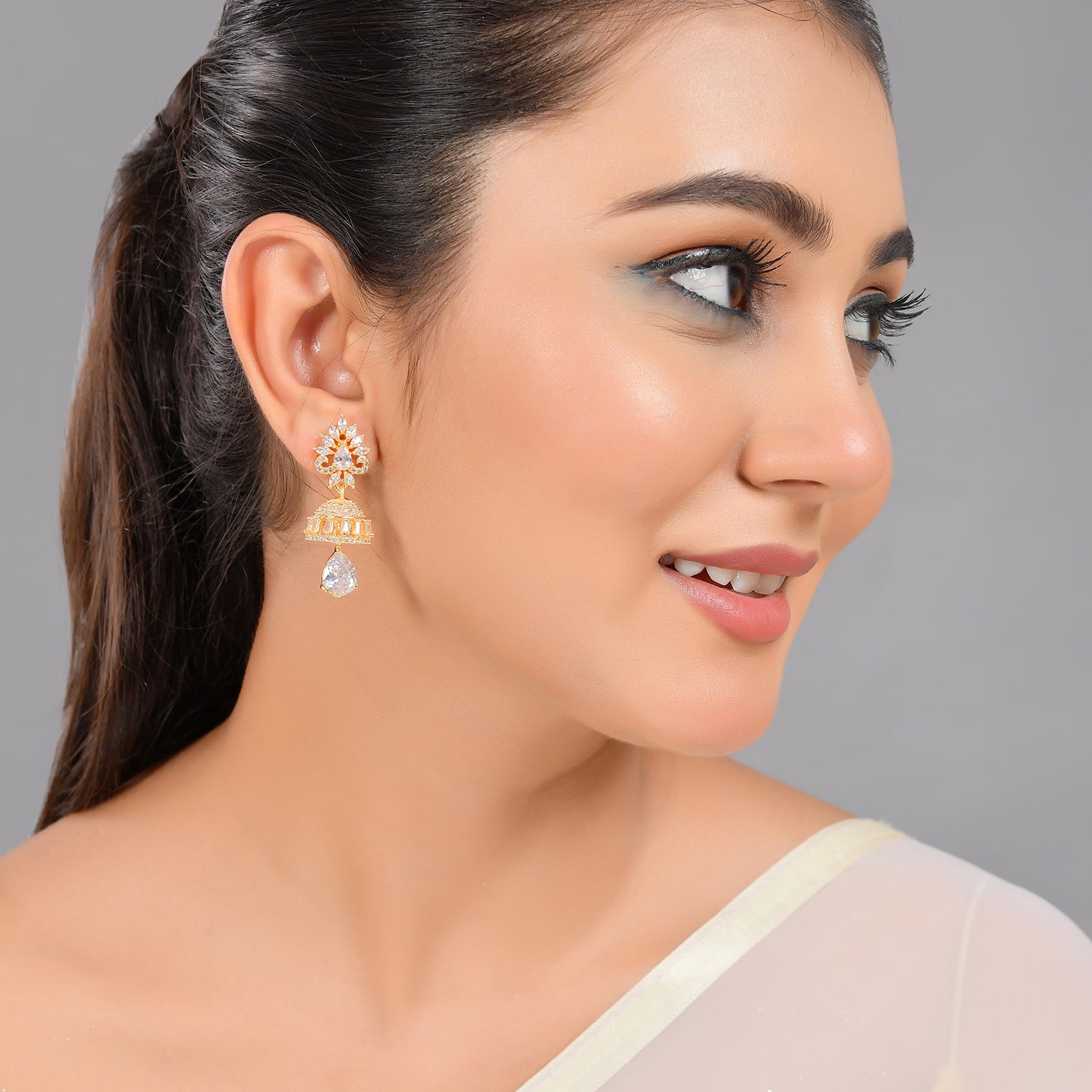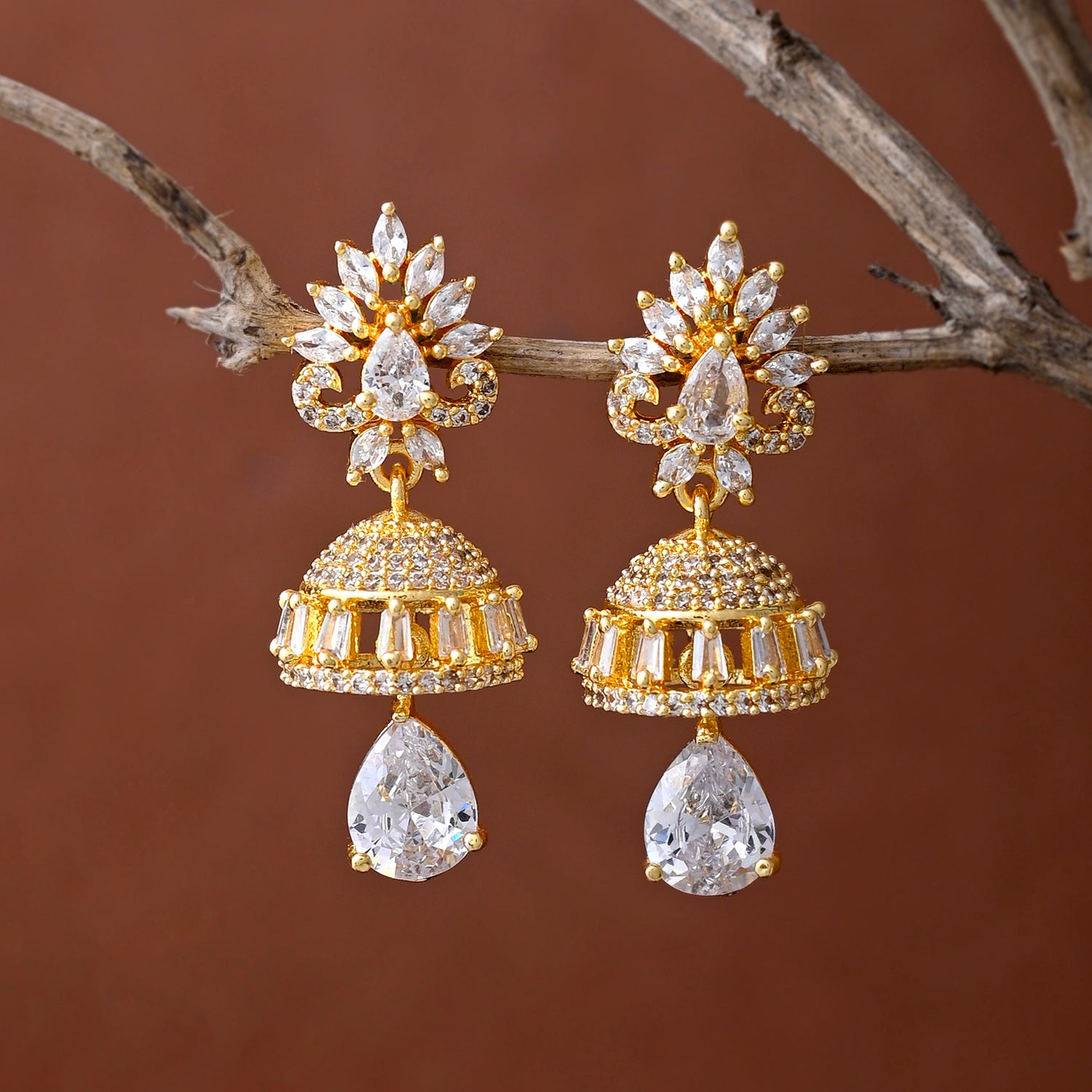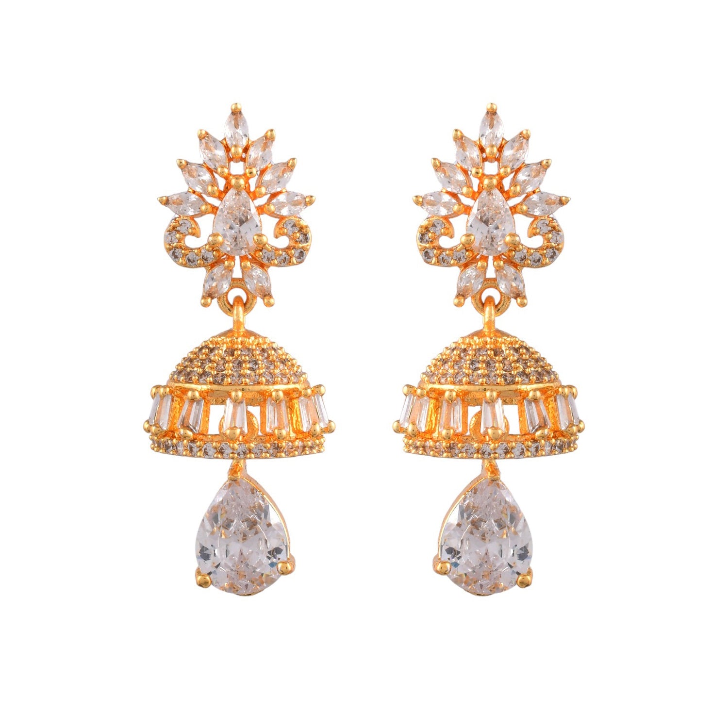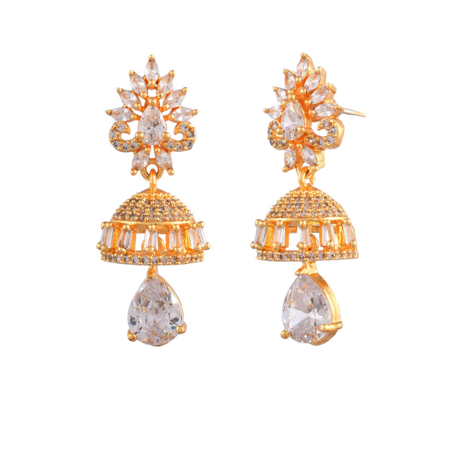 Sparkly drop earrings, perfect for casual wear. Made from brass and gold plated, the pair has been embellished with white CZ gemstones. Versatile and comfortable.