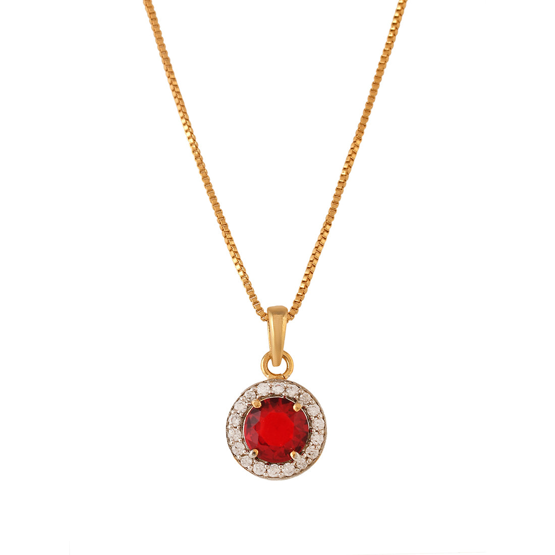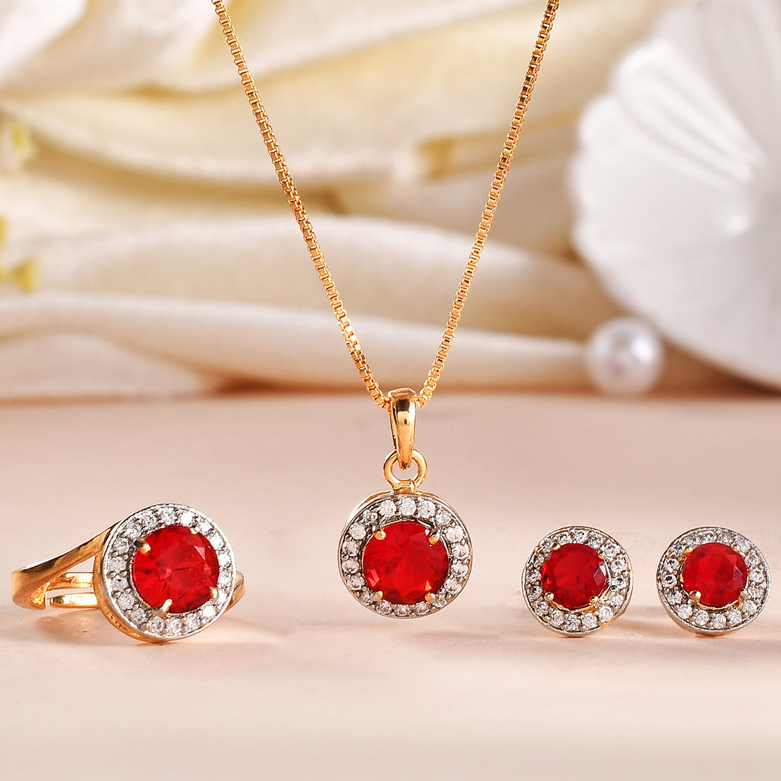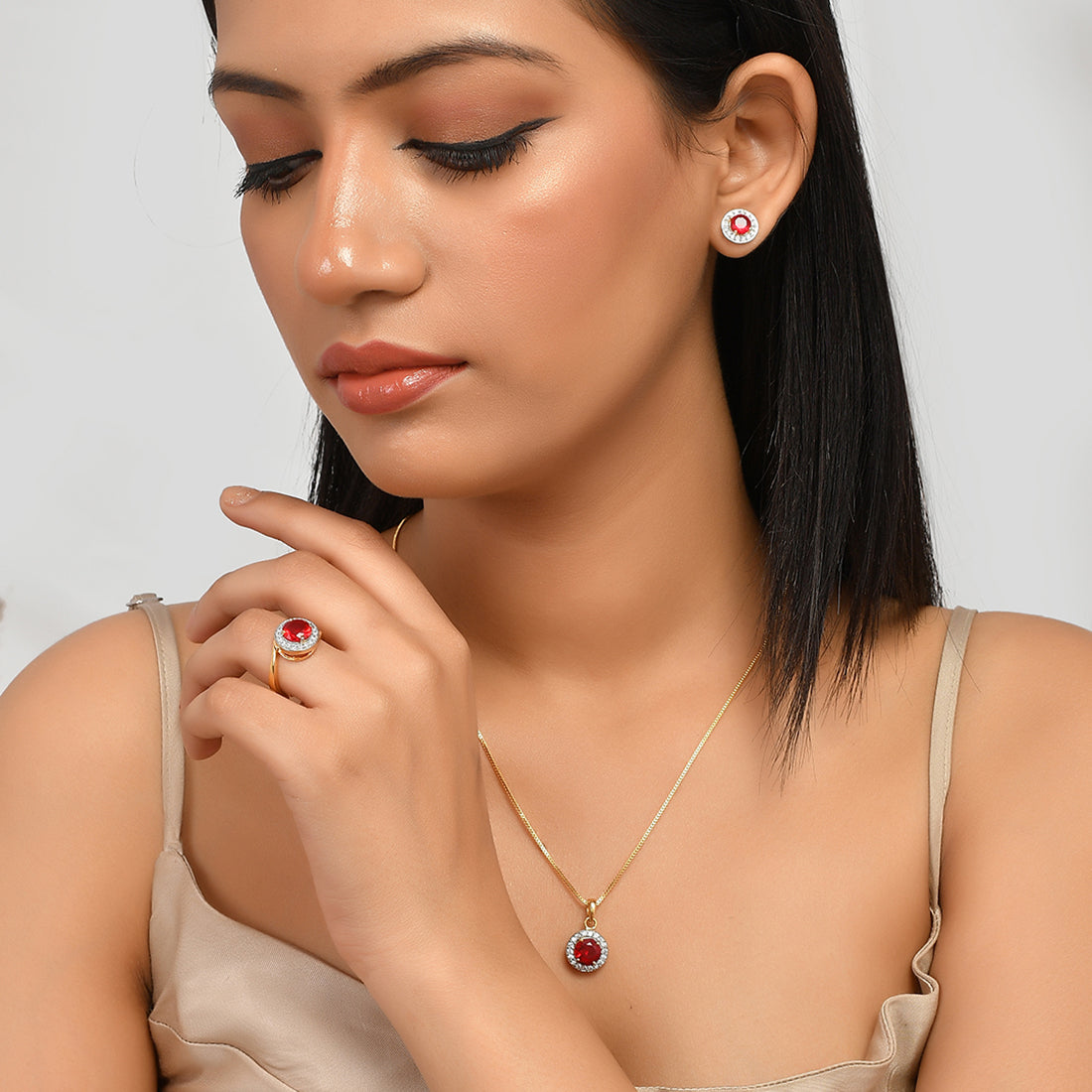 An alluring brass box set with two tone plating. The pendant with Chain, earrings and ring have been embellished with red, round cut CZ gems in a classic cluster setting. Pair with just about anything.