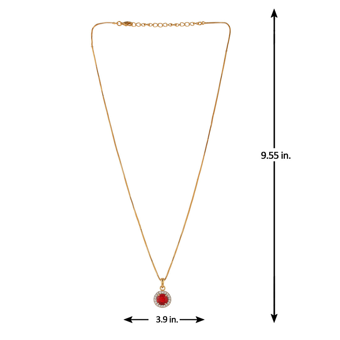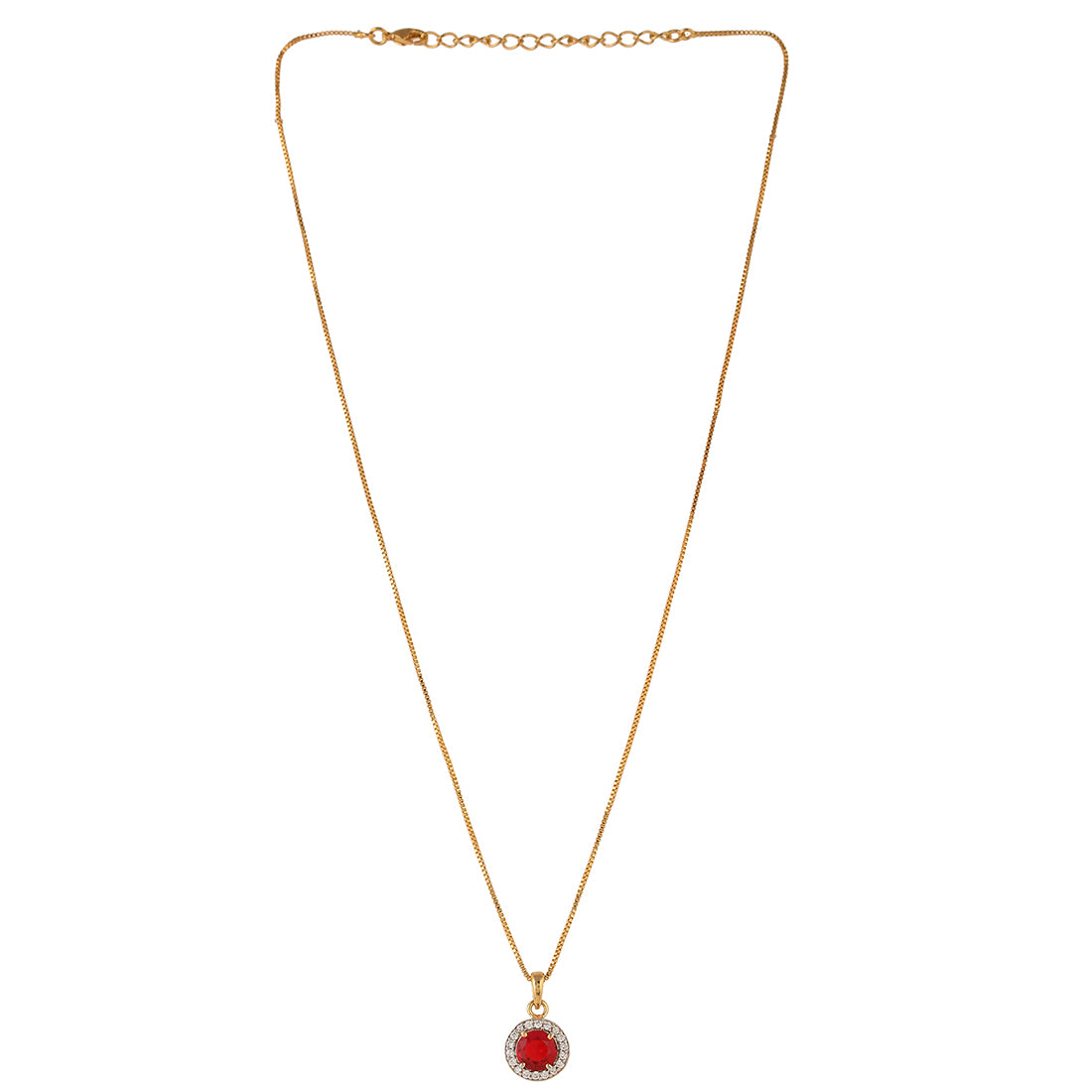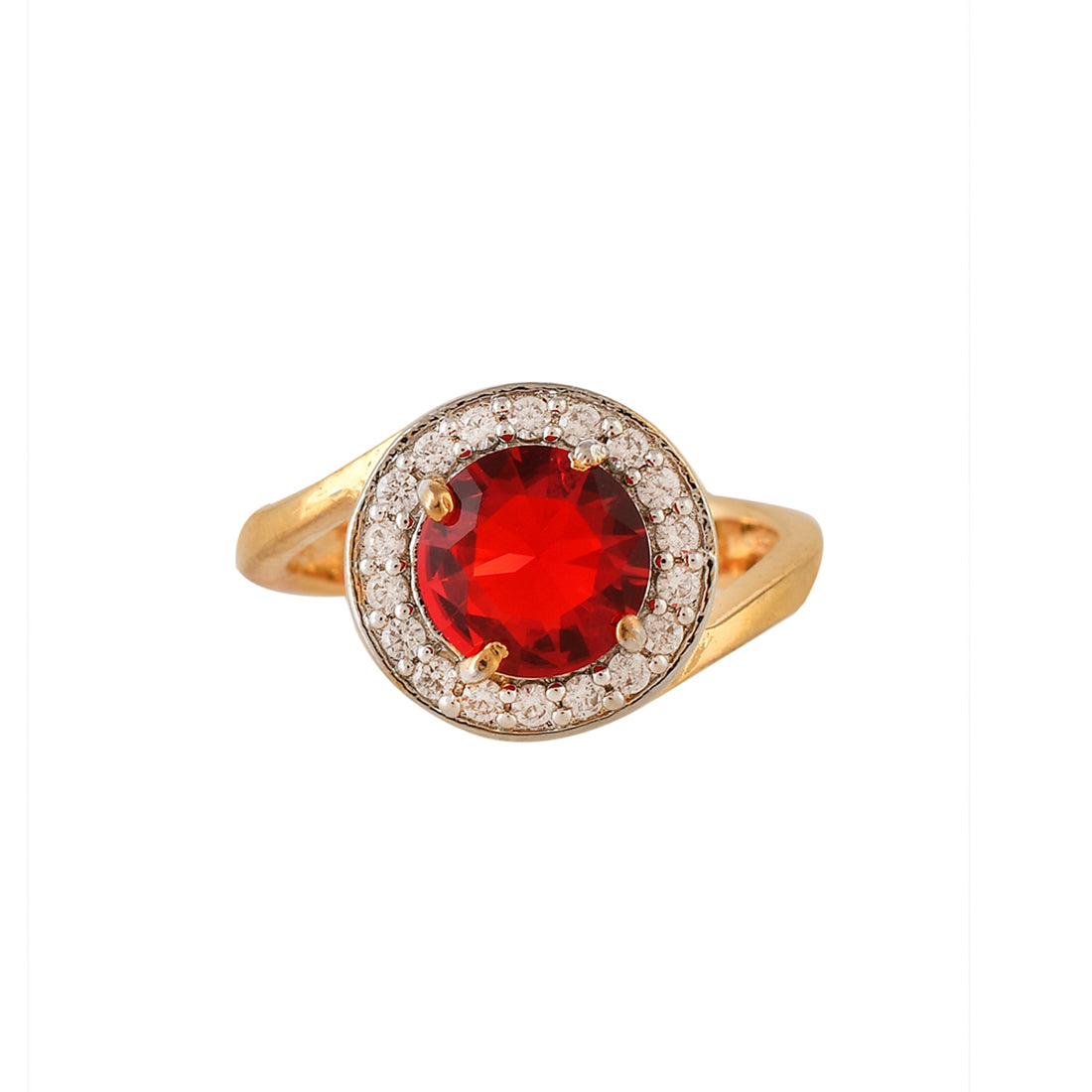 An alluring brass box set with two tone plating. The pendant with Chain, earrings and ring have been embellished with red, round cut CZ gems in a classic cluster setting. Pair with just about anything.