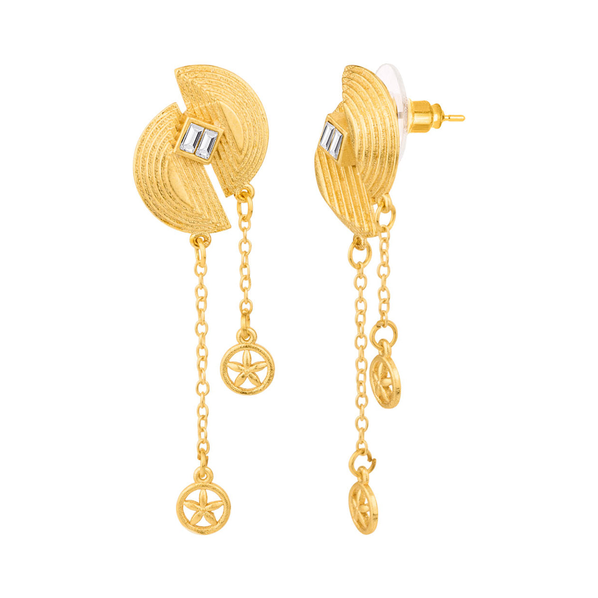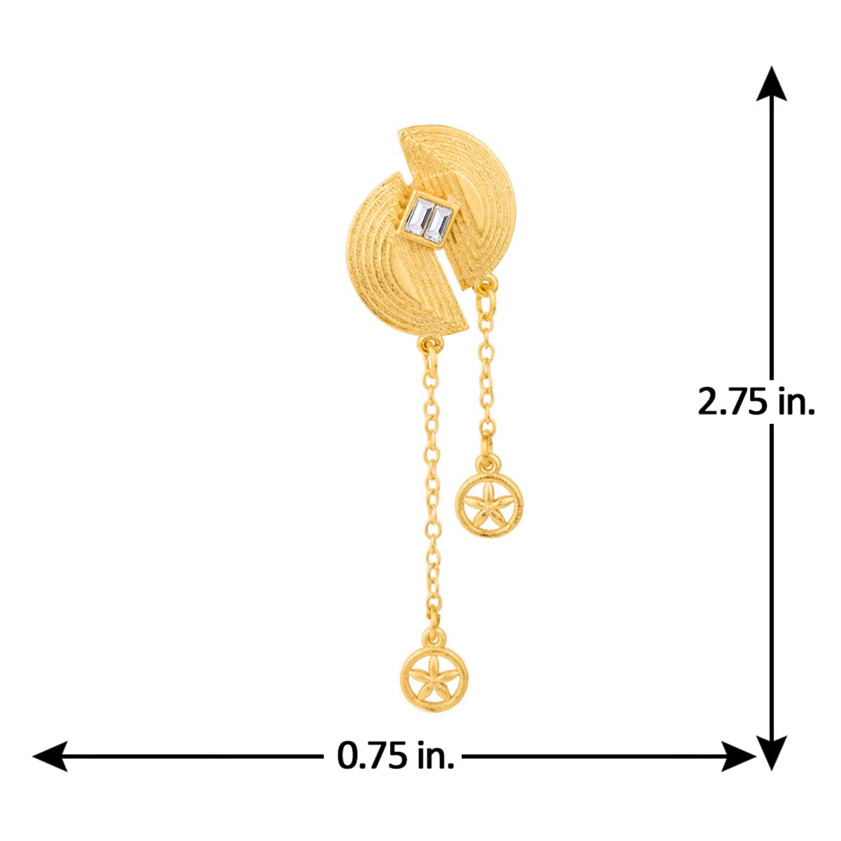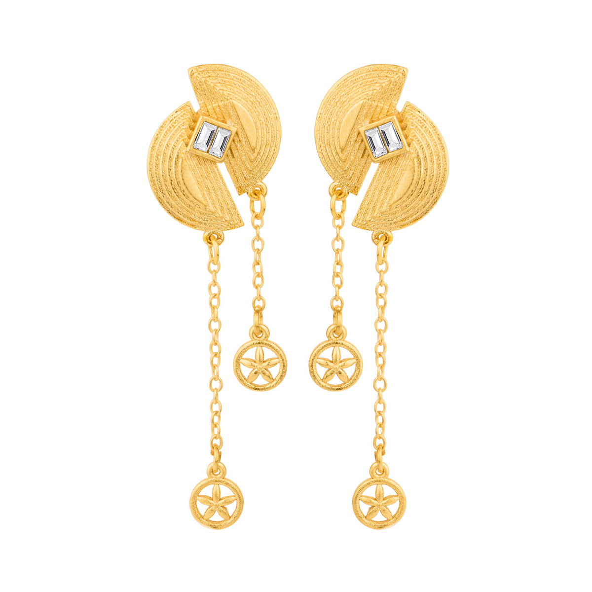 Look chic and stylish in these brass White n Gold Stars Geomatrix earrings. Wear with a formal outfit for that night occasion. This piece of jewelry comes with the Voylla assurance of quality and durability.