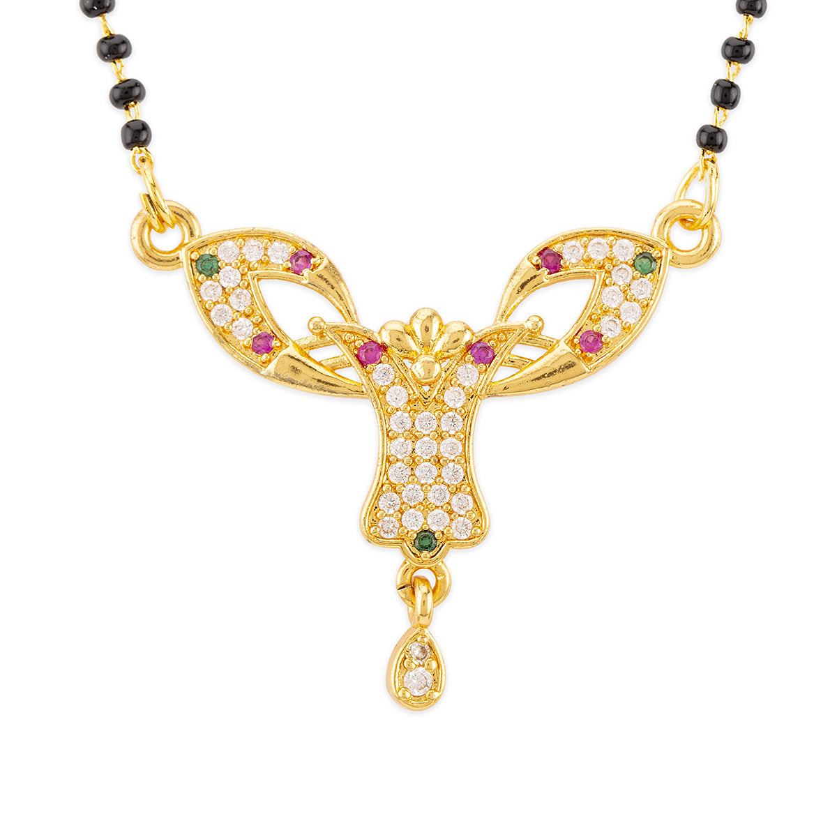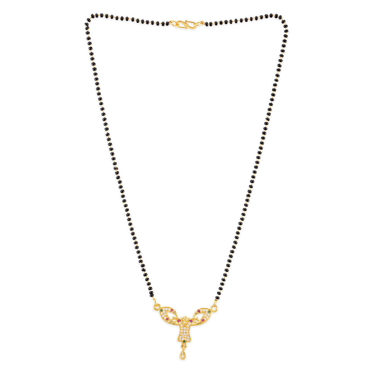 If you want to stay chic, then you cannot go wrong with this brass managlsutra. It has been given a die gold finish with the embellishment of glittery American Diamond stones. It goes well with both Indian and Western outfits.