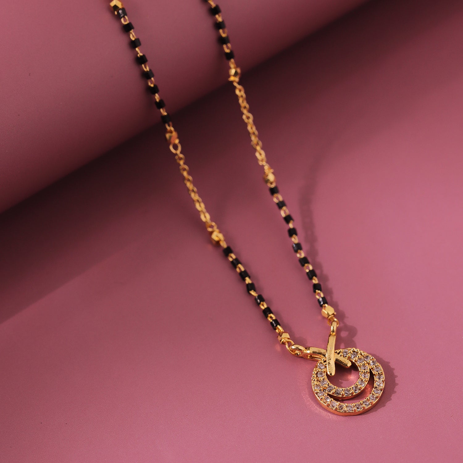 The Gold Essentials Bond of Love American Diamond Mangalsutra is a timeless symbol of love and togetherness, crafted to bring out both tradition and contemporary elegance. Part of the Gold Essentials Collection, this piece is made with premium brass and plated in radiant gold, ensuring durability and long-lasting brilliance. The pendant design features two interlocking circular motifs, each studded with sparkling American Diamonds. These intertwined circles represent eternal bonds, unity, and the strength of relationships. The sleek black-beaded chain maintains the cultural essence of a traditional mangalsutra, while the modern pendant design gives it the flair of a designer mangalsutra perfect for today’s woman. Whether paired with sarees for weddings, kurtis for daily elegance, or office wear for professional charm, this pendant mangalsutra fits every moment seamlessly. It also makes a heartfelt gift for wife, anniversary gift, Valentine’s Day gift, or wedding gift, ensuring every occasion is remembered with love.