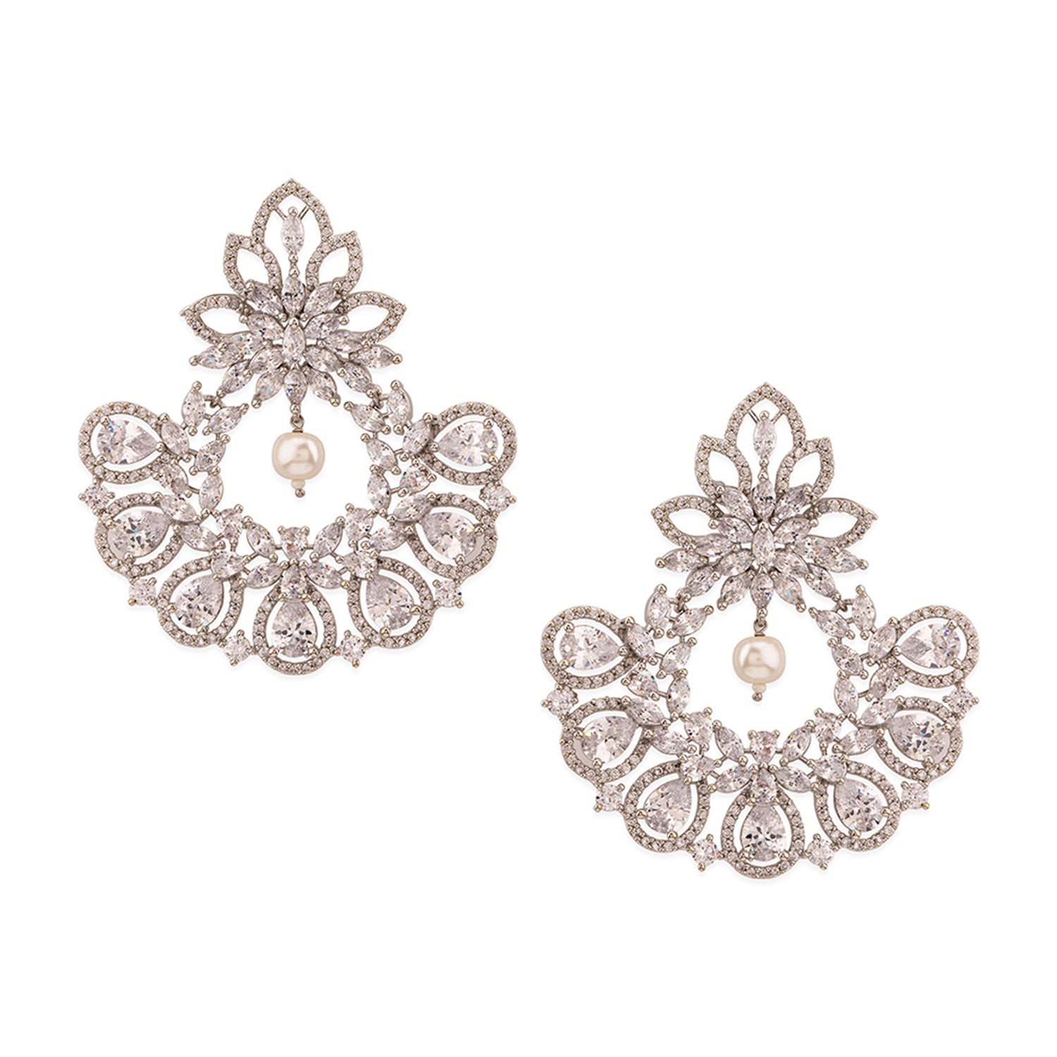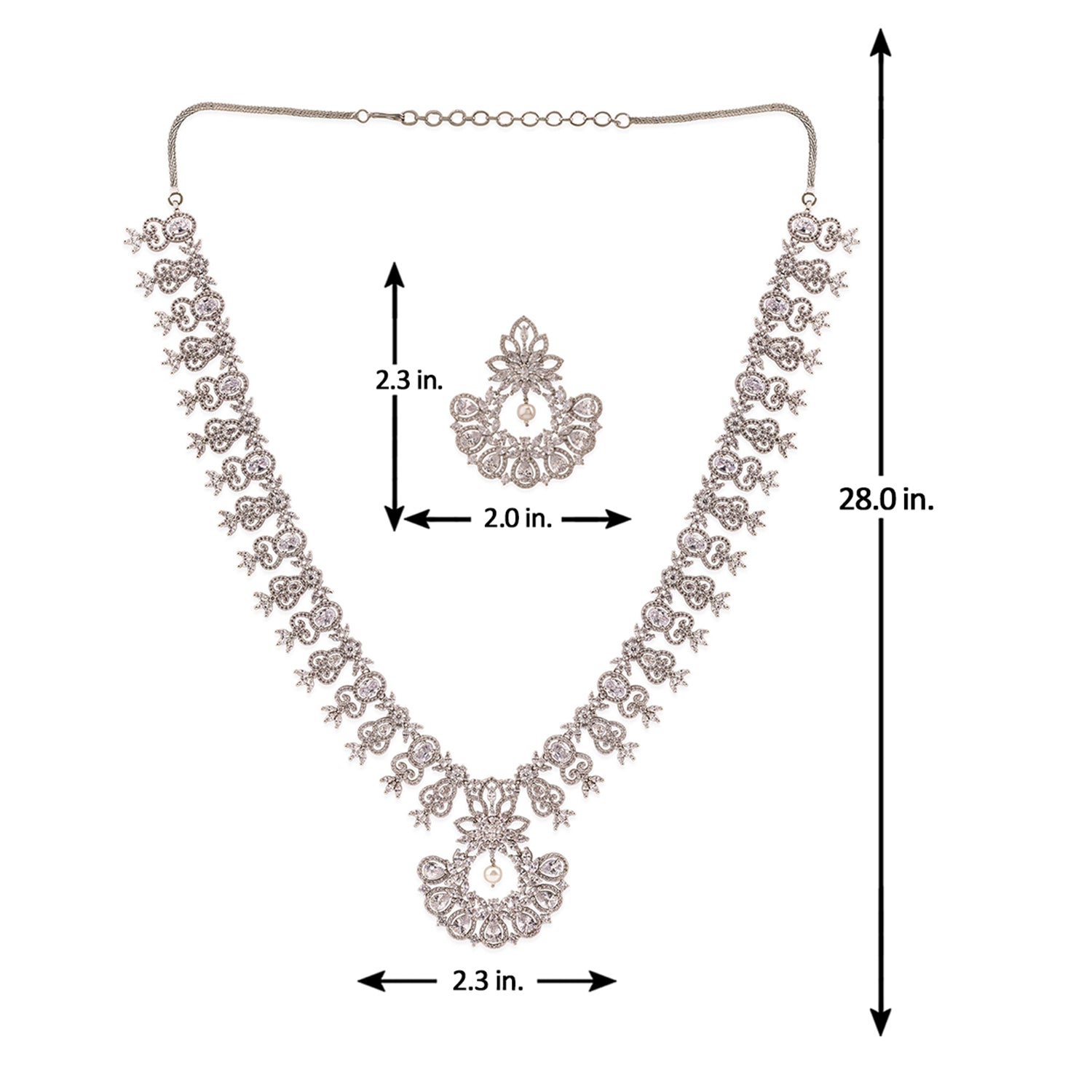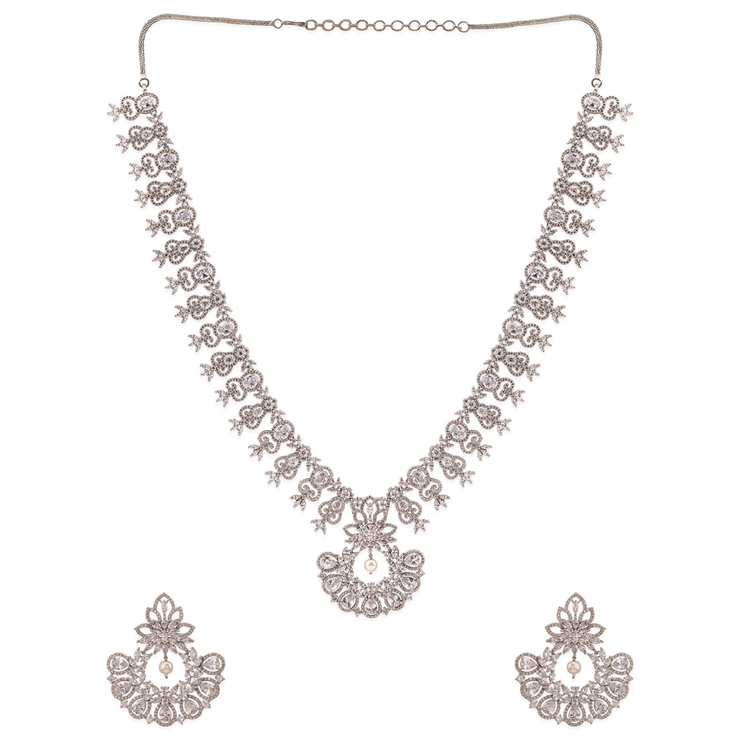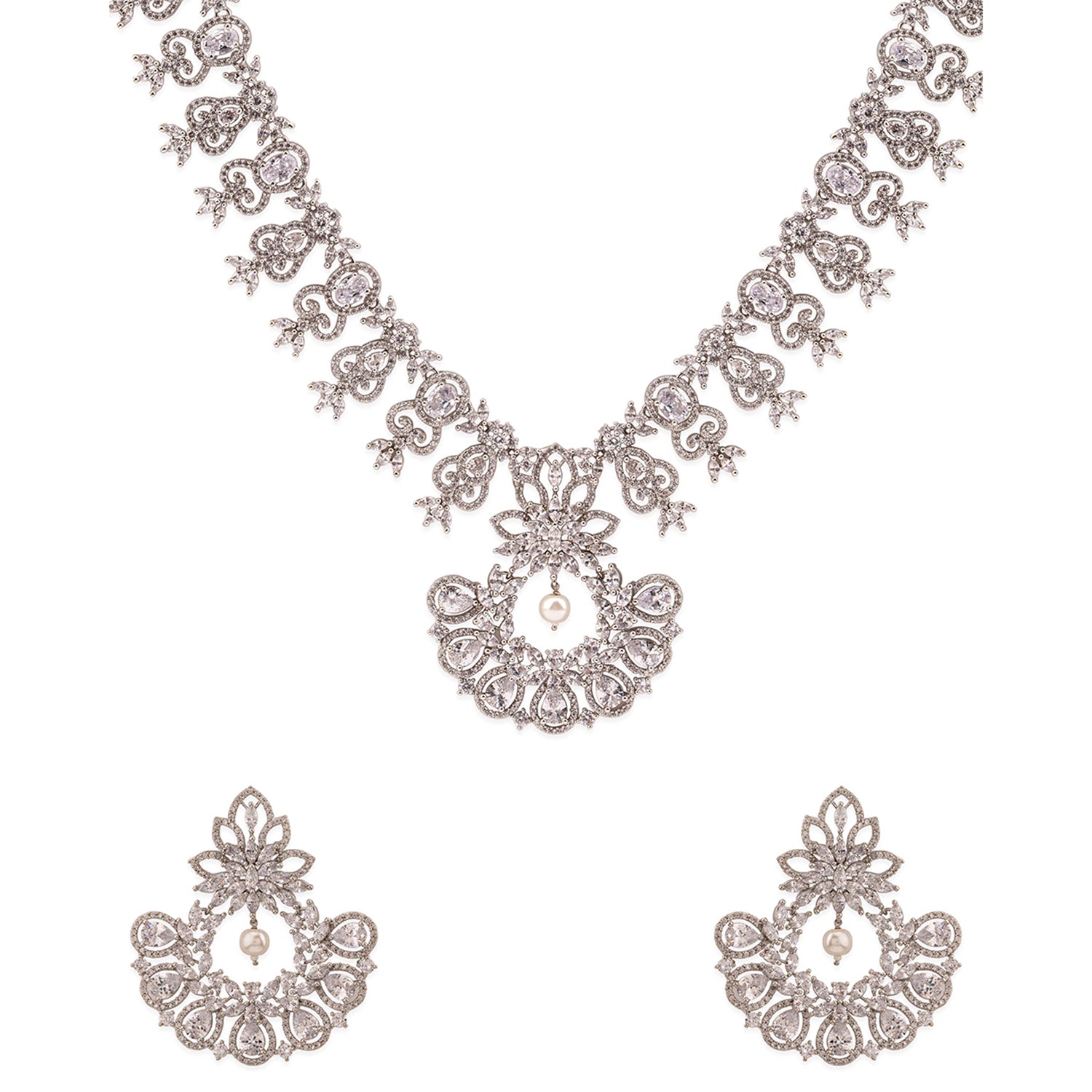 This necklace set is epitomes royalty. The setting of American Diamond stones in a smooth white rhodium polished brass base makes this set a total catch. Perfect for western as well as Indian dresses for classy formal events.