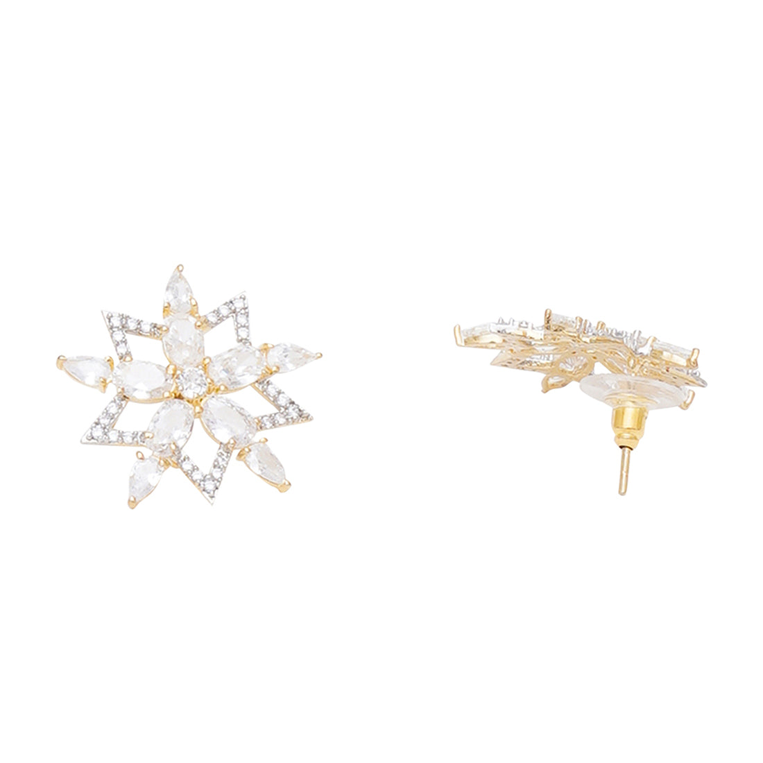 A beautiful mangalsutra chain and stud earrings in a dainty design set that can easily be a part of your daily wear. The set has white sparkling Cubic Zirconia stones in a gold plating metal base that eludes a sophisticated look.