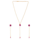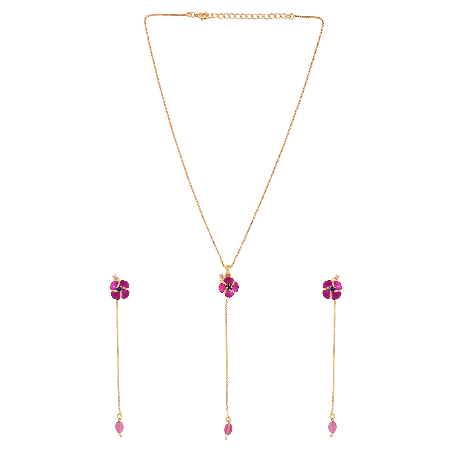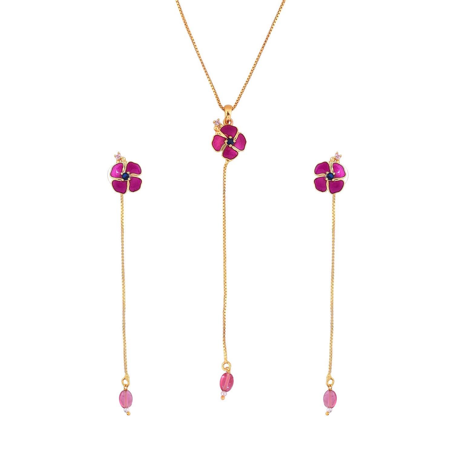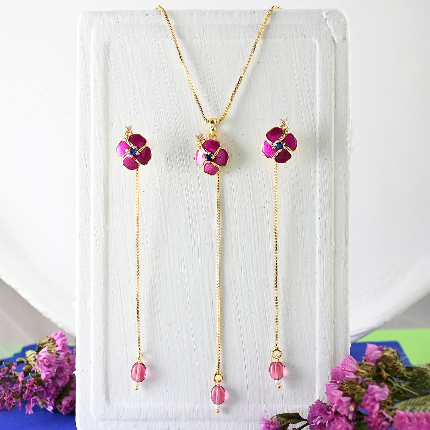 Embrace elegance with our Magenta Bloom Pendant Set. Crafted from brass with a radiant gold plating, this set features delicate floral designs in captivating magenta, adorned with layered drop pearls. Elevate your style with a touch of natural beauty and sophistication!