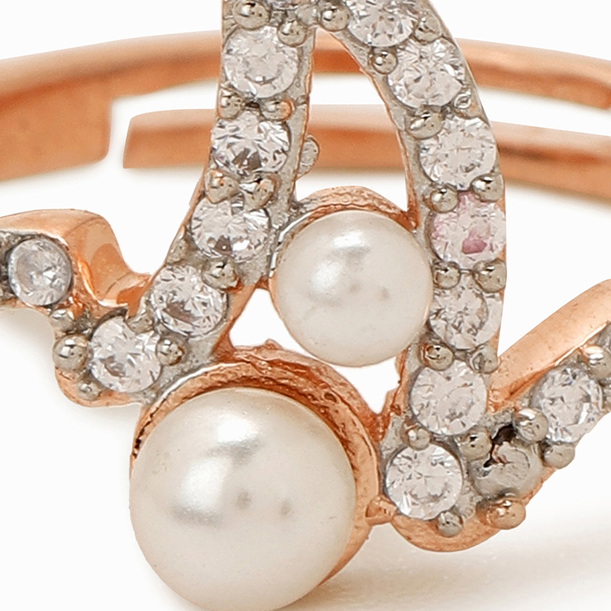 The joy of wearing the best is unbeatable. This V-shaped Diamond studded ring gives a magnificent look. The flawless pearl on top gives it a chic look making it the best fit for every occasion.Weight (Gms): 3.22Size (LxW)(Inch): 0.6*0.3Material: BrassPlating:...