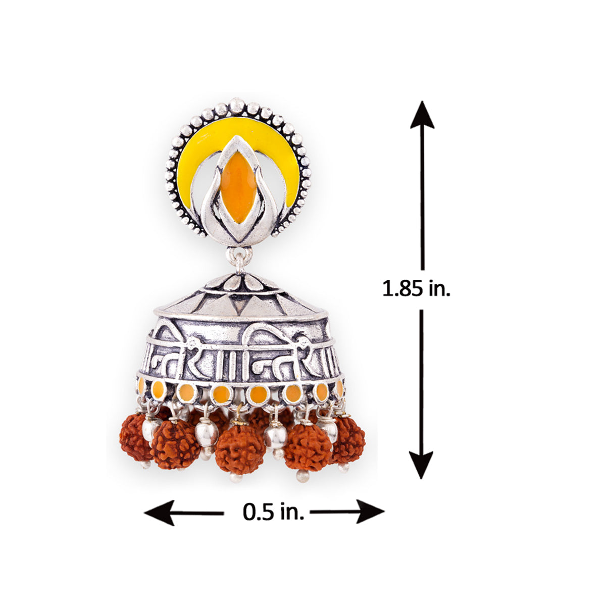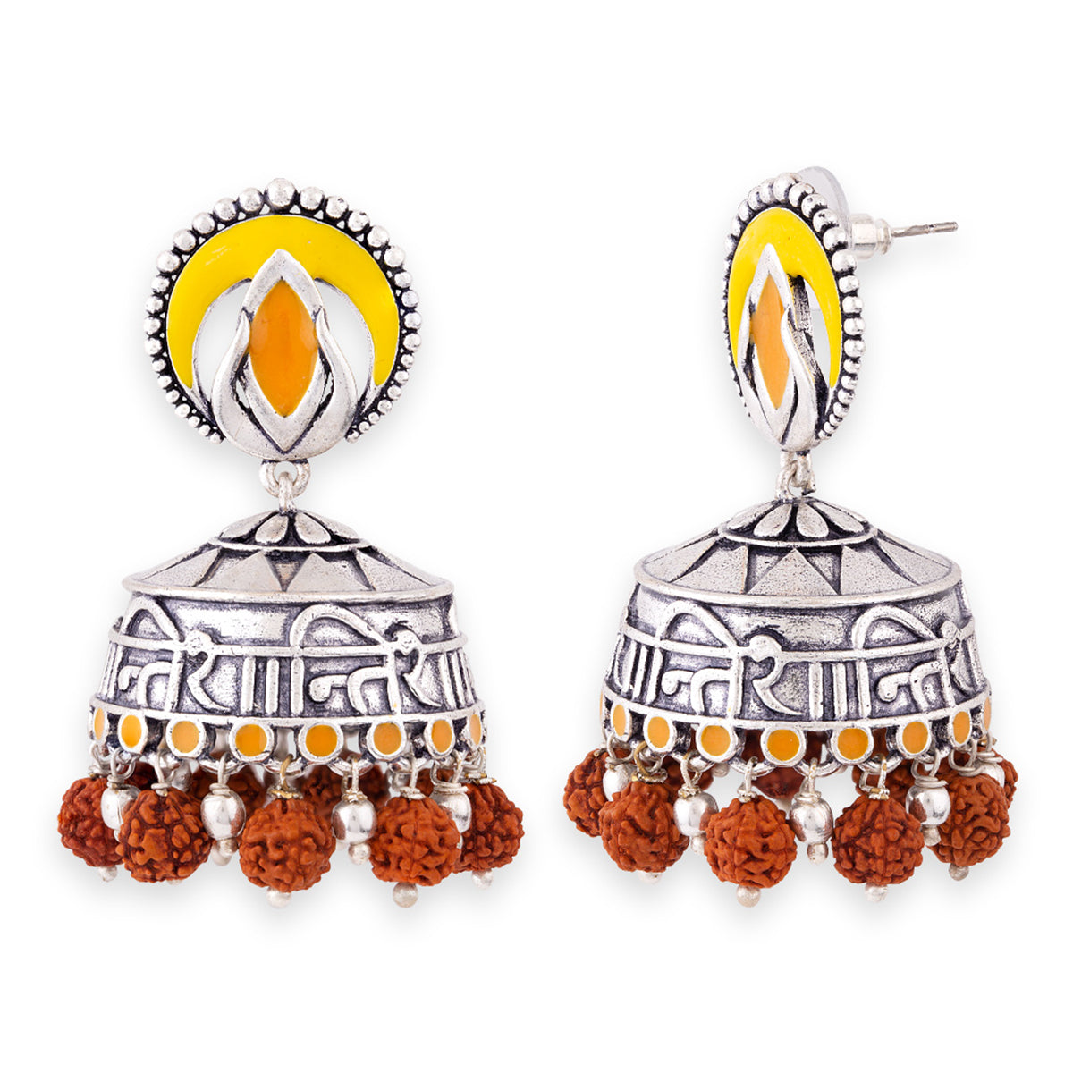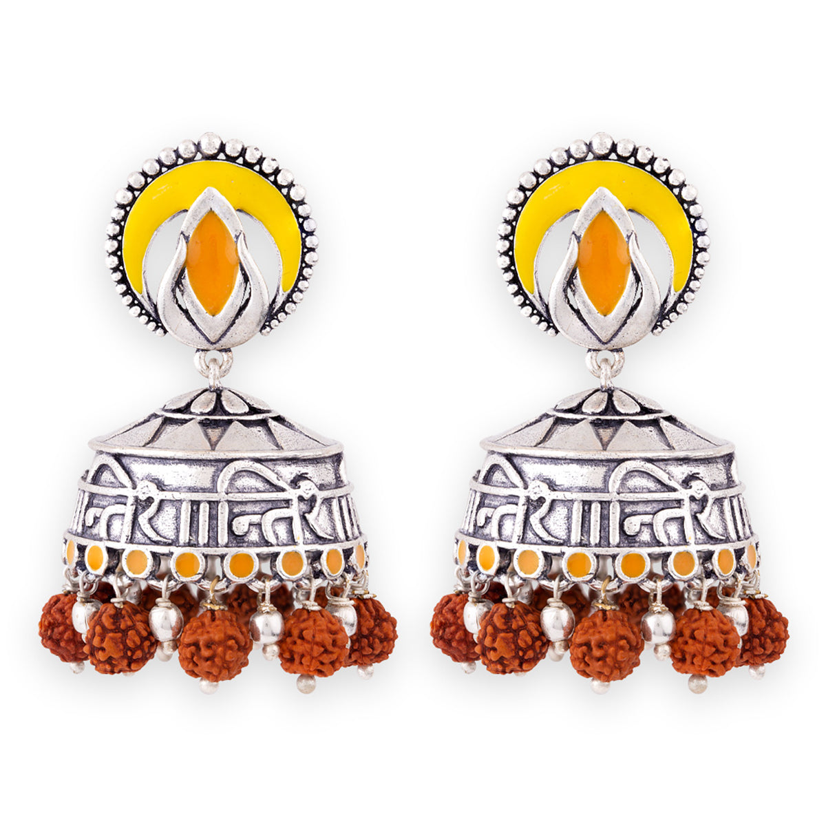Inspired by the Yogic concepts of oneness with the universe and self exploration, these jhumka style earrings have been fashioned out of brass. Oxidised plated and enamelled, these lightly embellished jhumkas will look splendid when paired with a jeans and kurta attire.