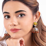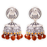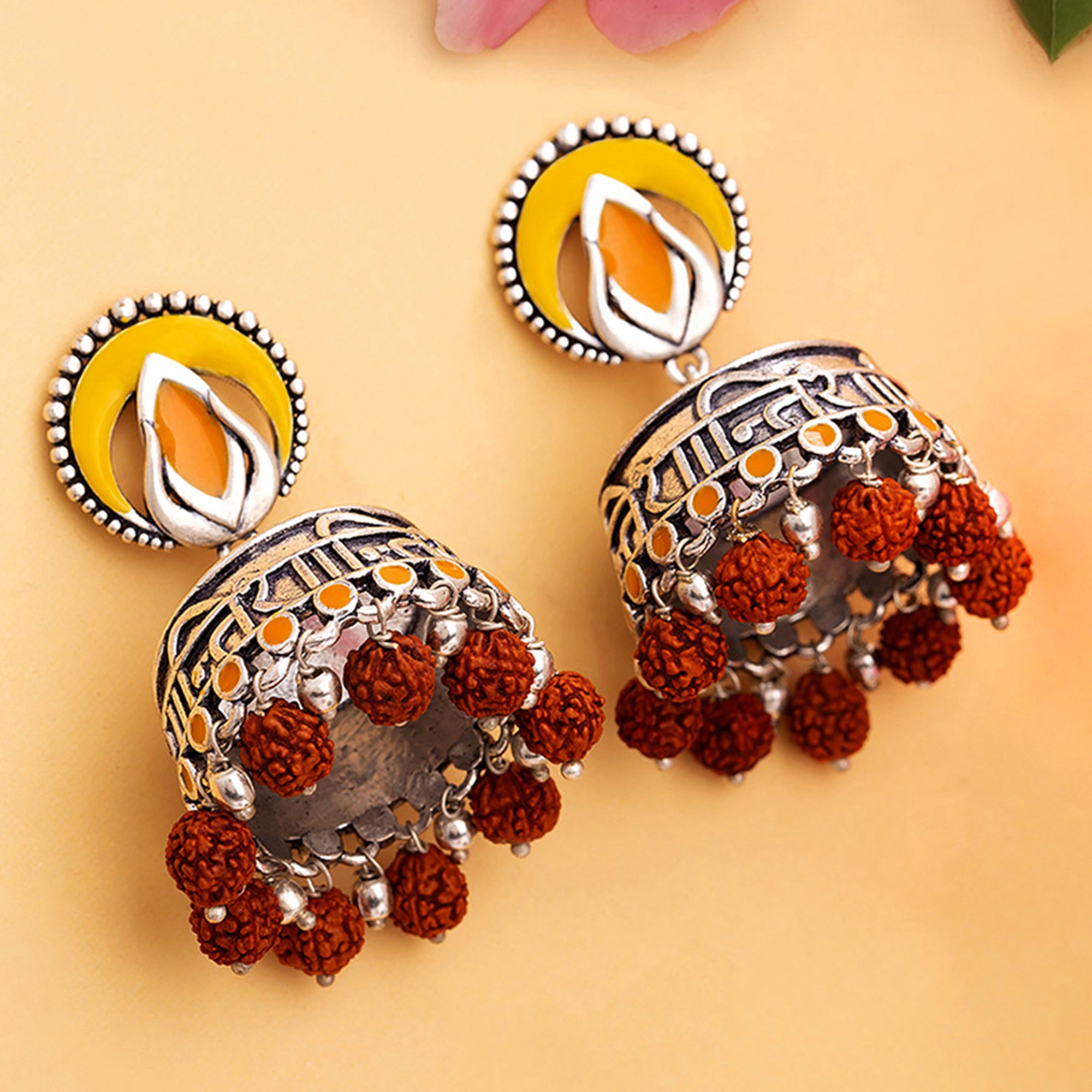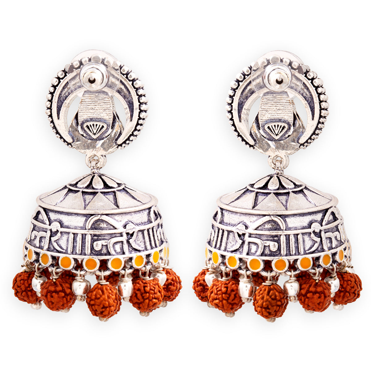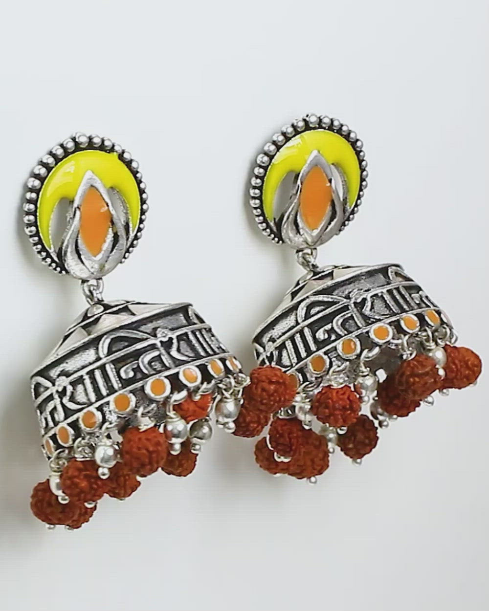 Inspired by the Yogic concepts of oneness with the universe and self exploration, these jhumka style earrings have been fashioned out of brass. Oxidised plated and enamelled, these lightly embellished jhumkas will look splendid when paired with a jeans and kurta attire.