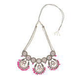 Bohemian style jewellery set features a classic cutwork design that adds to its allure. Heavily embellished and perfect for your festive look, the necklace and drop earrings have been given an oxidised plating that adds to their rustic charm. Pair...