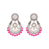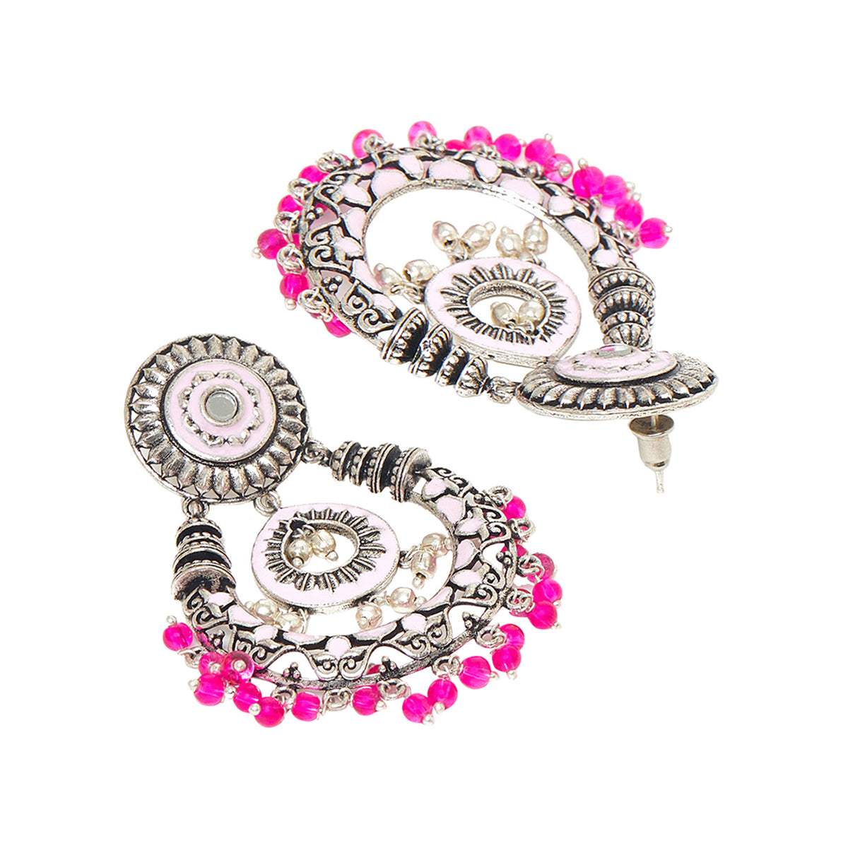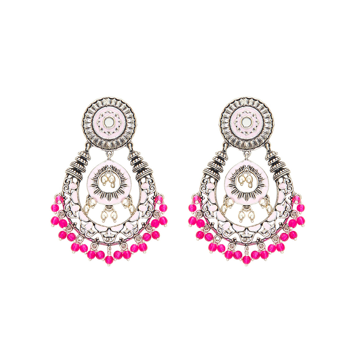 Bohemian style jewellery set features a classic cutwork design that adds to its allure. Heavily embellished and perfect for your festive look, the necklace and drop earrings have been given an oxidised plating that adds to their rustic charm. Pair the set with an ethnic skirt and kurta outfit or even a cotton saree.