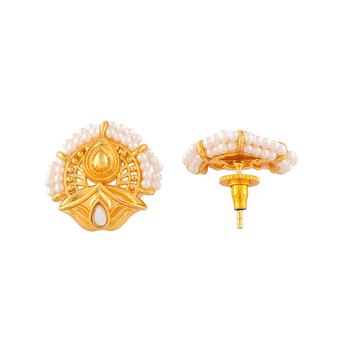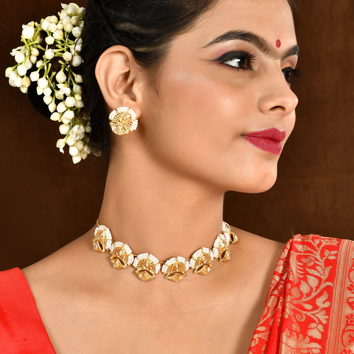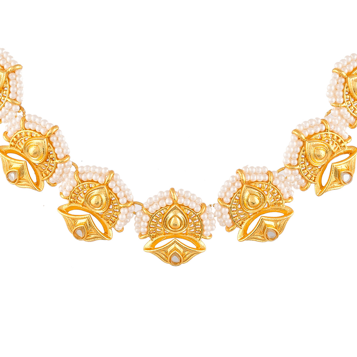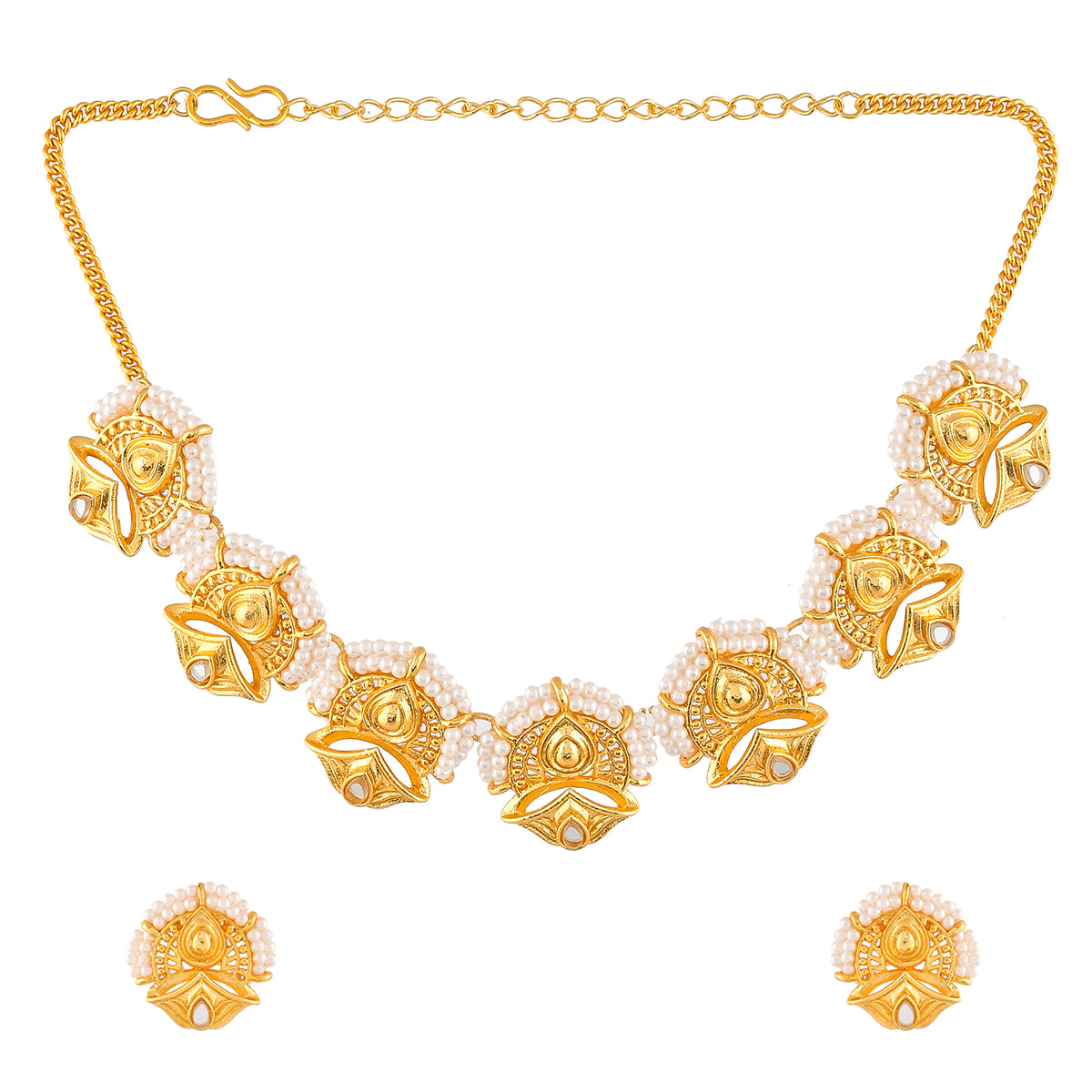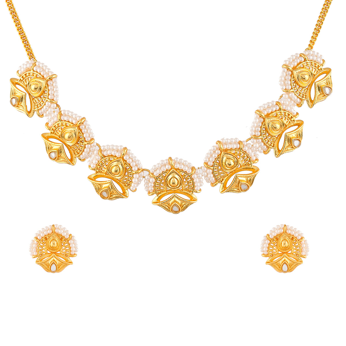 A luxurious choker jewellery set, inspired by the essence and beauty of traditional Indian festivals. Made from brass and yellow gold plated, each piece of this set has been heavily embellished with white pearl beads. Pair with ethnic attire.