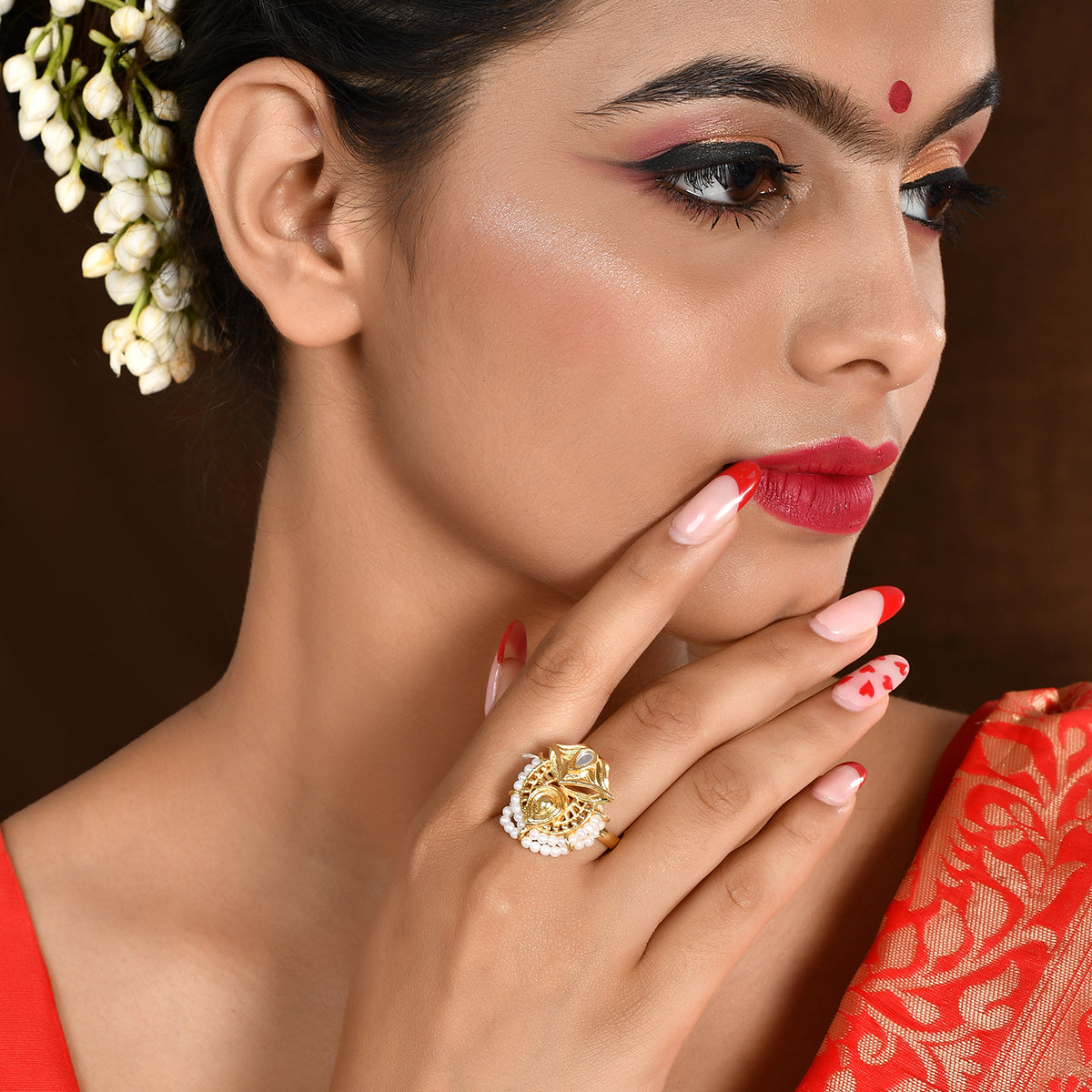 A beautiful yellow gold plated ring in a traditional design, inspired by the essence of Indian festivals. Embellished with white pearls and made from brass. A good match for ethnic looks.