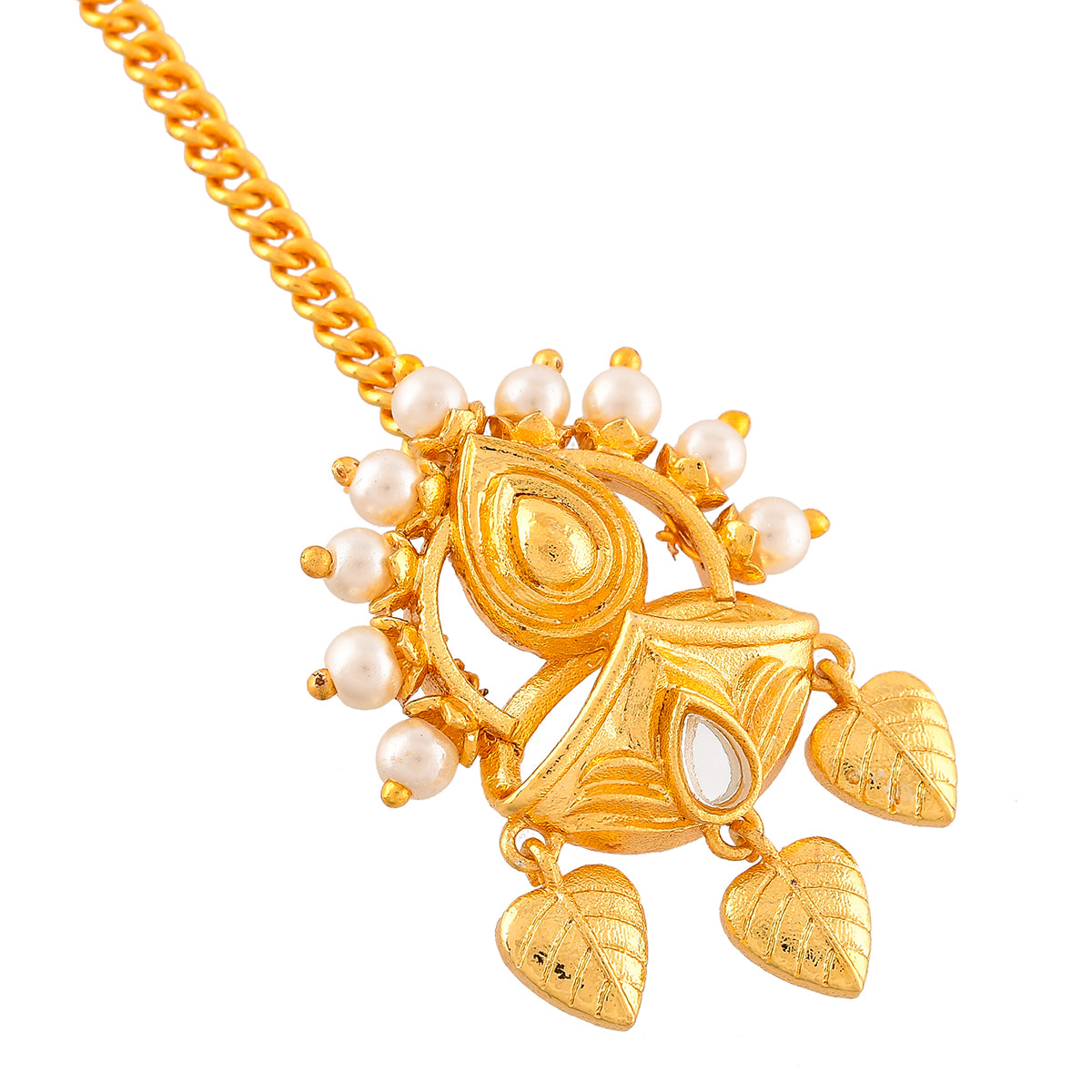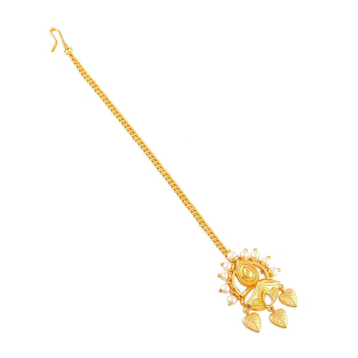 Featuring leaves motifs and white pearl beads, this brass maang tika has been inspired by the essence of Indian festivals. Yellow gold plated and a must have for this festive season.